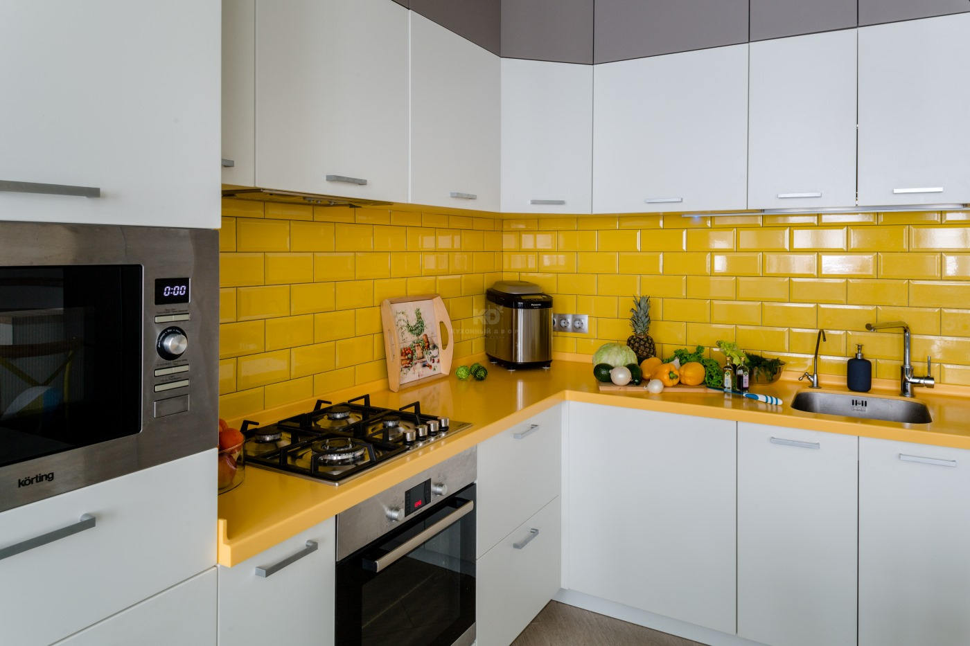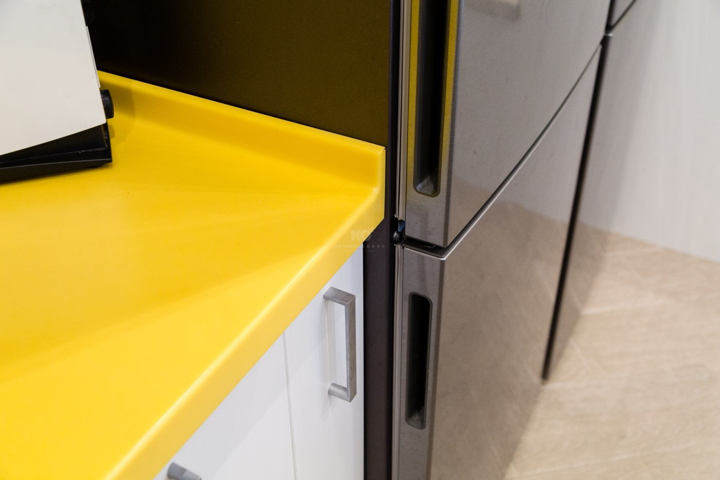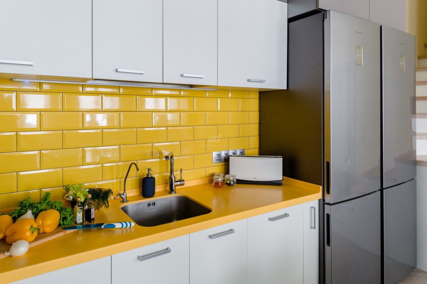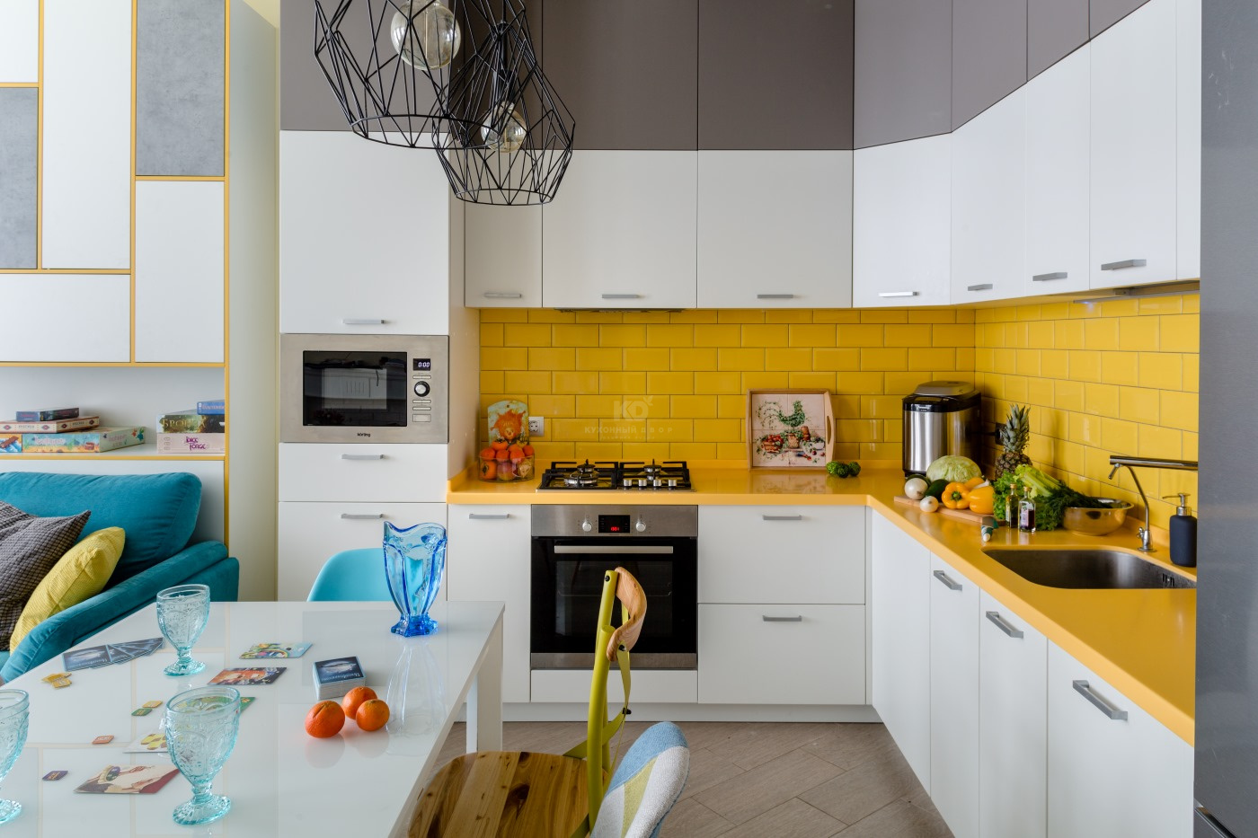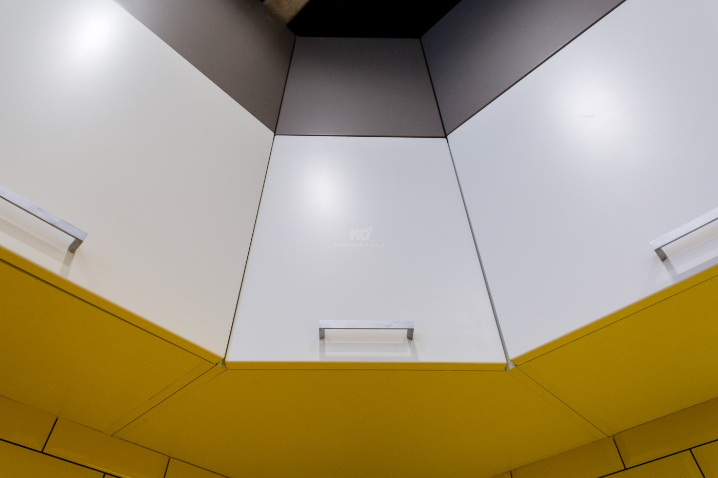 В основу дизайна всей мебели были положены светлые оттенки. Кухня в доме Юлии совмещена с гостиной, а значит, не должна была выбиться из этой концепции. Поэтому выбор хозяйки вполне обоснованно пал на гарнитур «Эмма». Фасады этой кухни, выполненные из MDF, мы окрасили в белый и серый цвета. В эту палитру органично вплелась ярко-желтая столешница и фартук. Такое решение «оживило» строгие пропорции, сделав рабочую зону привлекательной и уютной.