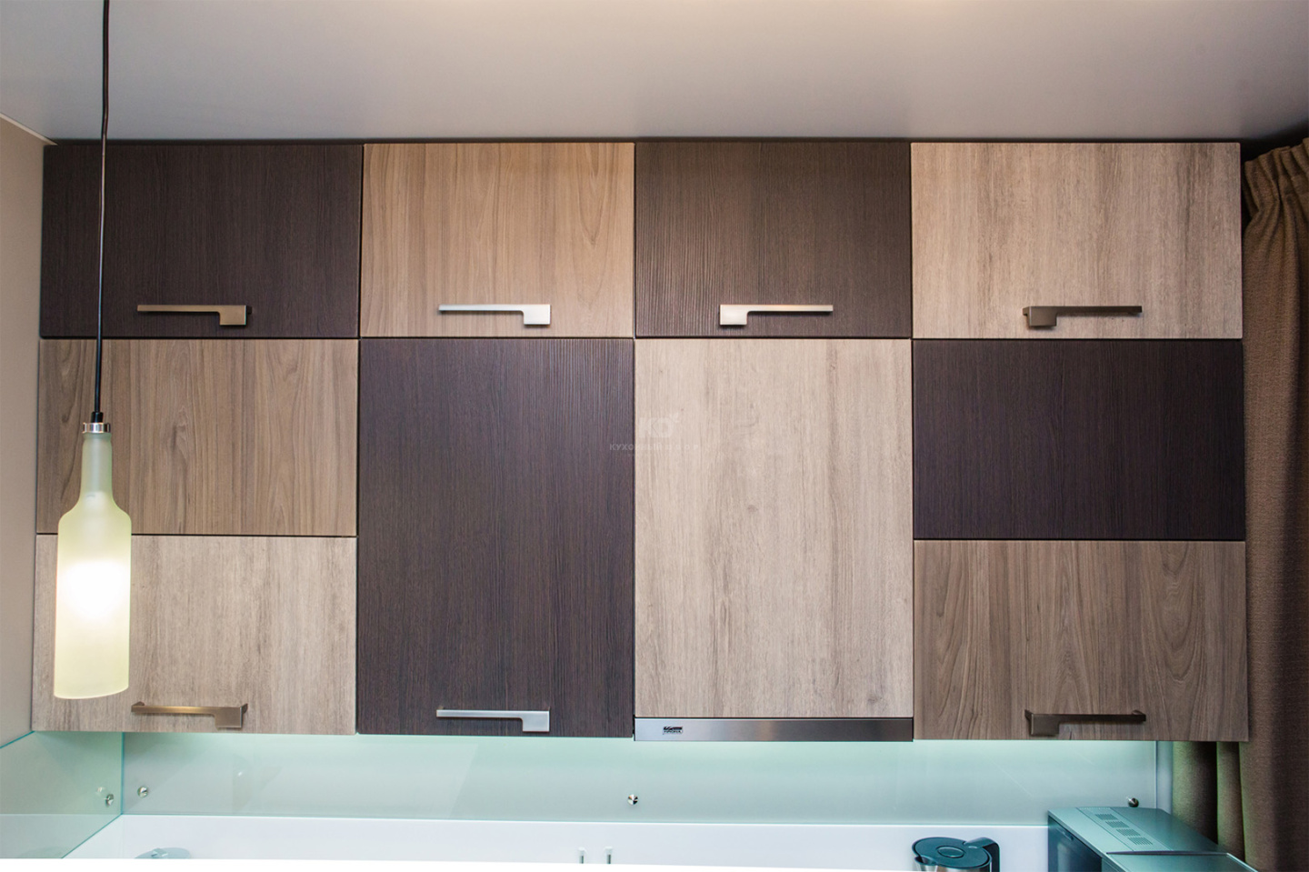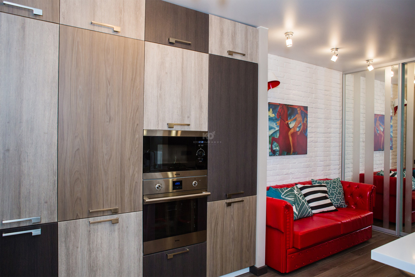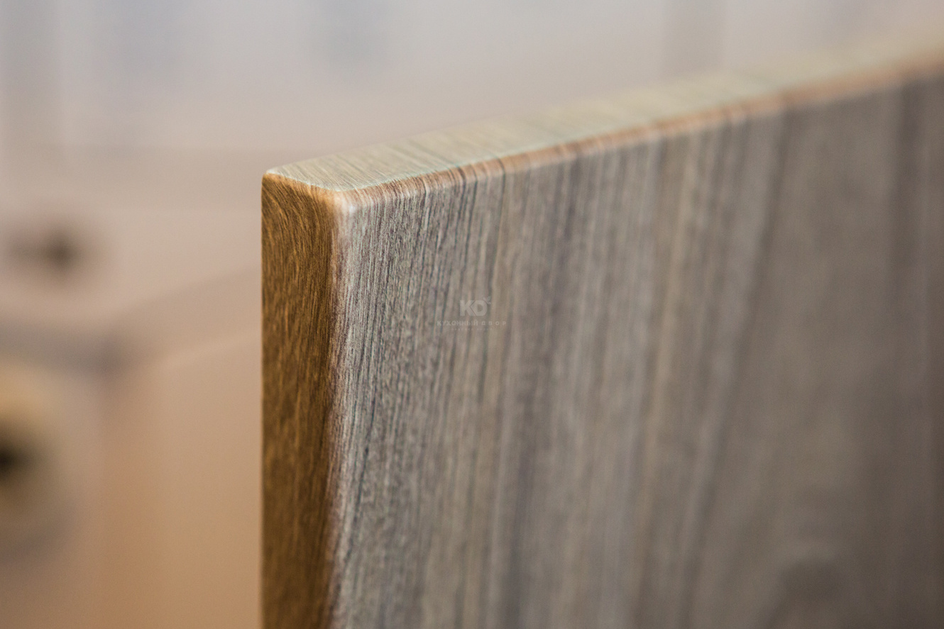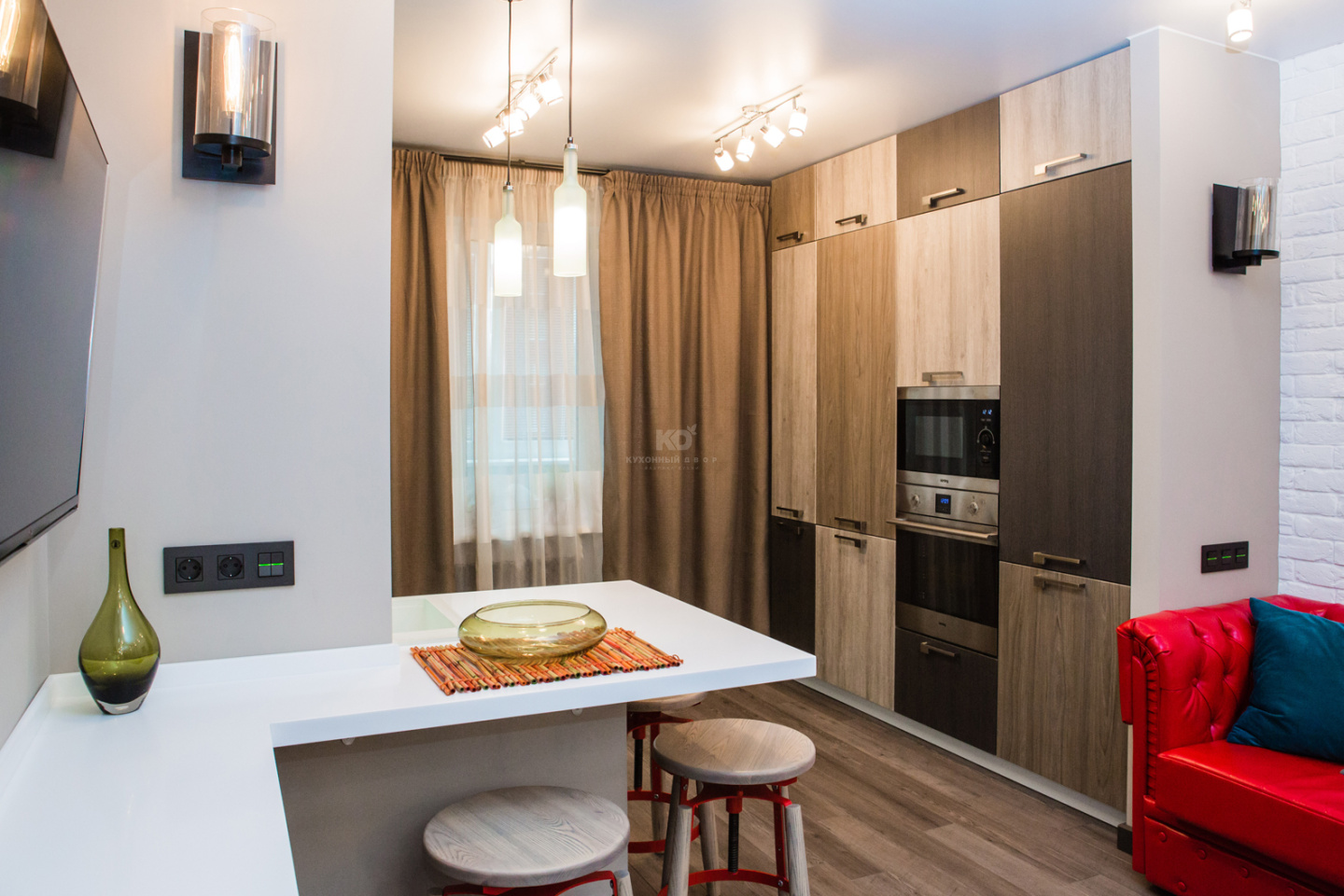 Перед дизайнером проекта - Марией Поповой стояла задача создать современный, компактный и стильный интерьер, воплотить стремление хозяина квартиры к минимализму. В конечном итоге выбор пал на гарнитур «Эмма» из немецкой коллекции «Kuchen-hof». Модульная система кухни очень разнообразна, как и фактура фасадов, которые выполнены из MDF, покрытых экомембраной с эффектом обработанного дерева. В дизайне кухни использована актуальная мировая тенденция - сочетание разноуровневых модулей, рисунков и цветов фактур. На такую кухню одинаково приятно смотреть и прикасаться к ней- ощущение натуральной древесины присутствует в полном объеме. Интересна комплектация модулей, расположенных вдоль двух параллельных стен. За счет того, что бытовая техника спрятана за глухими фасадами отдельно стоящих модулей, интерьер обретает черты кухни-студии, что тоже является актуальным и модным направлением в дизайне. Несмотря на лаконичность и компактность, кухня «Эмма» выглядит очень эффектно. Она оснащена самыми современными системами выдвижения и хранения. Прямые линии глухих фасадов, объемные вместительные ящики, сдержанная красота и максимальная эргономичность - "Эмма" знает, что нужно жителю мегаполиса!