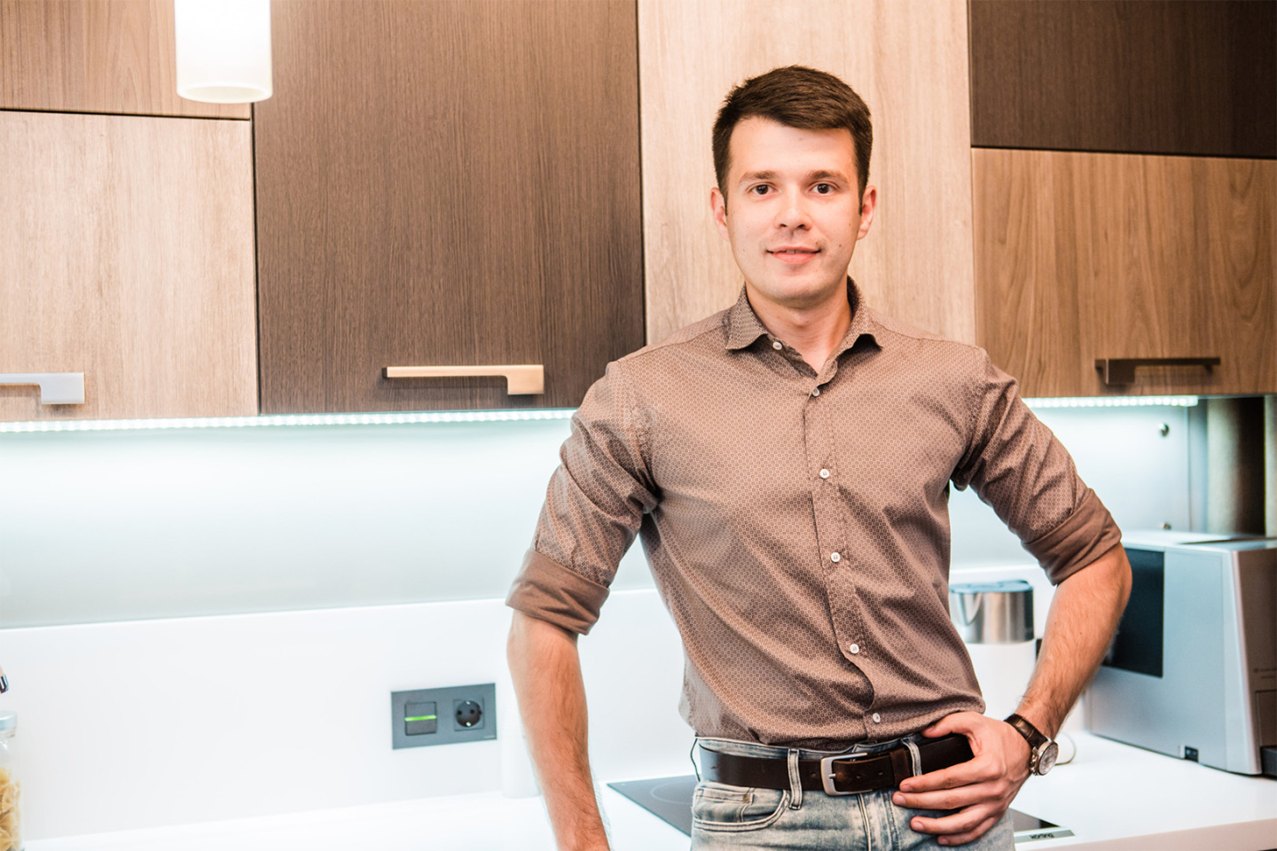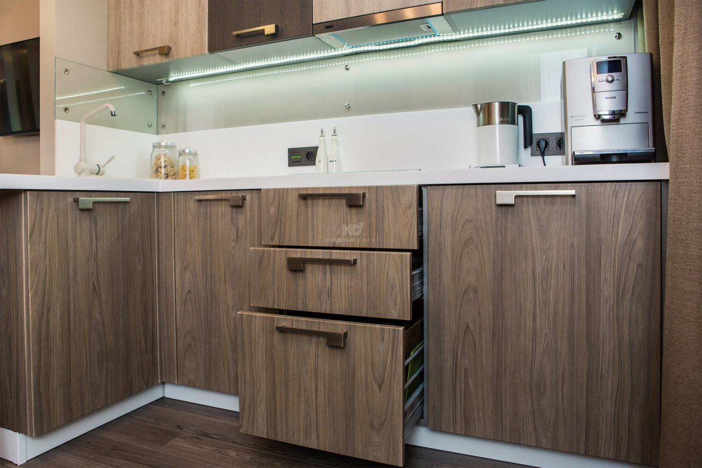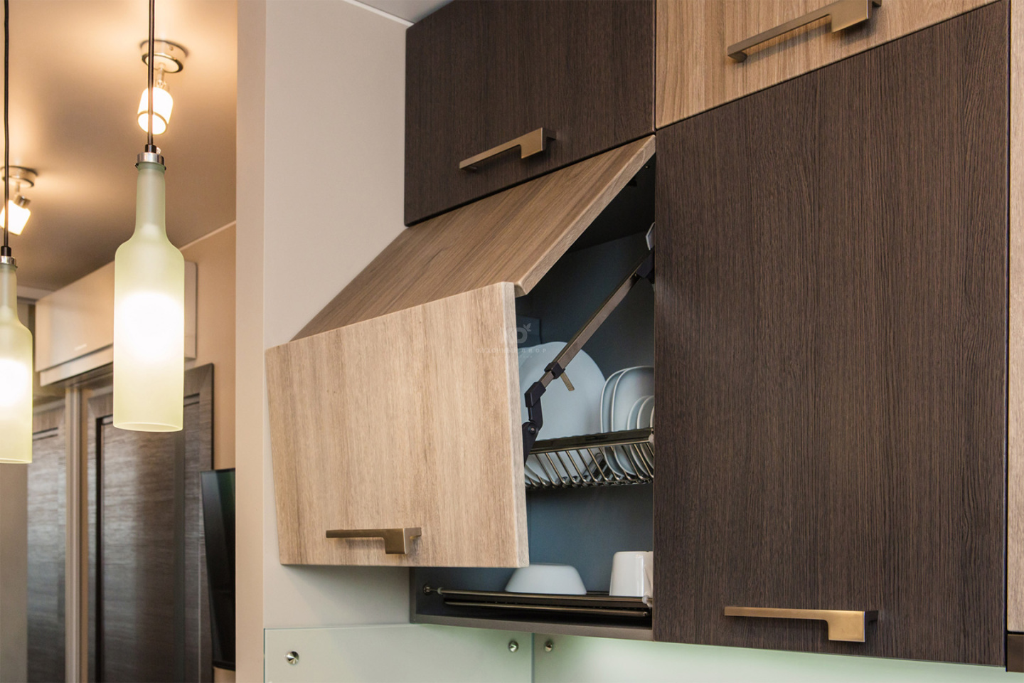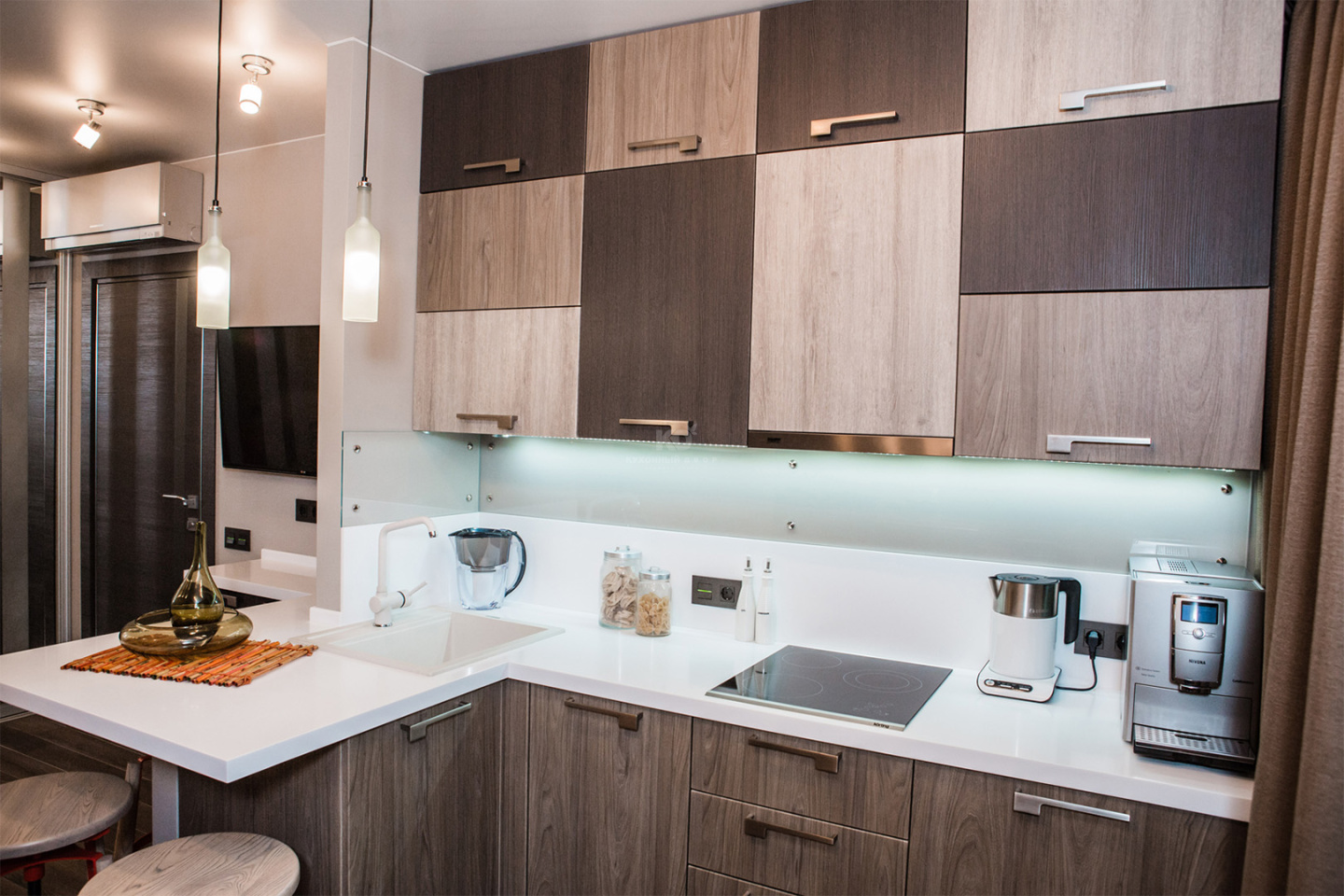 Перед дизайнером проекта - Марией Поповой стояла задача создать современный, компактный и стильный интерьер, воплотить стремление хозяина квартиры к минимализму. В конечном итоге выбор пал на гарнитур «Эмма» из немецкой коллекции «Kuchen-hof». Модульная система кухни очень разнообразна, как и фактура фасадов, которые выполнены из MDF, покрытых экомембраной с эффектом обработанного дерева. В дизайне кухни использована актуальная мировая тенденция - сочетание разноуровневых модулей, рисунков и цветов фактур. На такую кухню одинаково приятно смотреть и прикасаться к ней- ощущение натуральной древесины присутствует в полном объеме. Интересна комплектация модулей, расположенных вдоль двух параллельных стен. За счет того, что бытовая техника спрятана за глухими фасадами отдельно стоящих модулей, интерьер обретает черты кухни-студии, что тоже является актуальным и модным направлением в дизайне. Несмотря на лаконичность и компактность, кухня «Эмма» выглядит очень эффектно. Она оснащена самыми современными системами выдвижения и хранения. Прямые линии глухих фасадов, объемные вместительные ящики, сдержанная красота и максимальная эргономичность - "Эмма" знает, что нужно жителю мегаполиса!