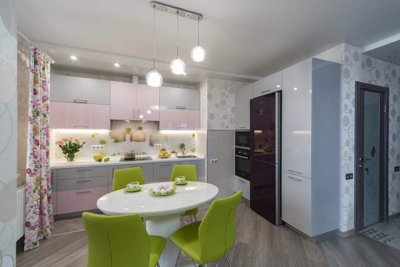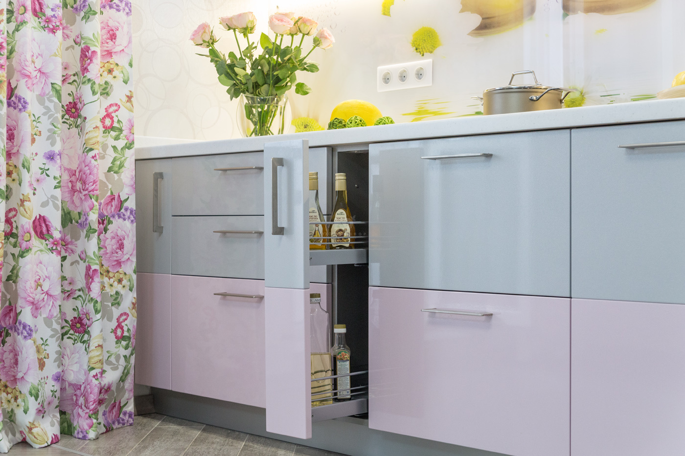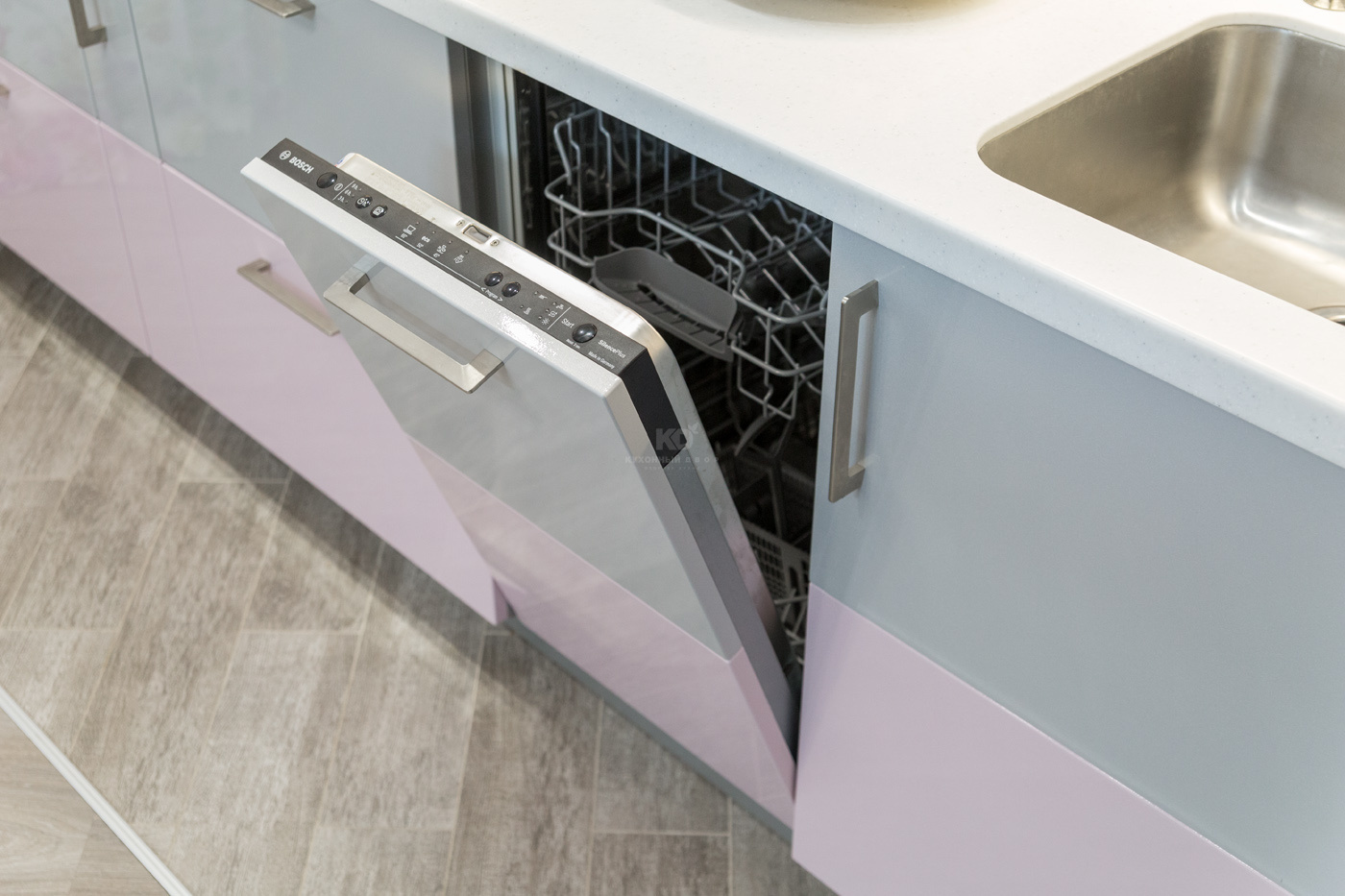 Фасады модели выполнены из MDF и покрыты глянцевой экомембраной. Для кухни подобрано очень нежное цветовое сочетание, которое внешне напоминает свежую пастилу в подарочной упаковке.