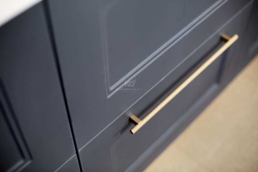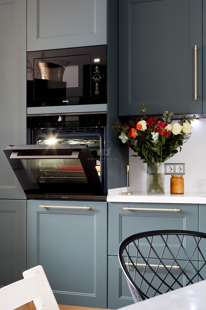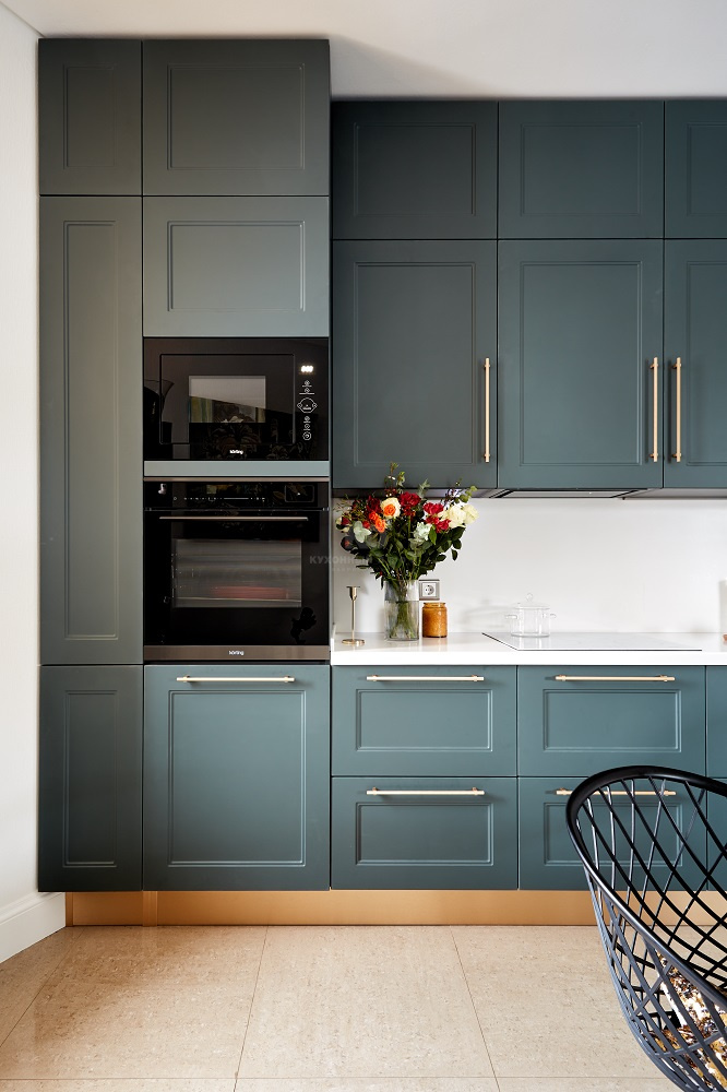 Настоящая гордость этой «Эрики» – продуманная палитра. Тёмно-зелёные фасады, роскошный блеск золота, строгость чёрного и кристальная чистота белого – всё здесь взаимосвязано и сбалансировано. Цветовое равновесие наделяет внушительную трёхъярусную кухню поразительной лёгкостью. «Эрика» совершенно не утяжеляет интерьер и прекрасно смотрится в залитом солнцем помещении. А строгая фрезеровка фасадов добавляет модели благородства и выразительности.