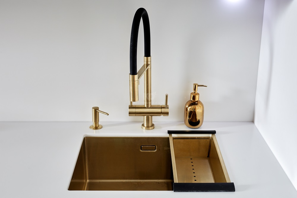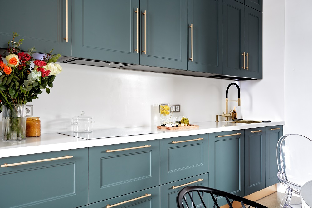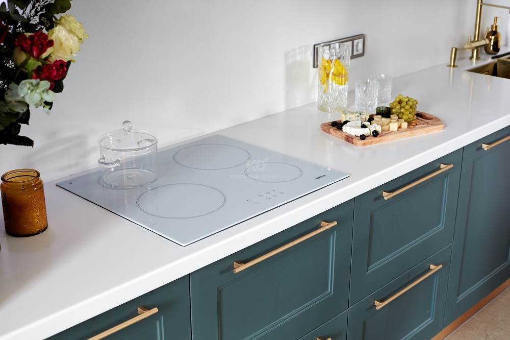 Фасады модели созданы из МДФ с прямоугольной фрезеровкой и покрыты бархатистой, не пачкающейся экомембраной. За ними скрыт внушительный объём полезного пространства, а также удобные аксессуары и современная техника. «Эрика» Анастасии Стоцкой оснащена полноразмерной посудомоечной машиной, СВЧ и духовым шкафом на удобной высоте, а также мощной варочной панелью. Кстати, для панели был специально выбран белый цвет, чтобы сохранить цельный облик столешницы.