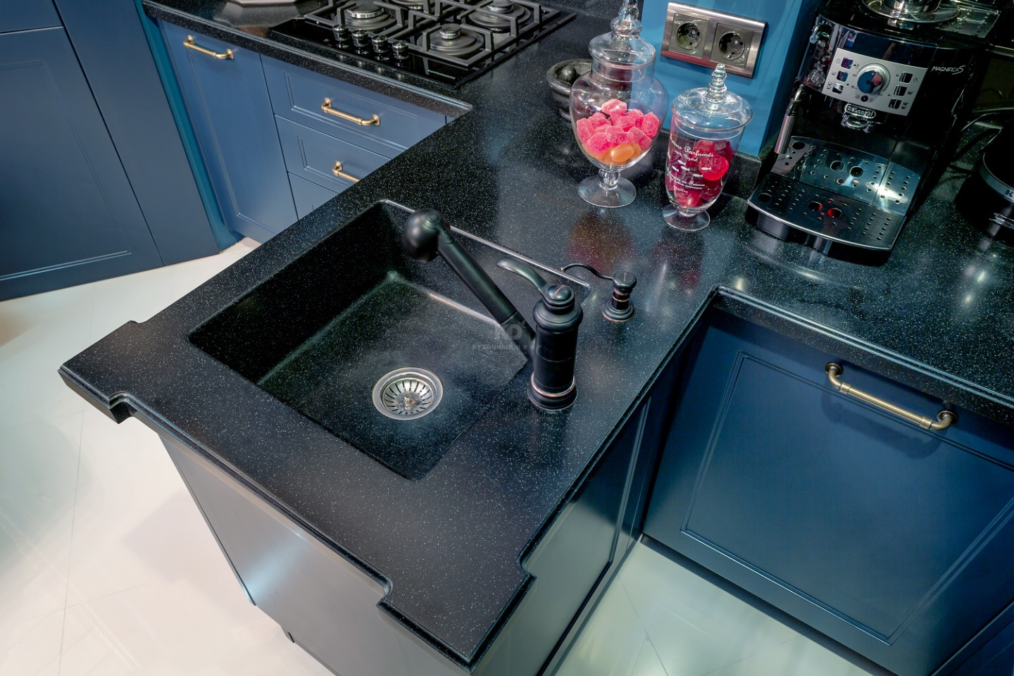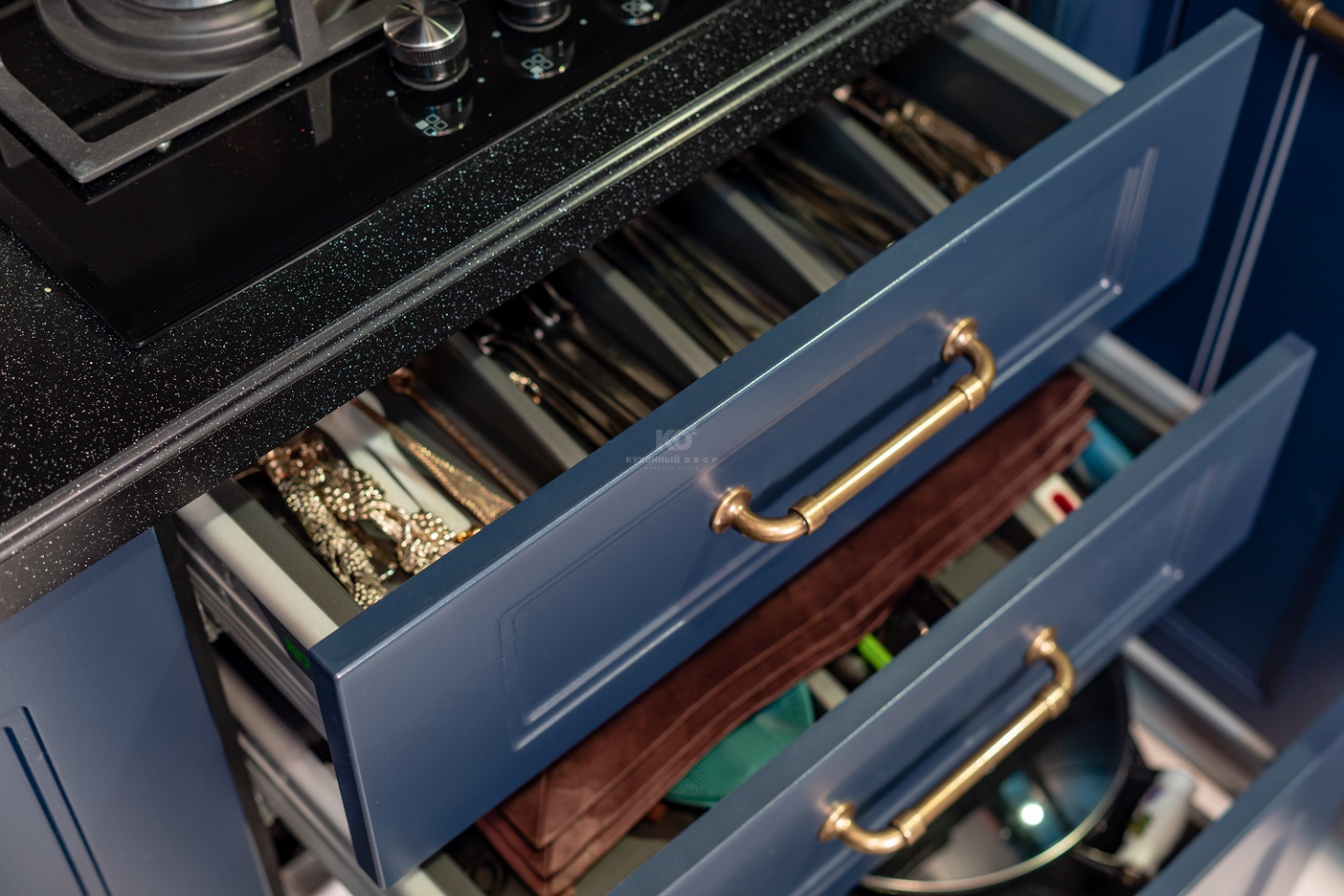 Эта кухня удачно объединяет в себе благородную внешность и инновационные решения. В ее дизайне безошибочно угадываются классические черты: строгие пропорции, прямоугольная фрезеровка, массивные бронзовые ручки, роскошная каменная столешница сложной формы... При этом покрытием для фасадов «Эрики» служит ультрасовременный материал – экомембрана. Она обеспечивает оптимальный теплообмен между поверхностями кухни и внешней средой, а также надёжно защищает фасады от повреждений. Еще одно преимущество экомембраны – долговечность. Цветовая насыщенность и внешний облик этого покрытия практически не меняются с течением времени. Вот что значит действительно «нестареющая классика»!