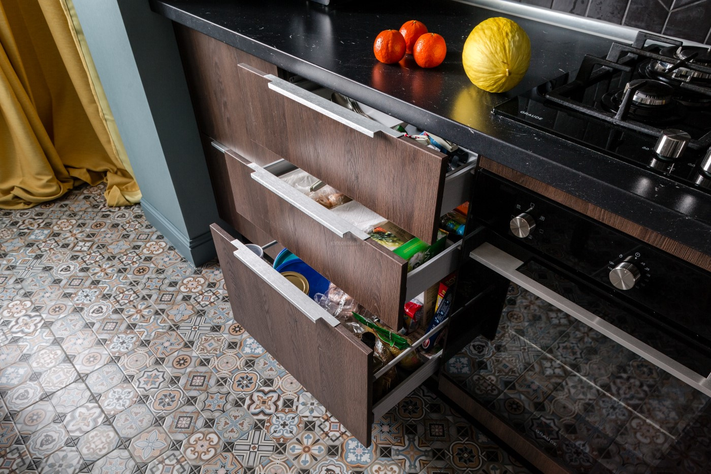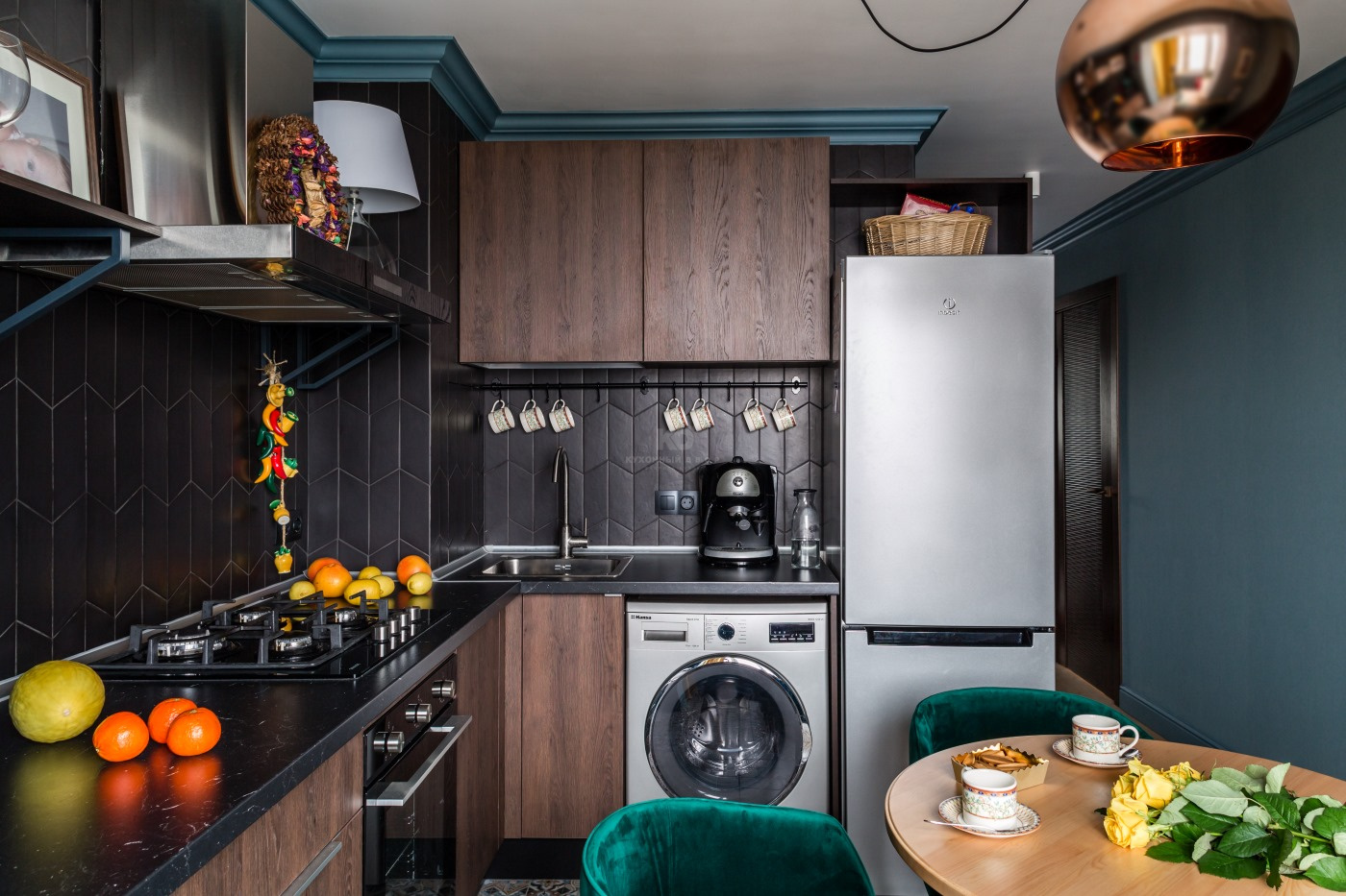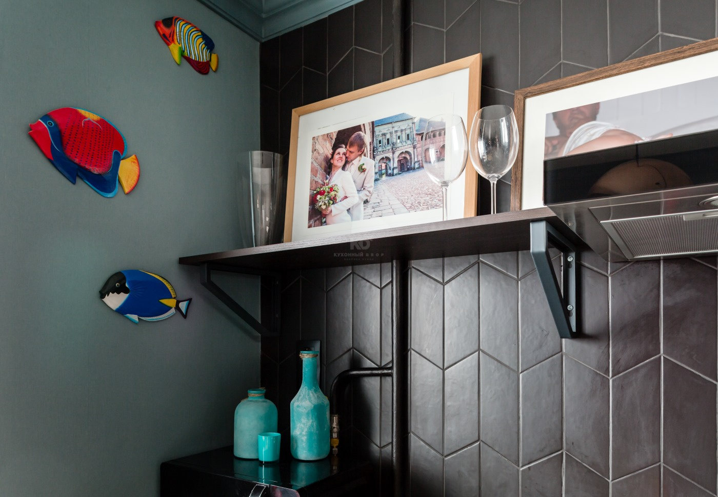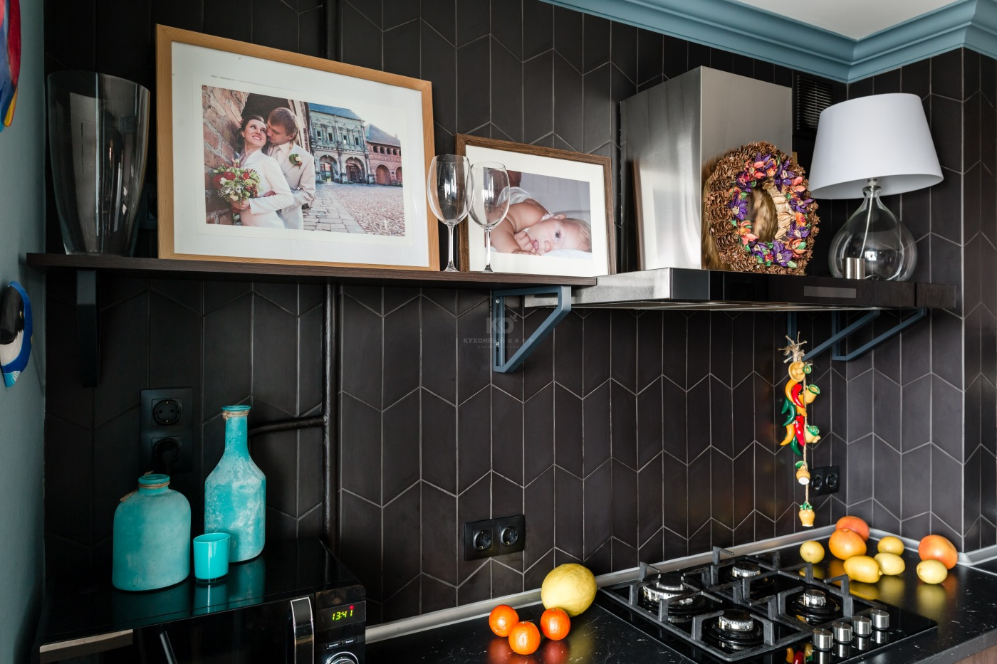 Екатерина планировала создать с помощью «Эстер» место, где ее друзья будут чувствовать себя комфортно. Поэтому верхние полки из тамбурата и вытяжка были задуманы как основа для декорирования. Дорогие сердцу хозяев фотографии не выбиваются из общей стилистики комнаты. Напротив, они делают кухню чем-то намного большим, чем место, где просто готовят и едят. Здесь хочется отдыхать, наслаждаясь общением с близкими.