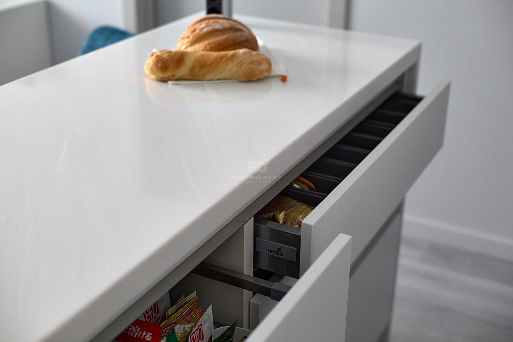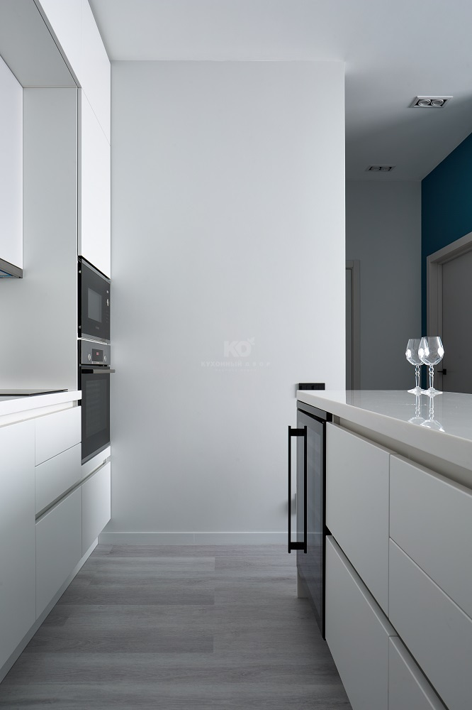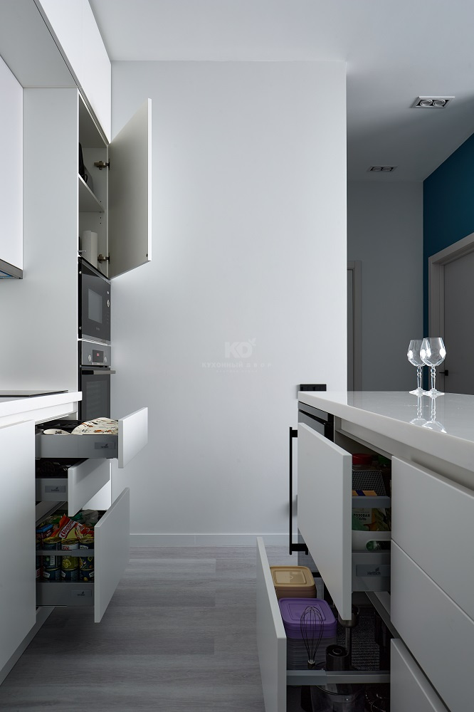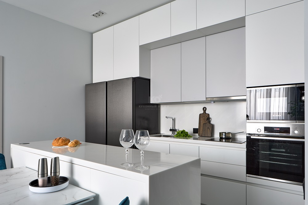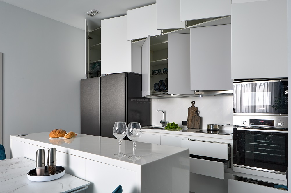 «Фаворит» из этого проекта имеет впечатляющий функционал. Он оснащён холодильником, мощной скрытой вытяжкой, варочной панелью, духовым шкафом и СВЧ на удобной высоте, измельчителем пищевых отходов и посудомоечной машиной. А многофункциональный остров имеет блок скрытых розеток и винный шкаф. Готовить, работать или отдыхать – здесь любое занятие превращается в удовольствие!