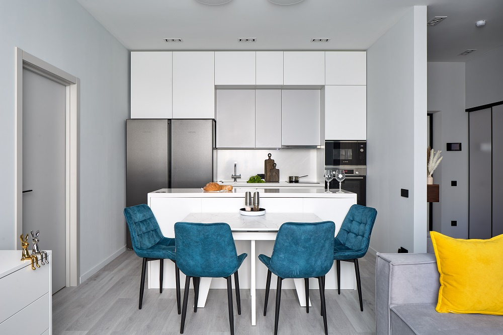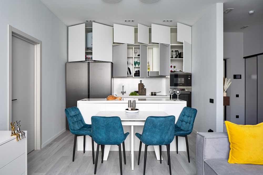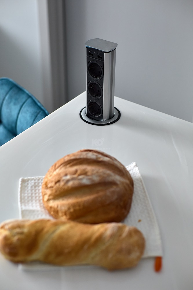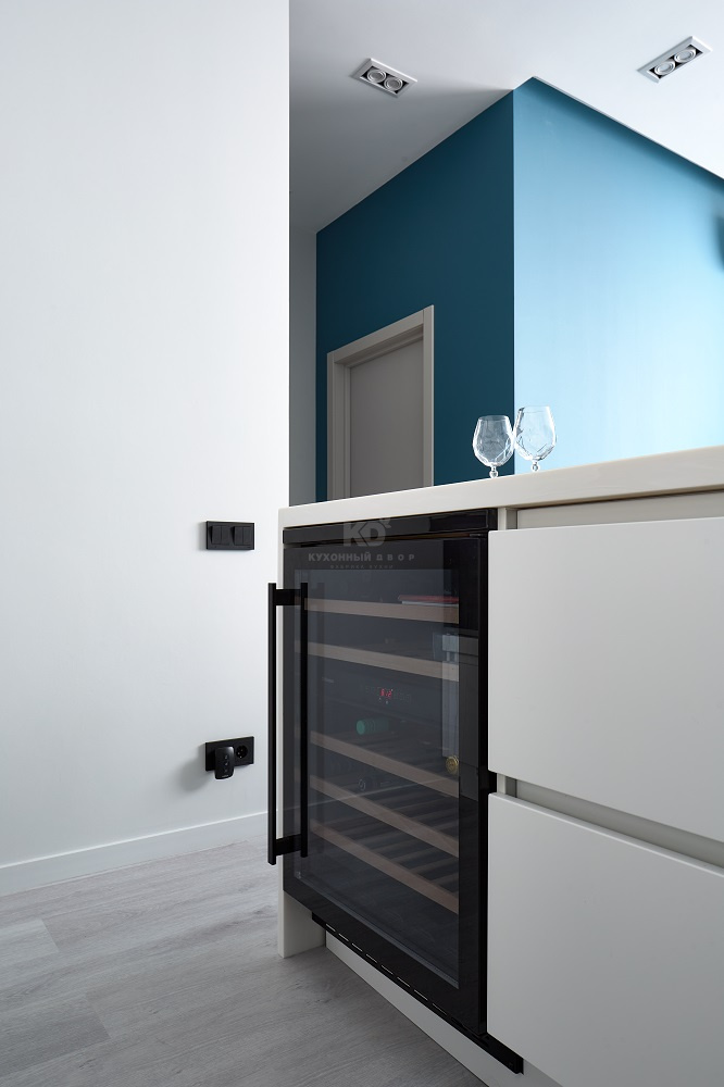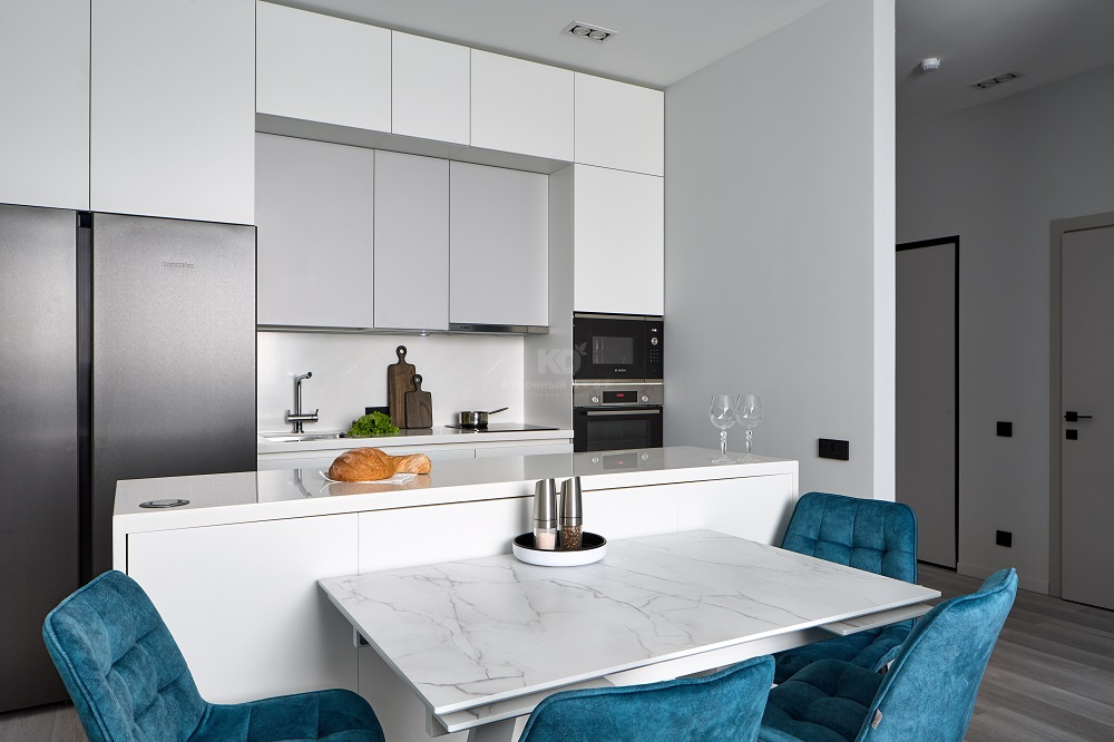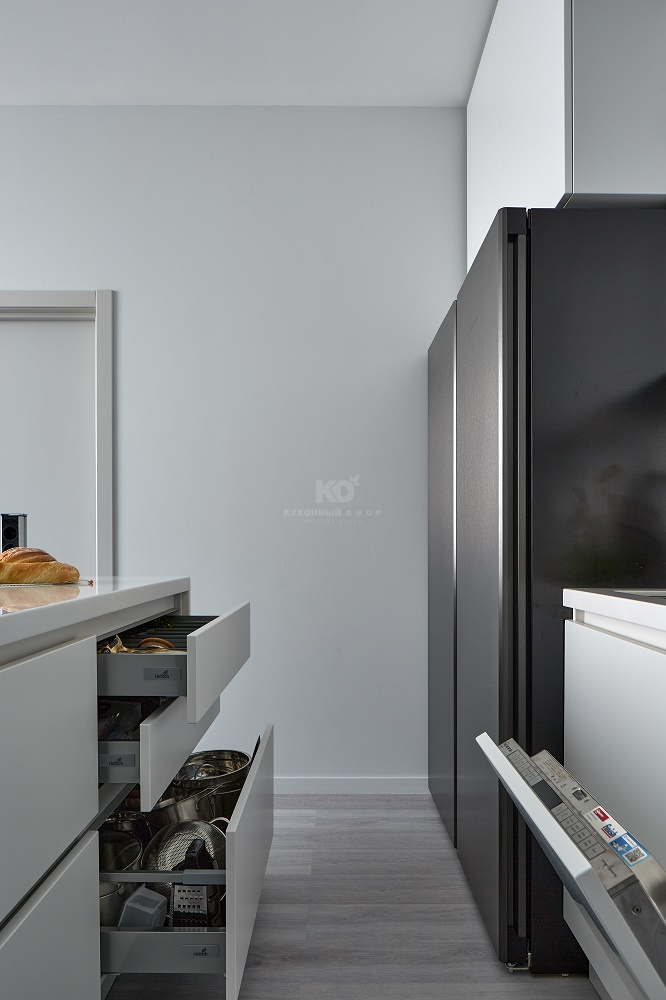 «Фаворит» из этого проекта имеет впечатляющий функционал. Он оснащён холодильником, мощной скрытой вытяжкой, варочной панелью, духовым шкафом и СВЧ на удобной высоте, измельчителем пищевых отходов и посудомоечной машиной. А многофункциональный остров имеет блок скрытых розеток и винный шкаф. Готовить, работать или отдыхать – здесь любое занятие превращается в удовольствие!