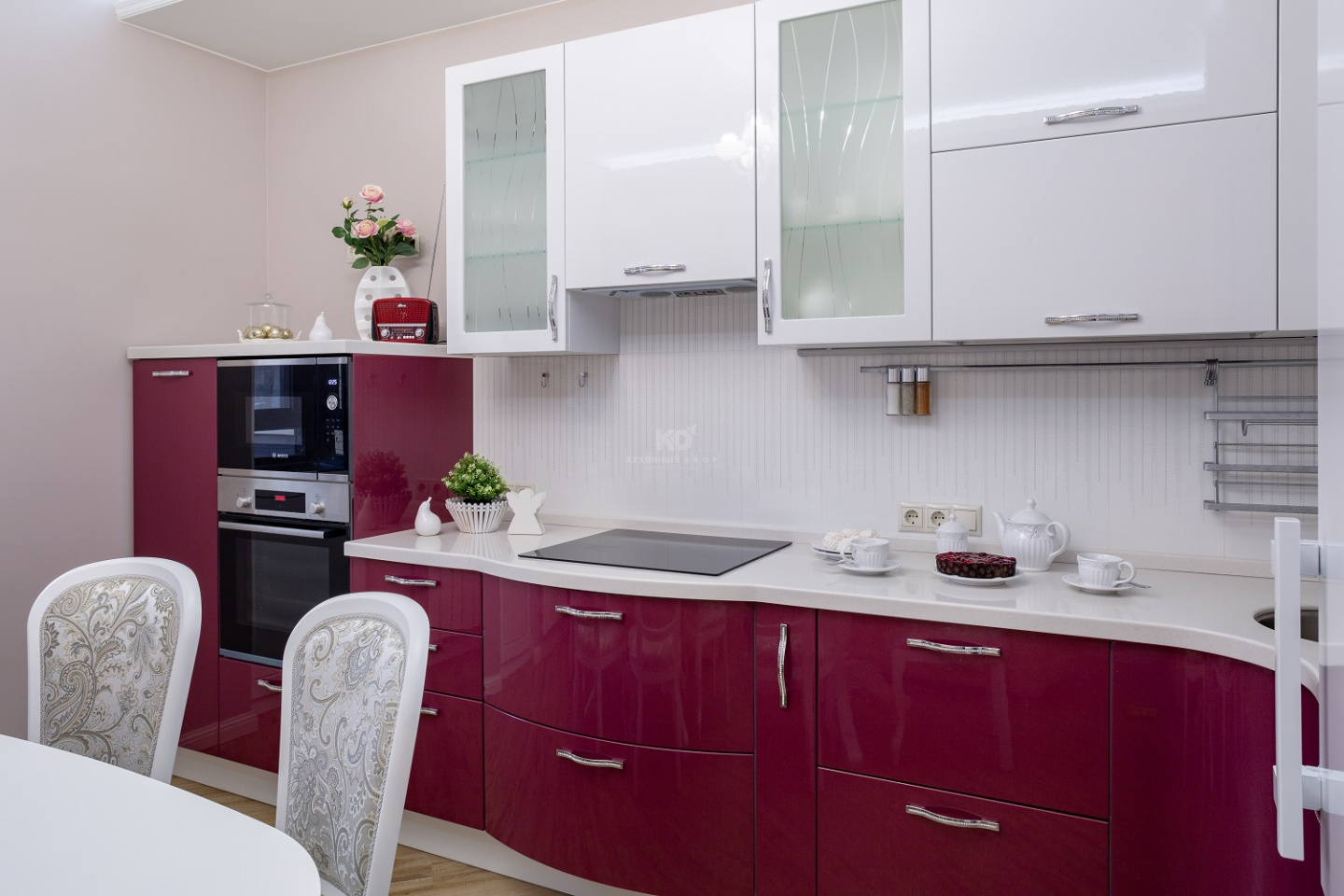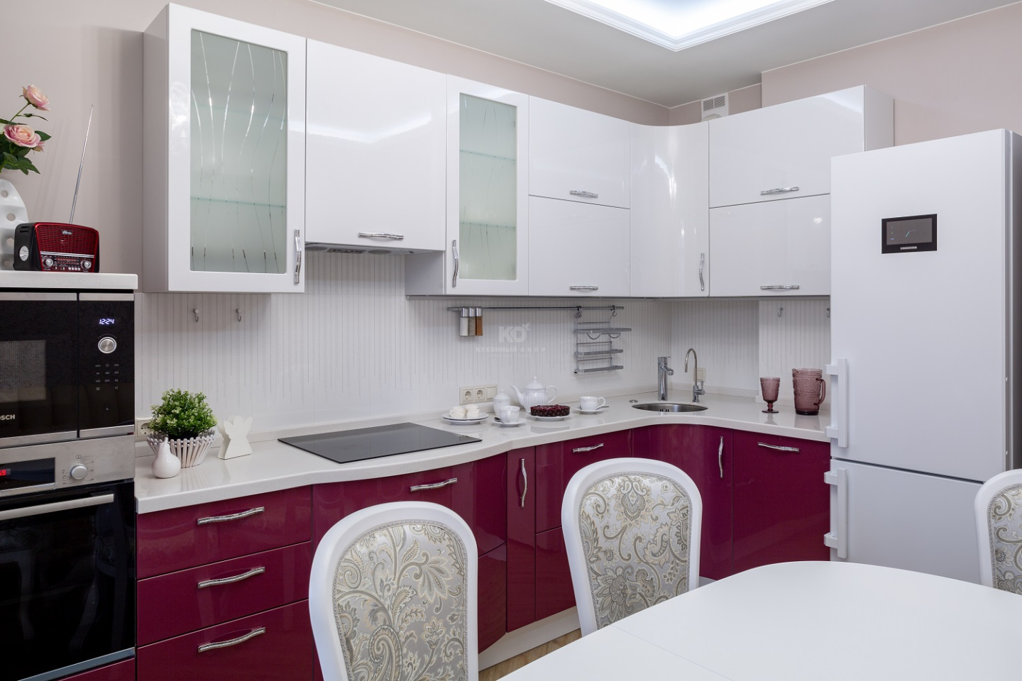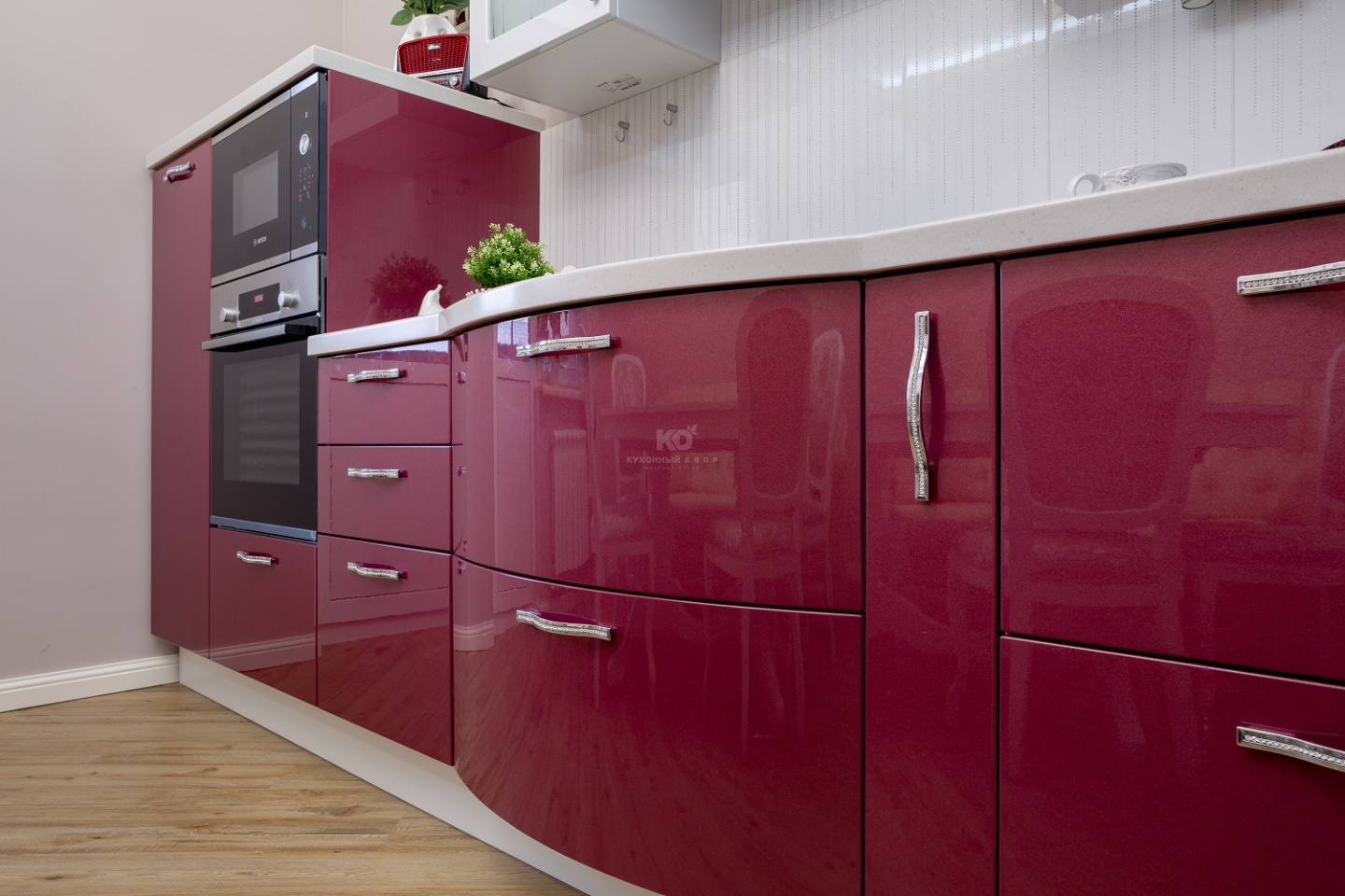 Фасады «Глории» созданы из МДФ, покрытой экомембраной и лаком с эффектом «высокий глянец». Благодаря такому покрытию поверхности великолепно отражают свет и визуально расширяют пространство. А комбинация белоснежного цвета с цветом фуксии делает кухню аппетитной, словно изысканный десерт!