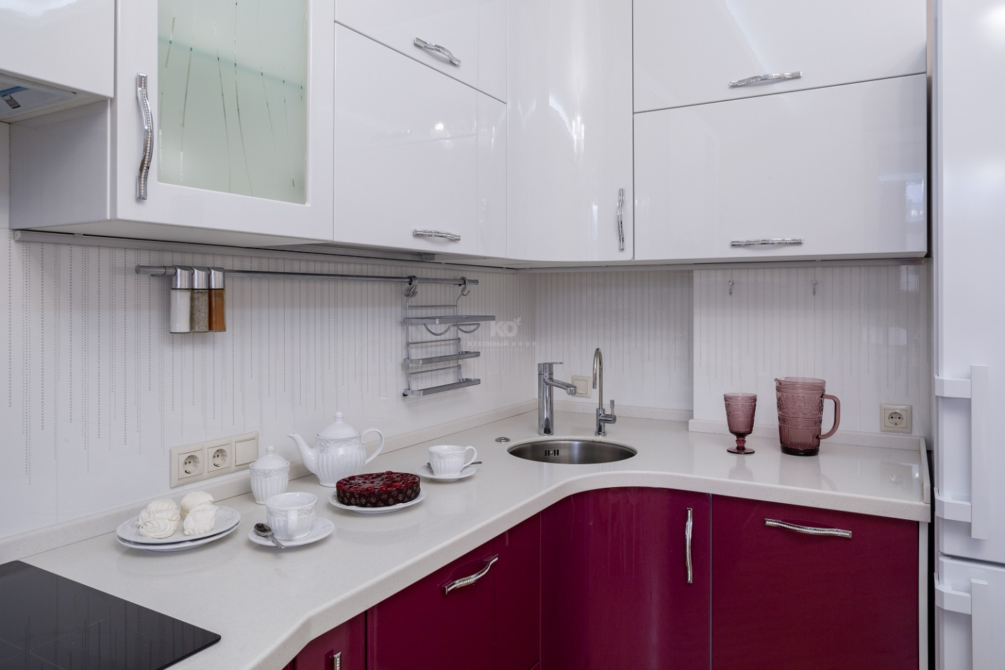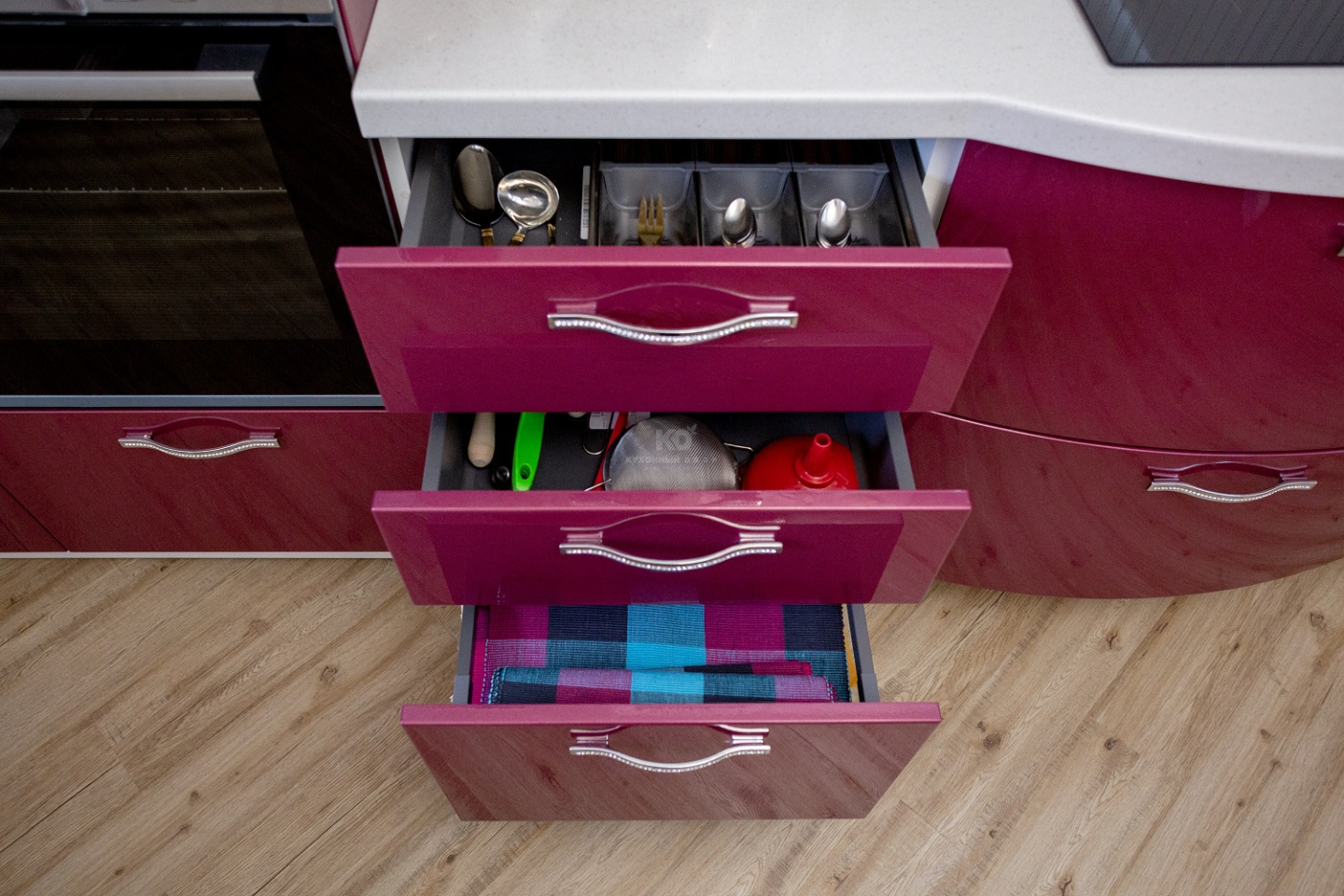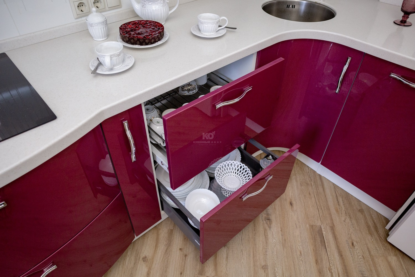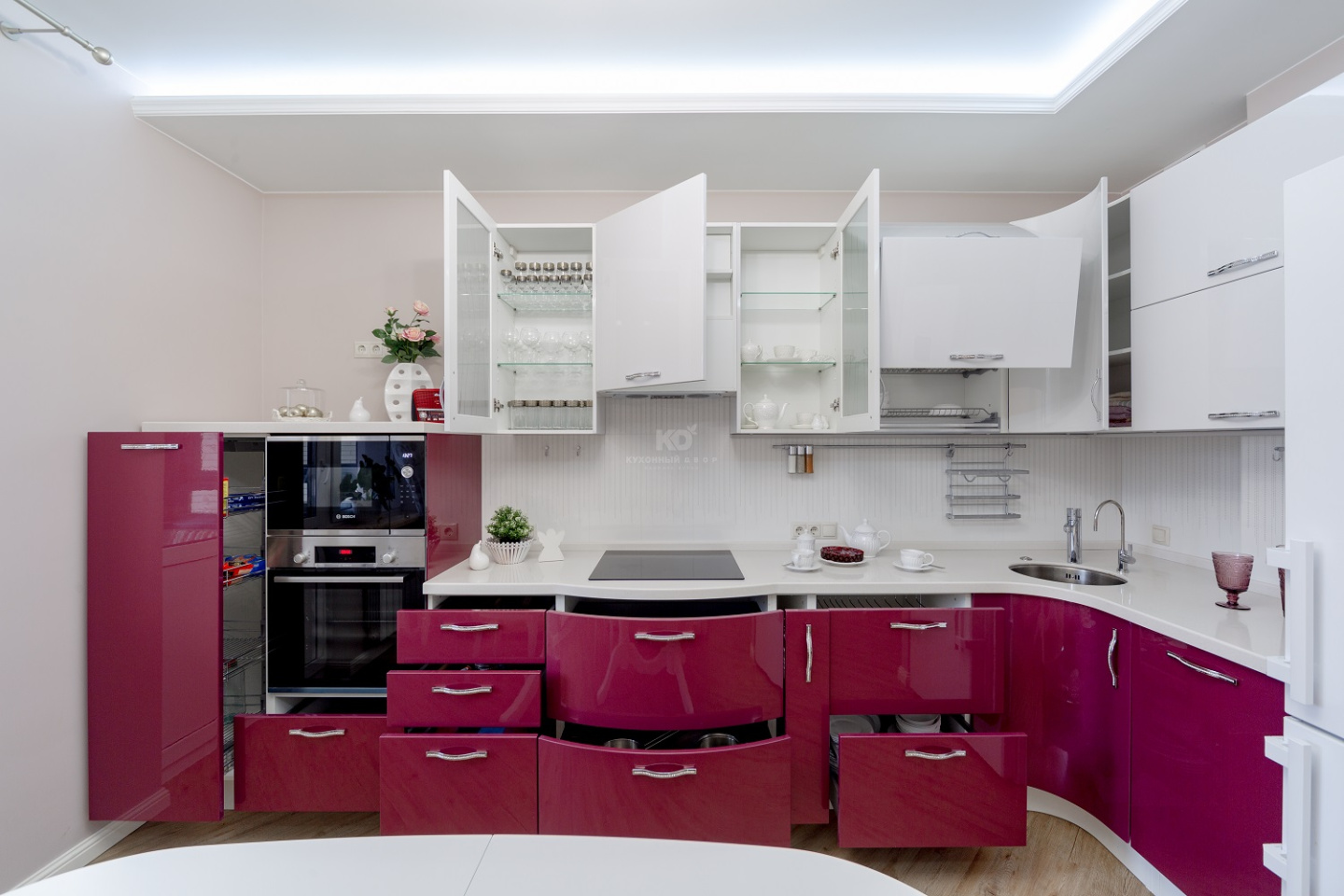 Фасады «Глории» созданы из МДФ, покрытой экомембраной и лаком с эффектом «высокий глянец». Благодаря такому покрытию поверхности великолепно отражают свет и визуально расширяют пространство. А комбинация белоснежного цвета с цветом фуксии делает кухню аппетитной, словно изысканный десерт!