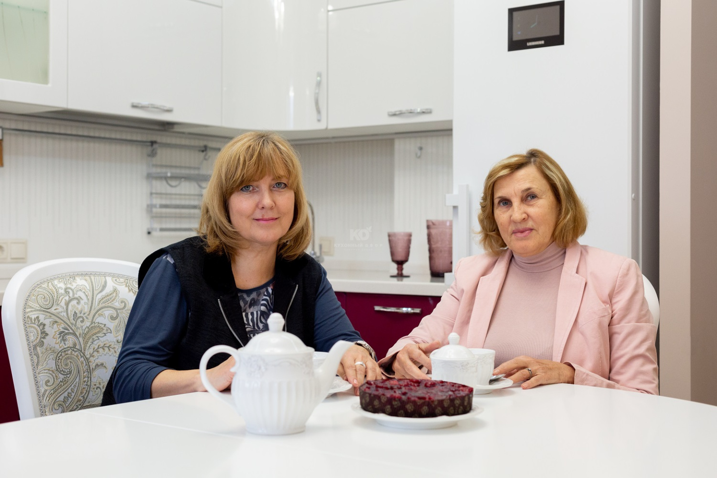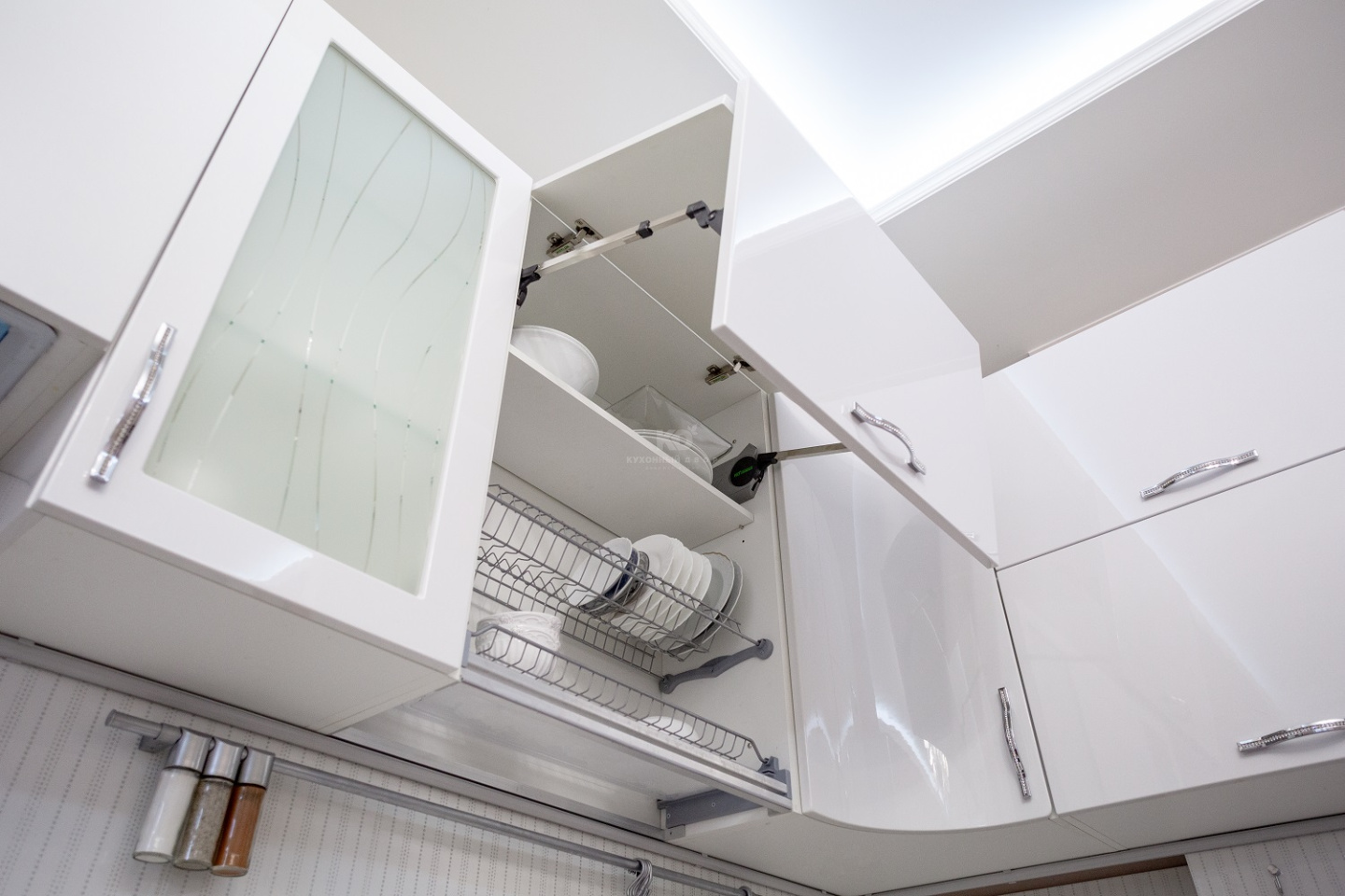 «Глория» имеет угловую компоновку модулей, а вот вместо углов – плавные изгибы и радиусы. Столешница точно следует форме модулей, повторяя их закруглённые элементы. Такая «обтекаемость» делает облик кухни еще более утончённым. Матированные узорные витражи и ручки с кристаллами Swarovski также подчёркивают изящество модели. «Глория» выглядит как элегантная леди, готовая к выходу в свет.