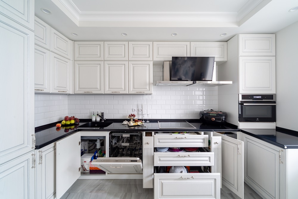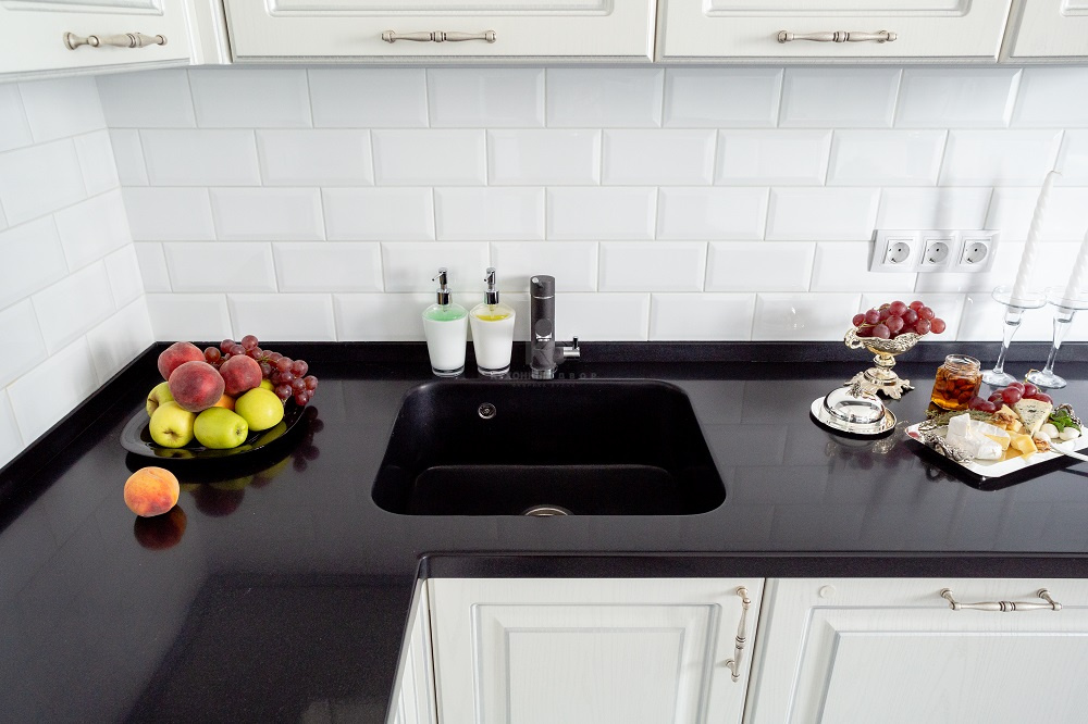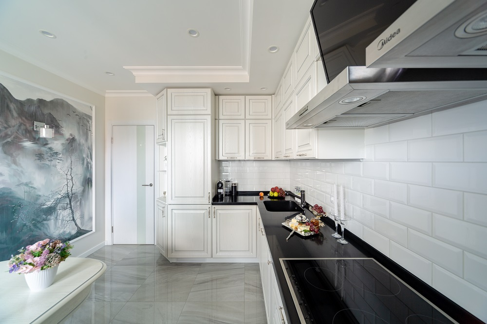 На внешности хочется остановиться отдельно. Контраст чёрного и белого очень к лицу «Катарине». Светлые фасады делают ее облик утонченным, а чёрная каменная столешница добавляет этой утончённости благородства. Еще более выразительной «Катарину» делают изящные металлические ручки и роскошная серебристая патина. С помощью патинорования дизайнеры «KD-Lab» сделали дополнительный акцент на классической прямоугольной фрезеровке и лишний раз подчеркнули красоту фасадов.