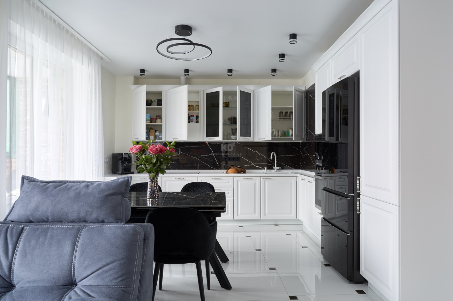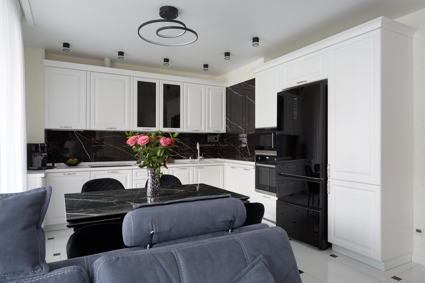 Поздравить есть за что, ведь кухня красивая и комфортабельная. А ещё яркая! Да-да, хоть фасады здесь и белые, в яркости всего образа нет никаких сомнений. Вписывая «Катарину» в интерьер, дизайнеры сделали ставку на классический цветовой контраст. Кухня ярко выделяется на фоне тёмной техники, обеденной зоны, фартука и элементов освещения. При этом белизна её фасадов, цоколей и карнизов расширяет и без того просторное помещение.