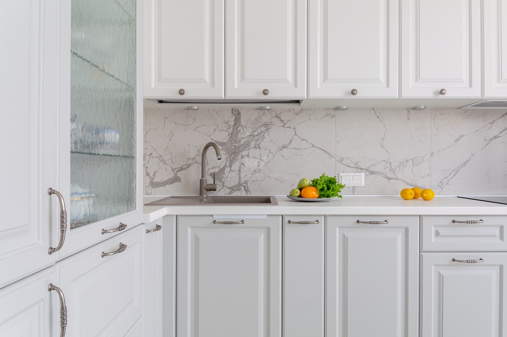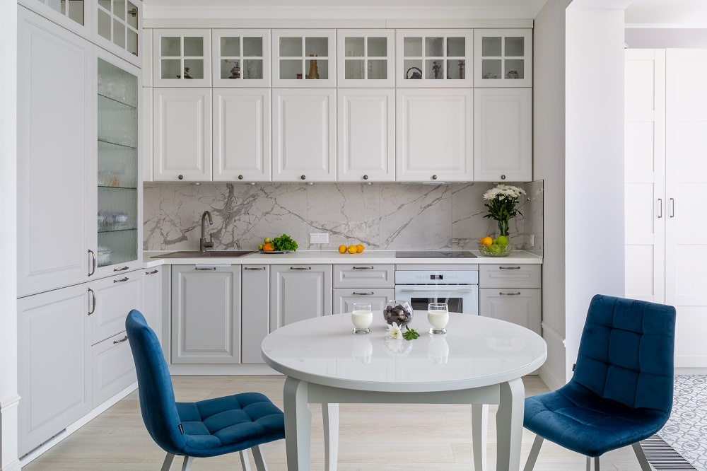 Ритмику фрезеровки здесь подхватывают и застеклённые фасады антресолей с прямоугольной раскладкой. Они украшают кухню словно прекрасный венец. Наличие стёкол позволяет использовать верхний ярус как своеобразную «витрину», где размещен декор и красивая посуда. А для посуды, которая используется часто, в «Катарине» предусмотрен высокий шкаф с матированным стеклом. Он расположен в очень удобном месте – между зоной мойки и встроенным холодильником.