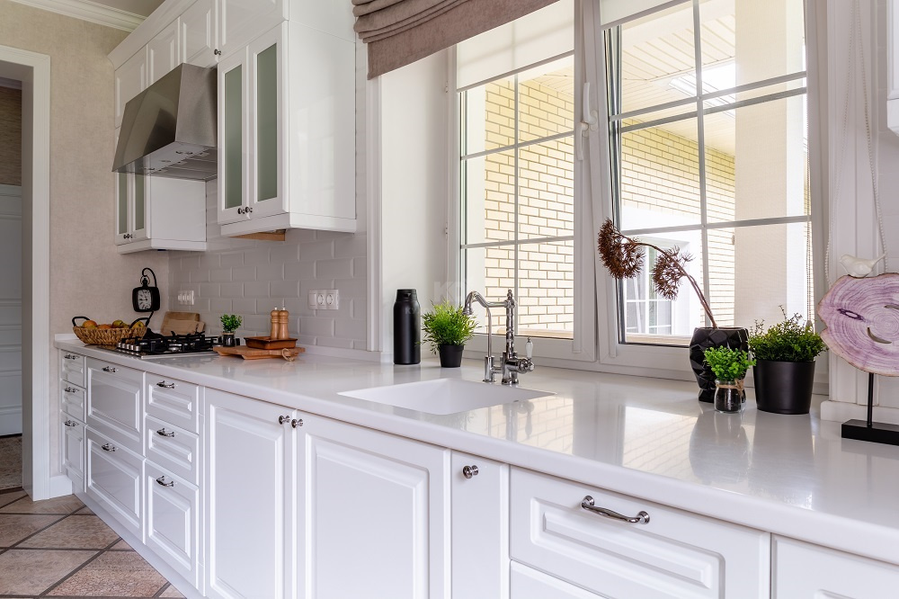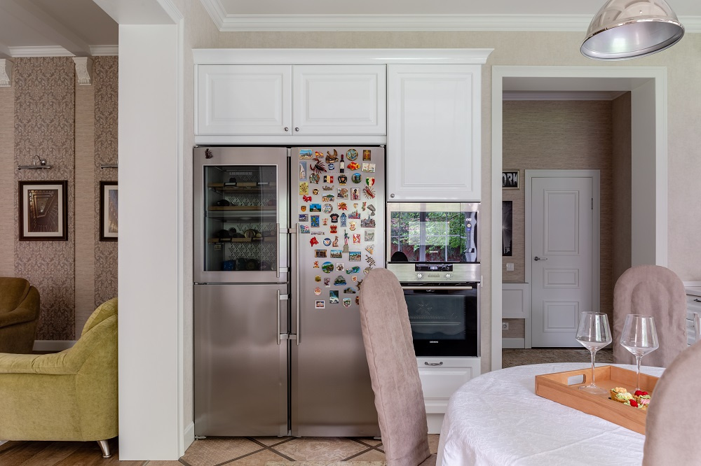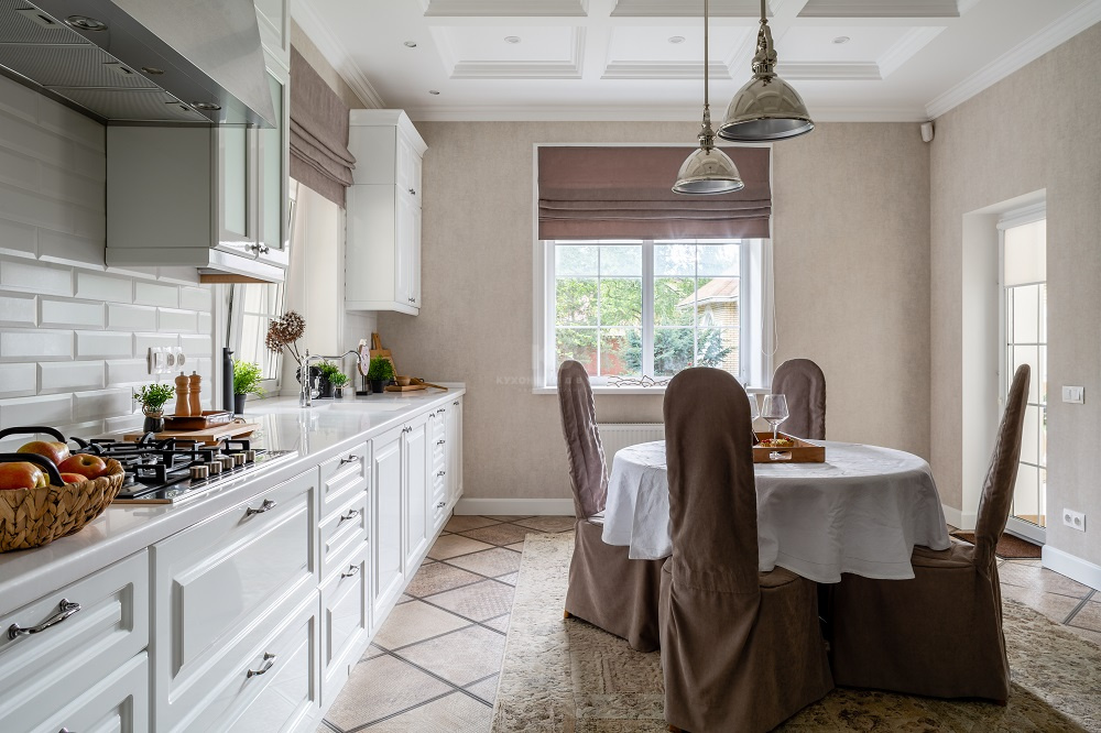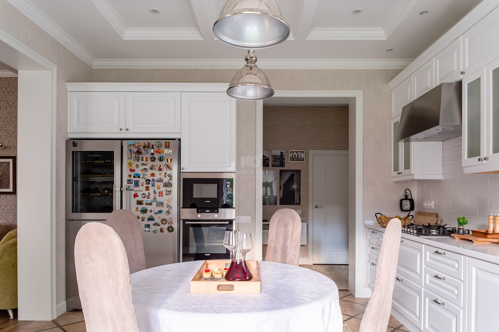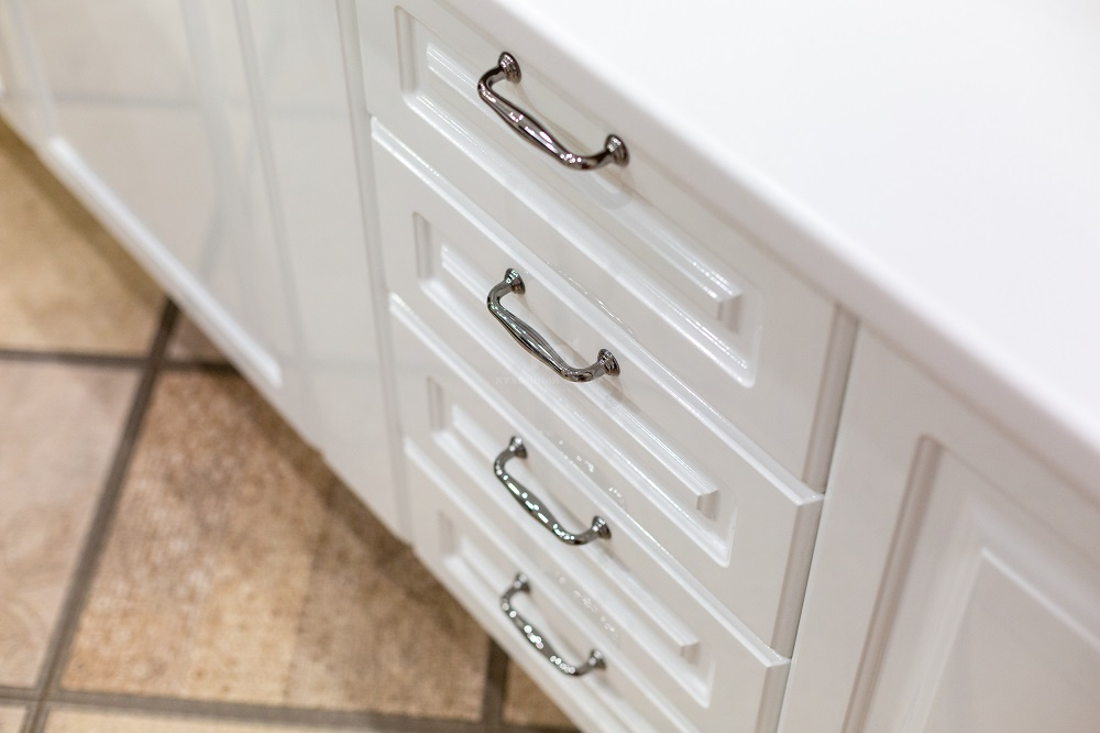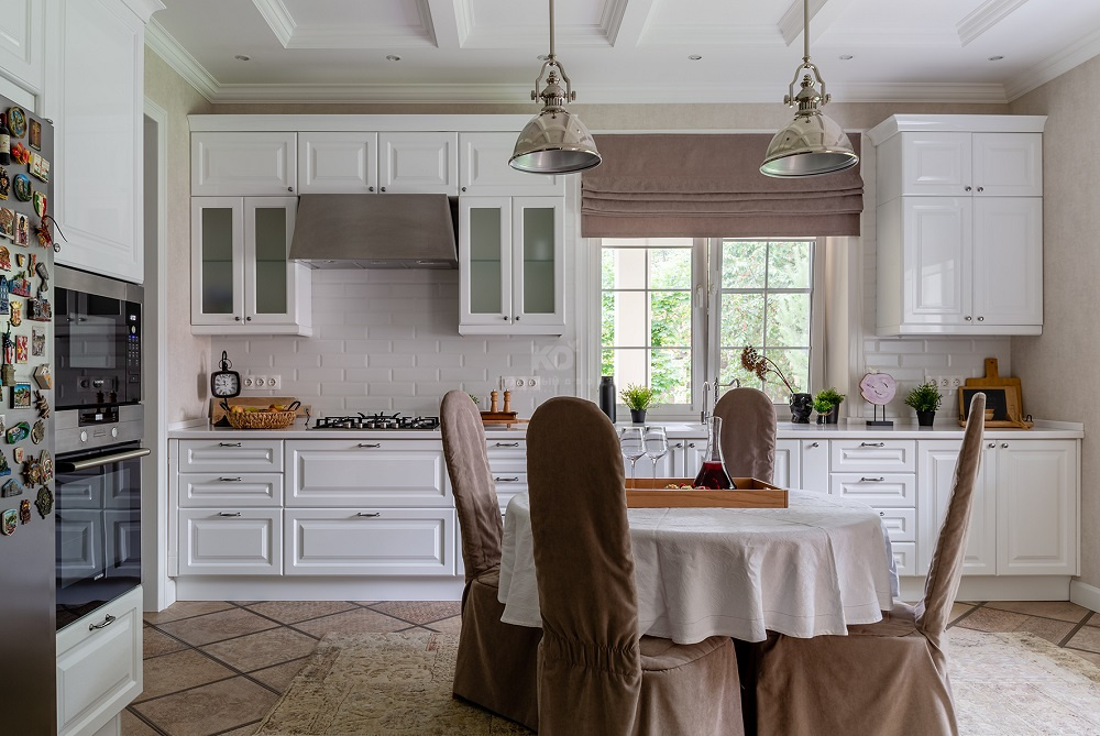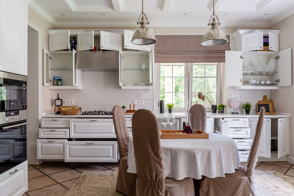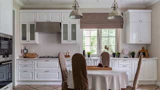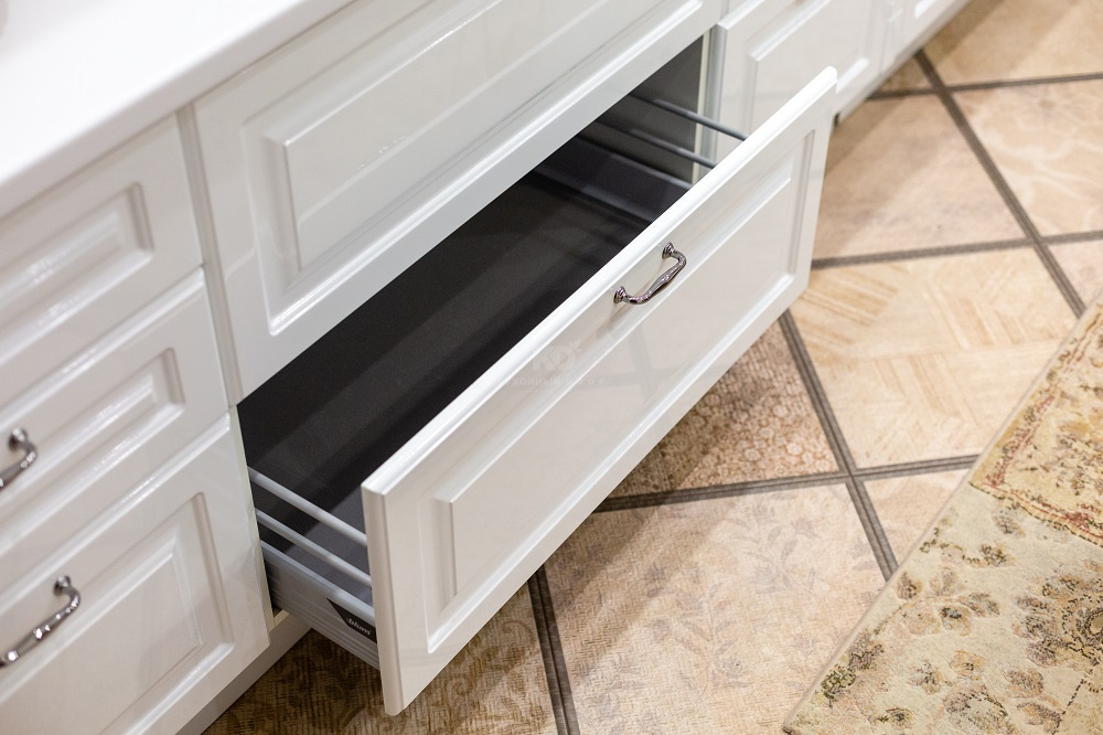 Это модель «Катарина» с фасадами из МДФ, покрытыми высококачественной немецкой экомембраной. Фасады имеют прямоугольную фрезеровку, которая подчёркивает принадлежность «Катарины» к классическому стилю. На это же указывают декоративные пилястры, карнизы, а также элегантная фурнитура. Кухня выглядит легко, изящно и респектабельно. А белый цвет фасадов помогает ей расширить и без того просторные интерьеры!
