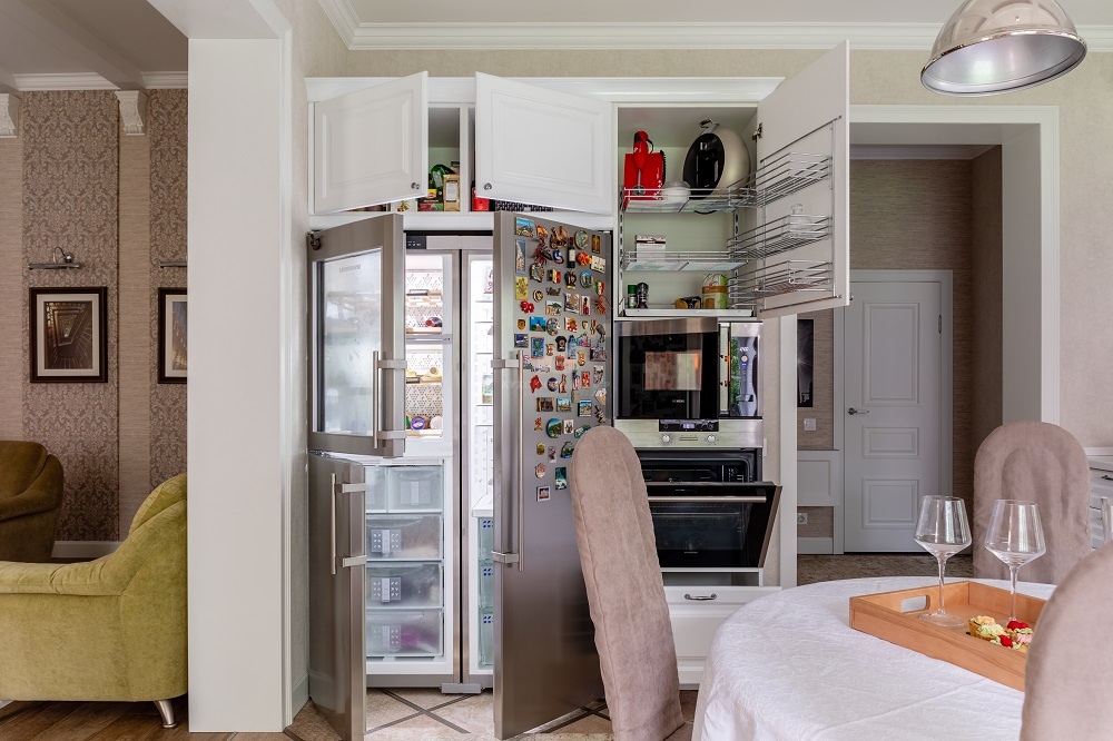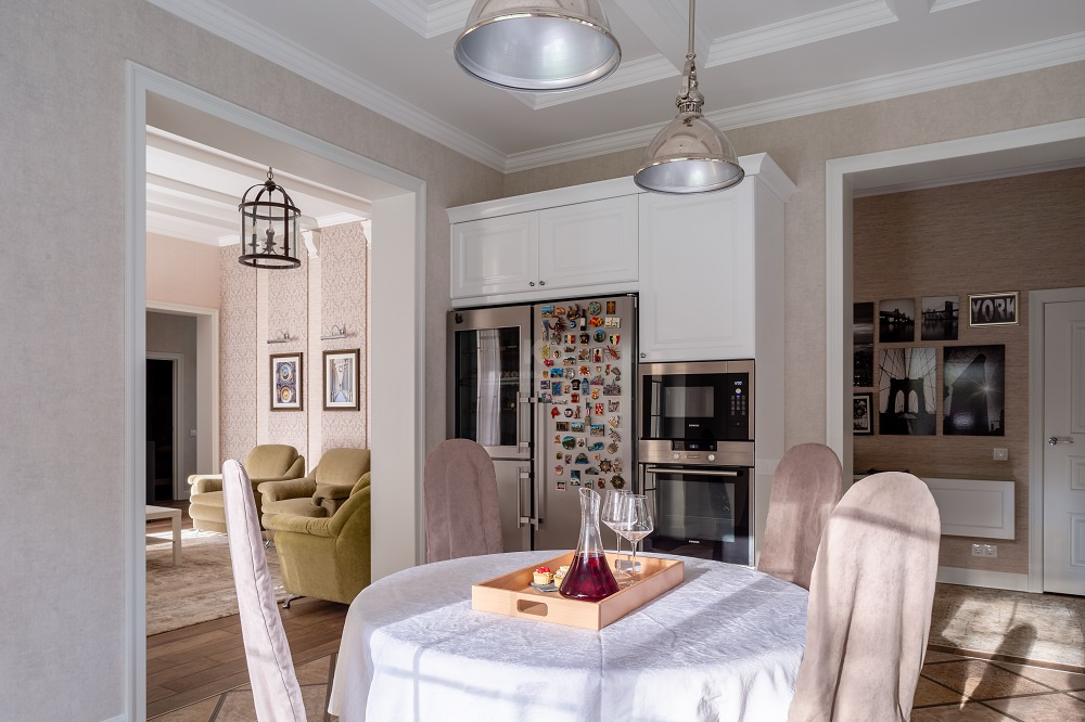 Конфигурация помещения позволила Александре использовать в проекте несколько эффектных решений. Например, интегрированная в акриловую столешницу мойка здесь расположена напротив широкого окна, и пользоваться ей можно любуясь красивыми видами. Также гарнитур удалось оснастить немалым количеством полезных аксессуаров для удобного хранения продуктов и утвари. В «Катарине» есть всё для создания самых сложных кулинарных шедевров: ящики разной вместимости (включая ящики-тяжеловесы), органайзеры, бутылочницы, выдвижная система хранения с сетчатым дном, «Side-by-side»-холодильник с винотекой, мощная вытяжка, газовая плита, а также духовой шкаф и СВЧ на удобной высоте. Кухня в этом гостевом доме создана так, чтобы те, кто ей пользовался, чувствовали себя, как дома!