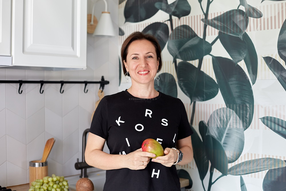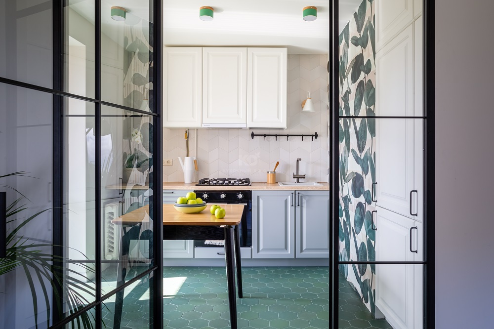 Фасады этой «Катарины» созданы из МДФ с покрытием-экомембраной и выполнены в двух цветах – белом и нежно-голубом. Оттенки вызывают ассоциацию с весенним небом и облаками, а дополнительный природный штрих в эту картину добавляет HPL-столешница под светлое дерево. Лёгкий контраст в полученный образ вносят лаконичные чёрные ручки. В итоге классическую кухню удалось прекрасно вписать в современный интерьер, пронизанный нотками эко-стиля.