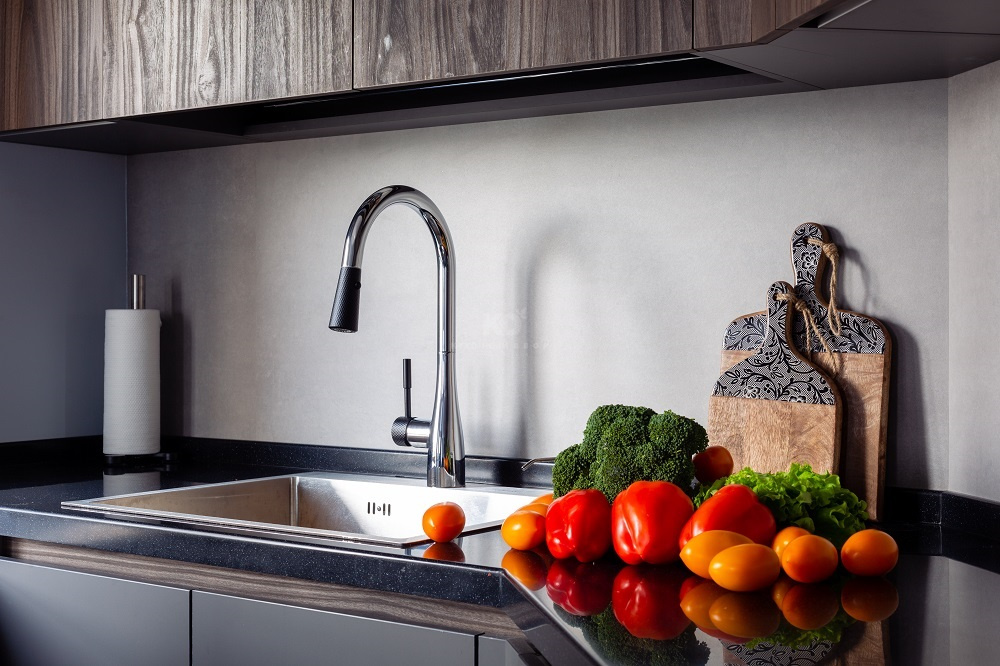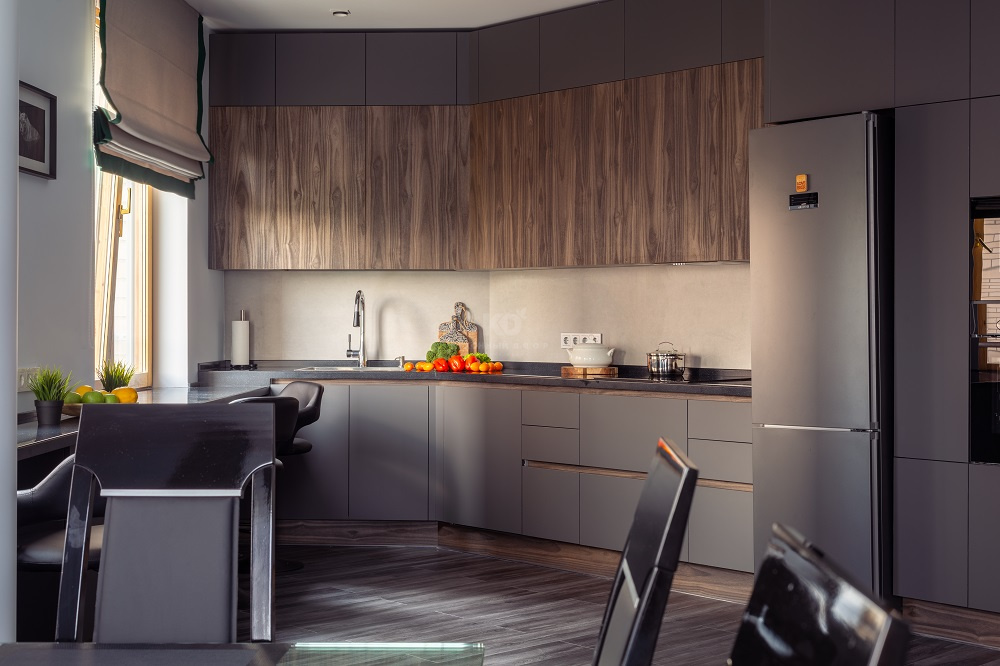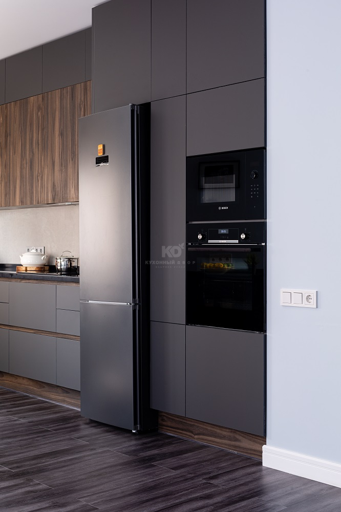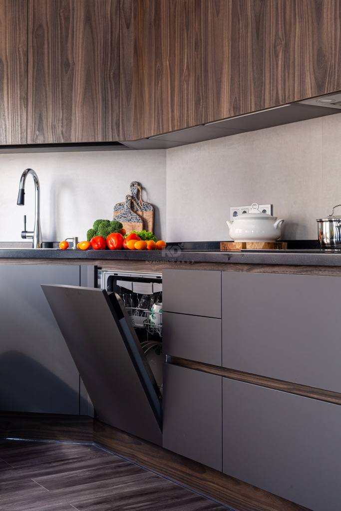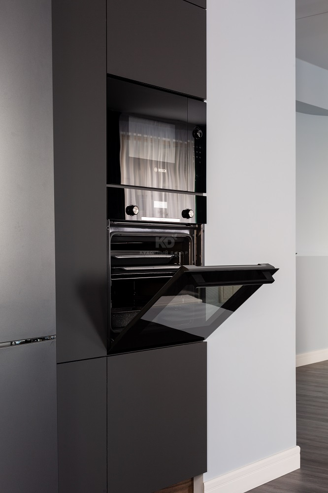 Главная её особенность – форма! «Ханна+Ноа» идеально вписана в помещение сложной трапециевидной формы, и при этом совершенно не перегружает пространство. Достичь этого эффекта помогло грамотное зонирование, а также лаконичность самой мебели. Кухня оснащена комбинированными фасадами: одни достались ей от модели «Ноа Павловния» и в совершенстве имитируют глубокую текстуру натурального дерева. Другие имеют уникальное «бархатистое» покрытие «Extra Touch Matt». Также в проекте использована система открывания «Space Line», благодаря которой модель выглядит сдержанно, и при этом эффектно.