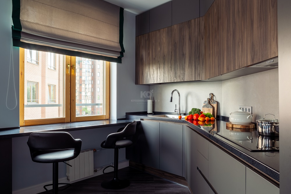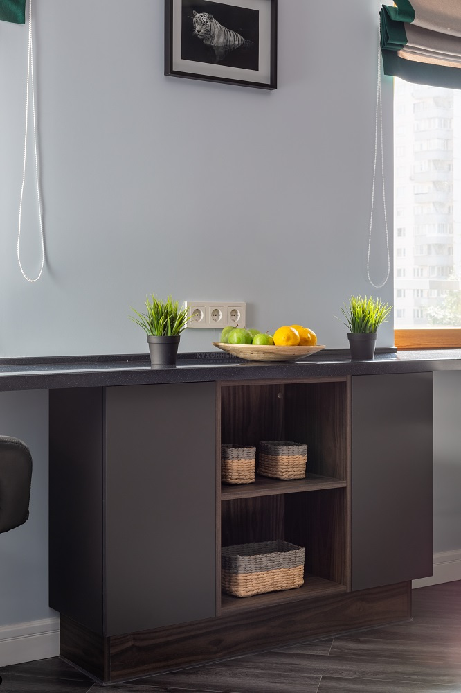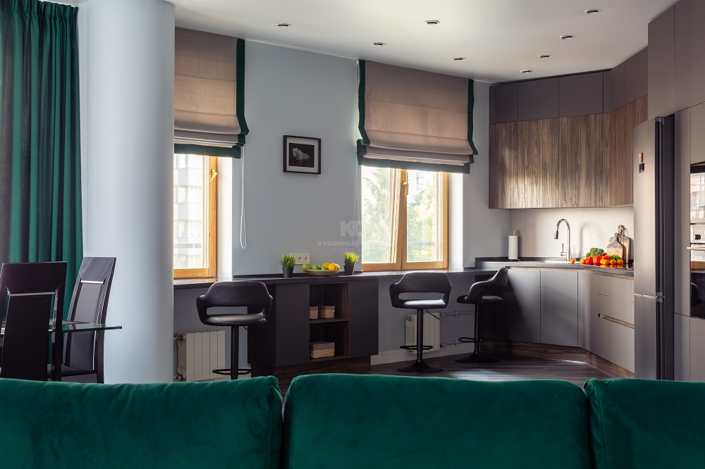 Ещё одна необычная черта проекта – сверхдлинная барная стойка. Она расположена в левой части кухни и охватывает сразу два окна. Стойка является продолжением кухонной столешницы и неотъемлемой частью общей композиции. Здесь можно с комфортом отдыхать или работать, любуясь видами!