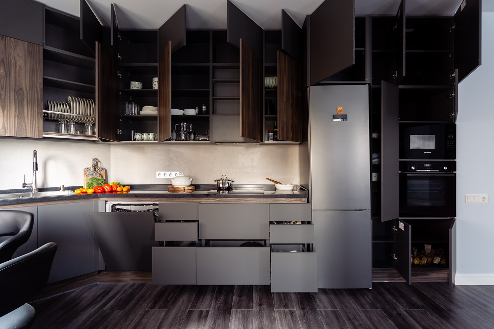 Гарнитур выполнен под потолок и имеет самое современное оснащение. В распоряжении хозяйки: огромное пространство для хранения продуктов и утвари, удобные органайзеры, мощная скрытая вытяжка, СВЧ и духовой шкаф на удобной высоте, вместительная посудомоечная машина и ещё тысяча полезных мелочей. На этой кухне и отдых, и кулинарное творчество приносят максимум удовольствия!