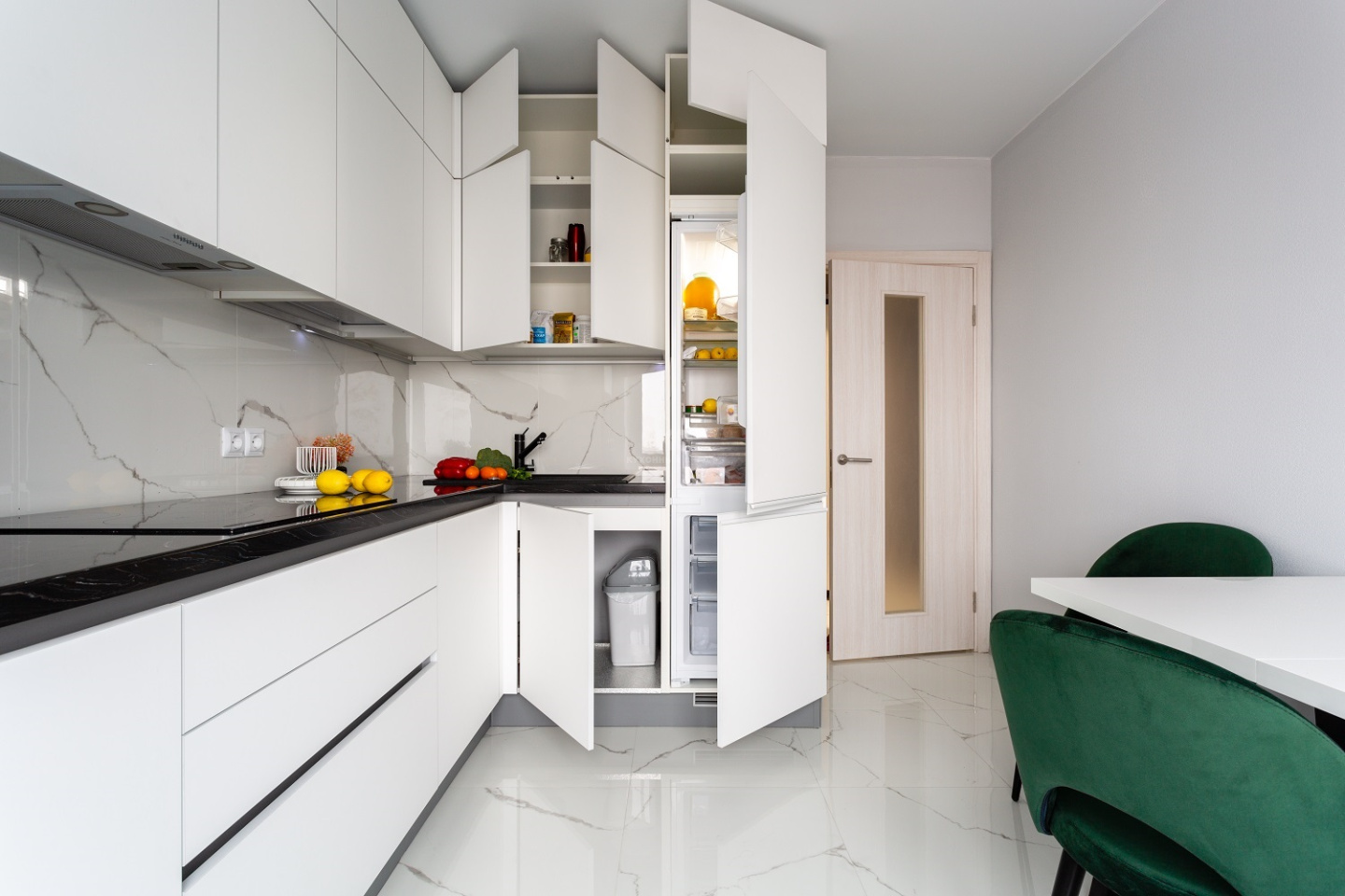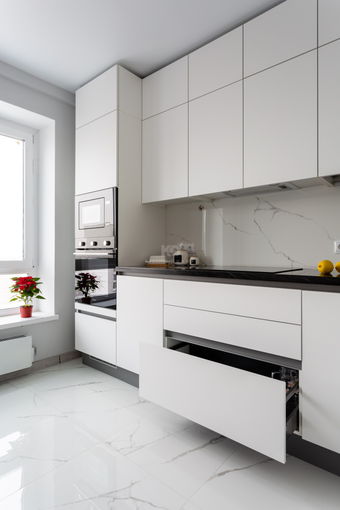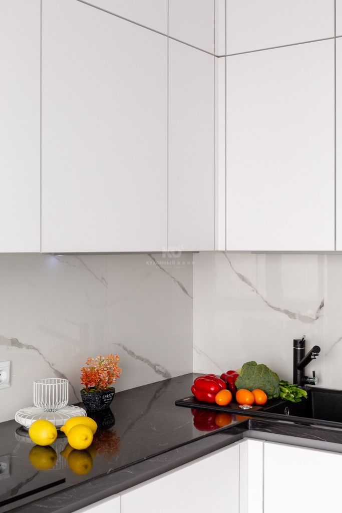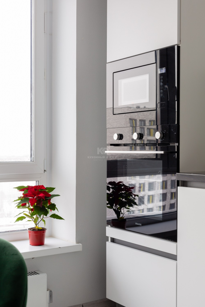 Стиль – первое слово, которое приходит на ум при взгляде на эту «Ханну». Она выполнена «под потолок» и использует модные цветофактурные контрасты. Белые фасады из МДФ с «бархатистым» покрытием «Extra Touch Matt» здесь прекрасно сочетаются с тёмной встроенной техникой, столешницей и системой открывания «Space Line». Система «Space Line» (SL) – то, что нужно для современного, лаконичного гарнитура. Она не только позволяет обойтись без видимых ручек, но и добавляет «Ханне» «скульптурной» выразительности. Так, эффект «приподнятой» столешницы здесь достигнут именно благодаря использованию «Space Line».
