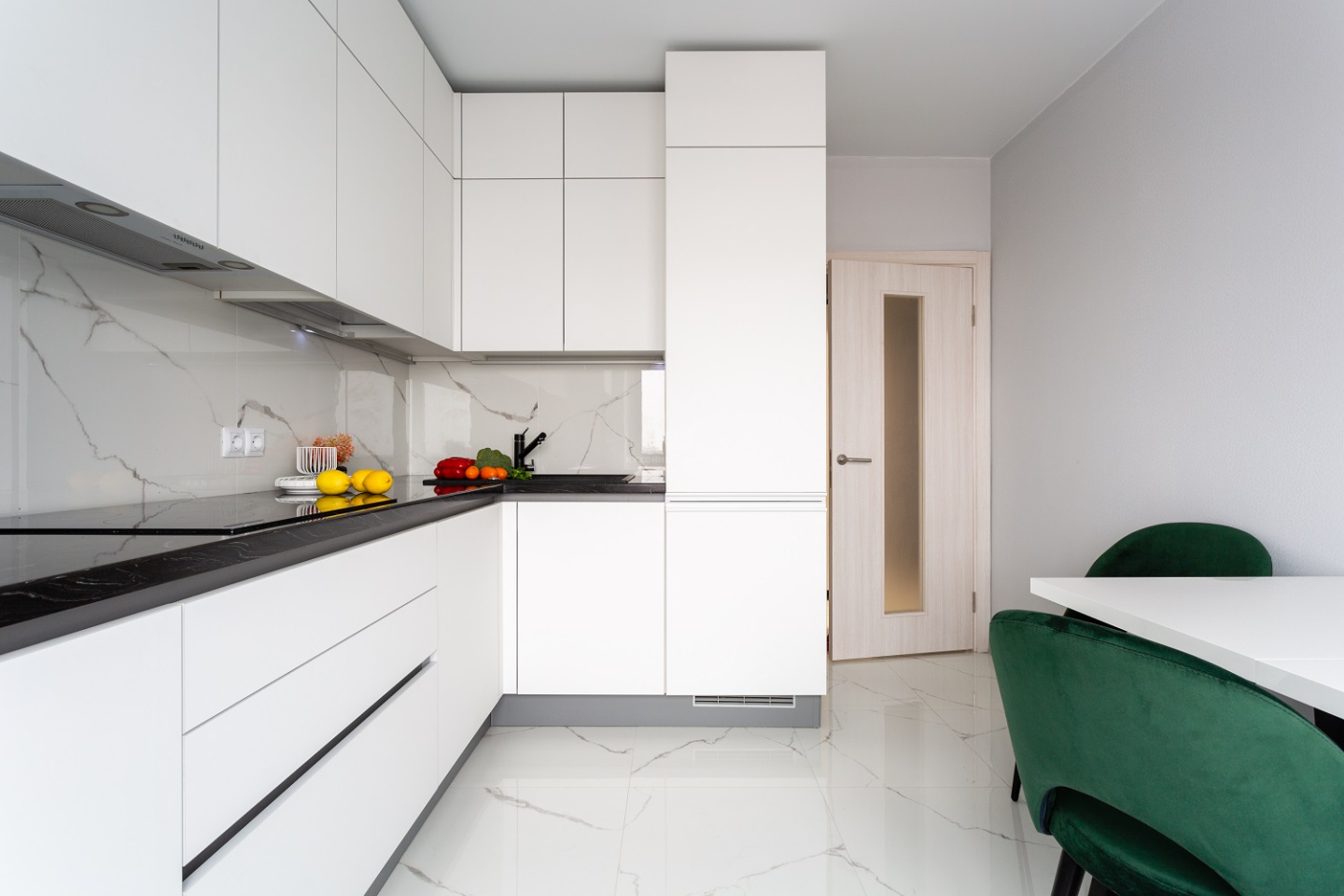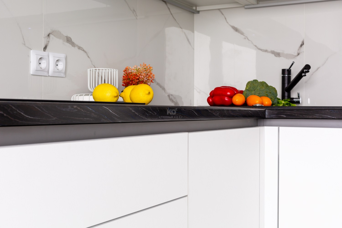 К слову о столешнице. Она создана из искусственного камня и имеет роскошный рисунок, который перекликается с текстурой фартука и напольного покрытия. Благодаря умелому подбору цветов и материалов дизайнеры, словно невидимыми нитями, связали весь интерьер воедино. А солнечный свет из высокого окна делает гармоничный облик «Ханны» поистине обворожительным.