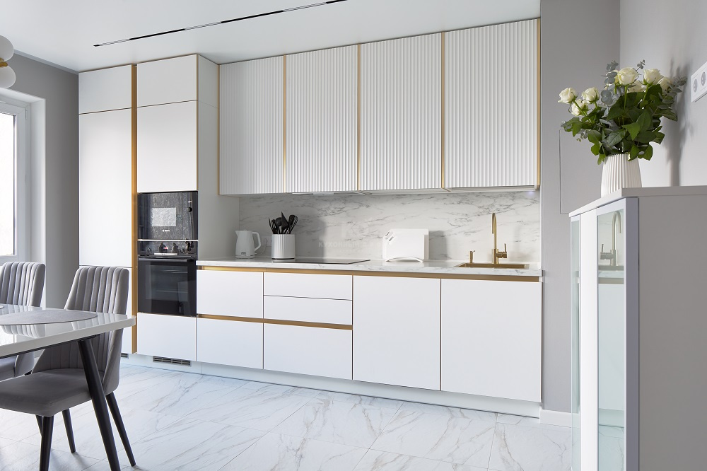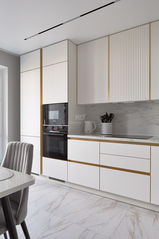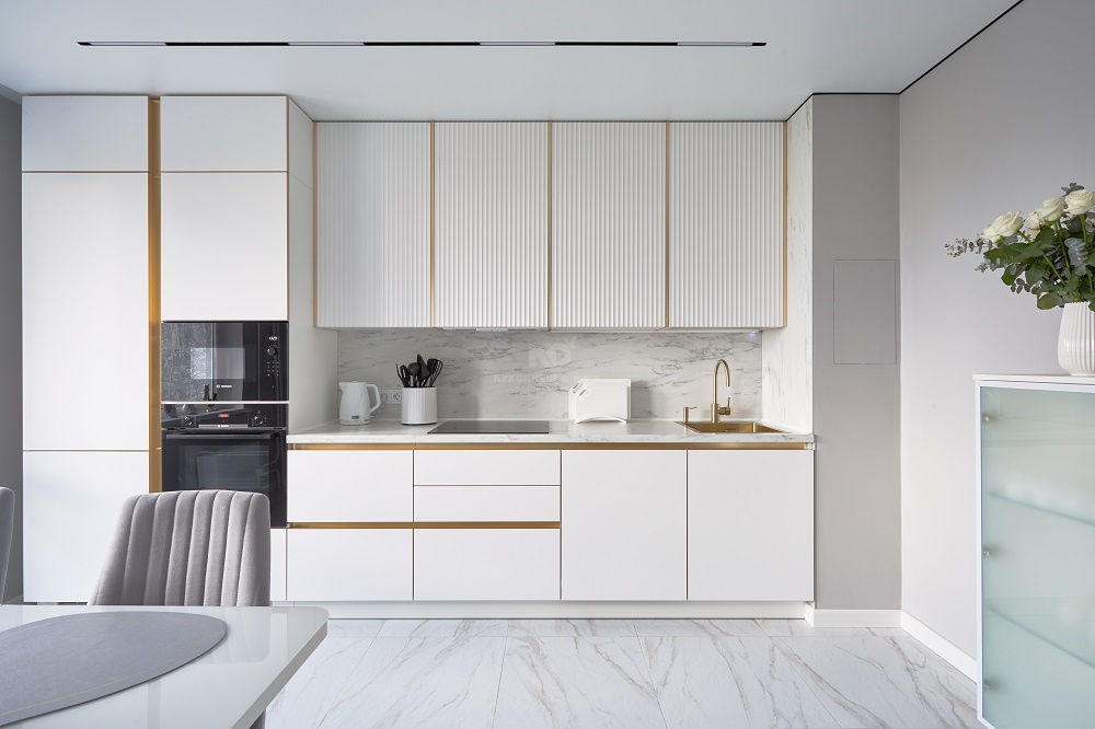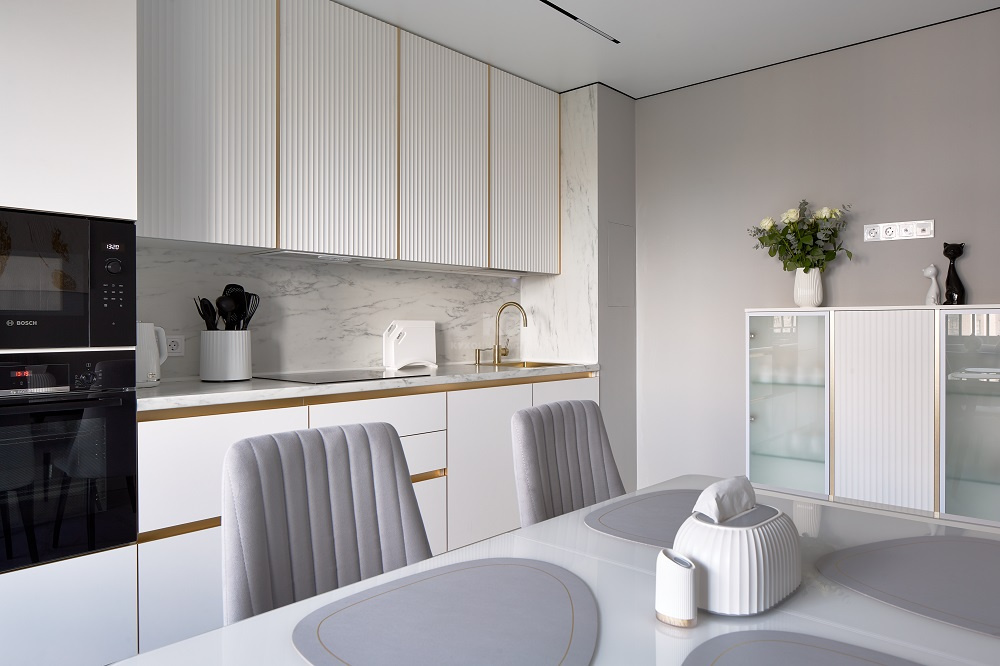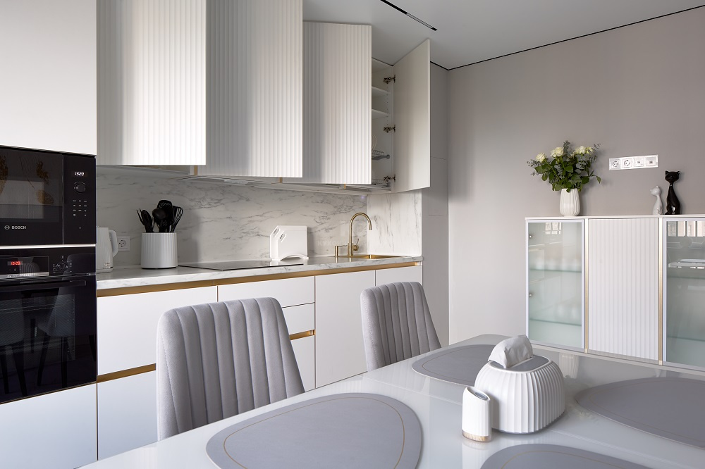 Эта кухня, прежде всего, пленяет своей колористикой. Два оттенка белого прекрасно сочетаются с блеском золота, чёрной техникой и мраморной текстурой фартука. Все фасады здесь созданы из МДФ, однако имеют разное покрытие. Пеналы и нижний ярус покрыты особым лаком «Экстра Тач Матт» с приятной, слегка «бархатистой» фактурой. А чуть утопленные фасады второго яруса – это уже МДФ + «дышащая» экомембрана. Фрезеровка этих фасадов вызывает ассоциации с античными колоннами и наполняет интерьер величественной, возвышенной красотой.