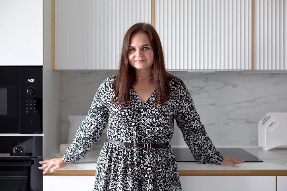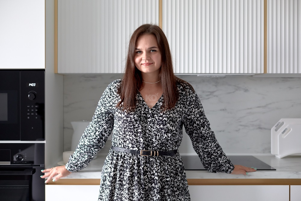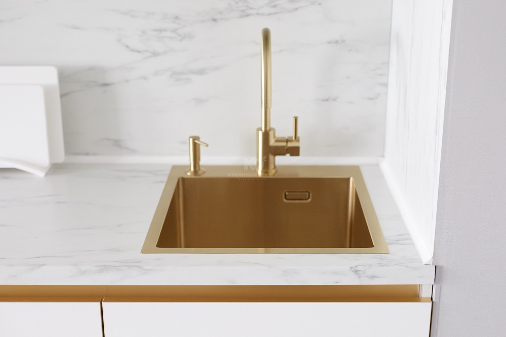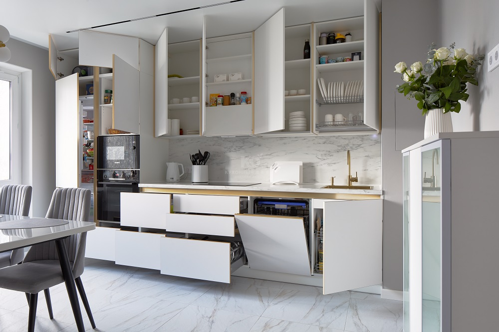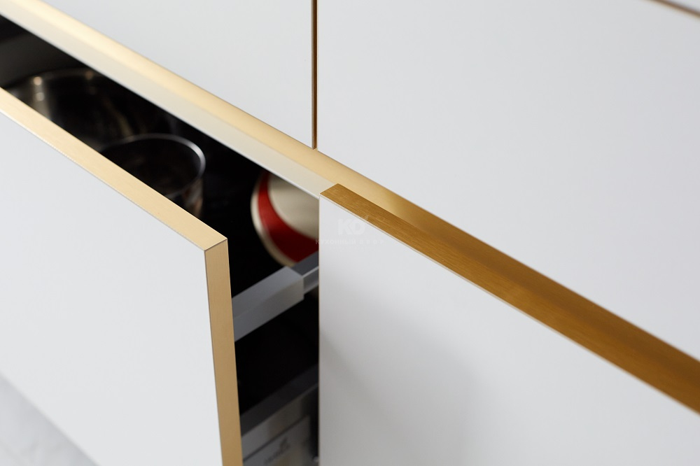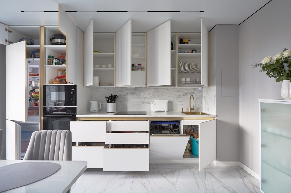 Эта кухня, прежде всего, пленяет своей колористикой. Два оттенка белого прекрасно сочетаются с блеском золота, чёрной техникой и мраморной текстурой фартука. Все фасады здесь созданы из МДФ, однако имеют разное покрытие. Пеналы и нижний ярус покрыты особым лаком «Экстра Тач Матт» с приятной, слегка «бархатистой» фактурой. А чуть утопленные фасады второго яруса – это уже МДФ + «дышащая» экомембрана. Фрезеровка этих фасадов вызывает ассоциации с античными колоннами и наполняет интерьер величественной, возвышенной красотой.