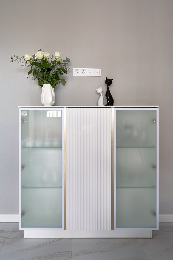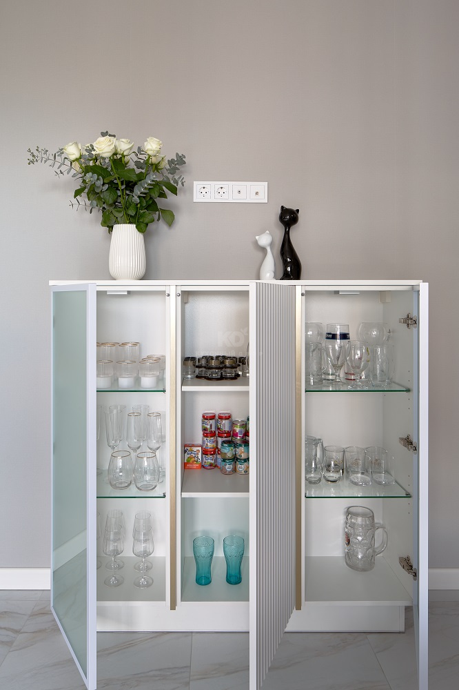 Недалеко от основной зоны кухни расположен небольшой, но вместительный буфет с матированными витражами. Внутри него прекрасно смотрится дорогая посуда! К слову, кухня в принципе получилась очень вместительной и функциональной. Помимо большого объёма внутреннего пространство здесь находится вся необходимая для современной хозяйки техника: скрытая вытяжка, индукционная варочная панель, СВЧ и духовой шкаф, встроенный холодильник, а также полноразмерная посудомоечная машина.