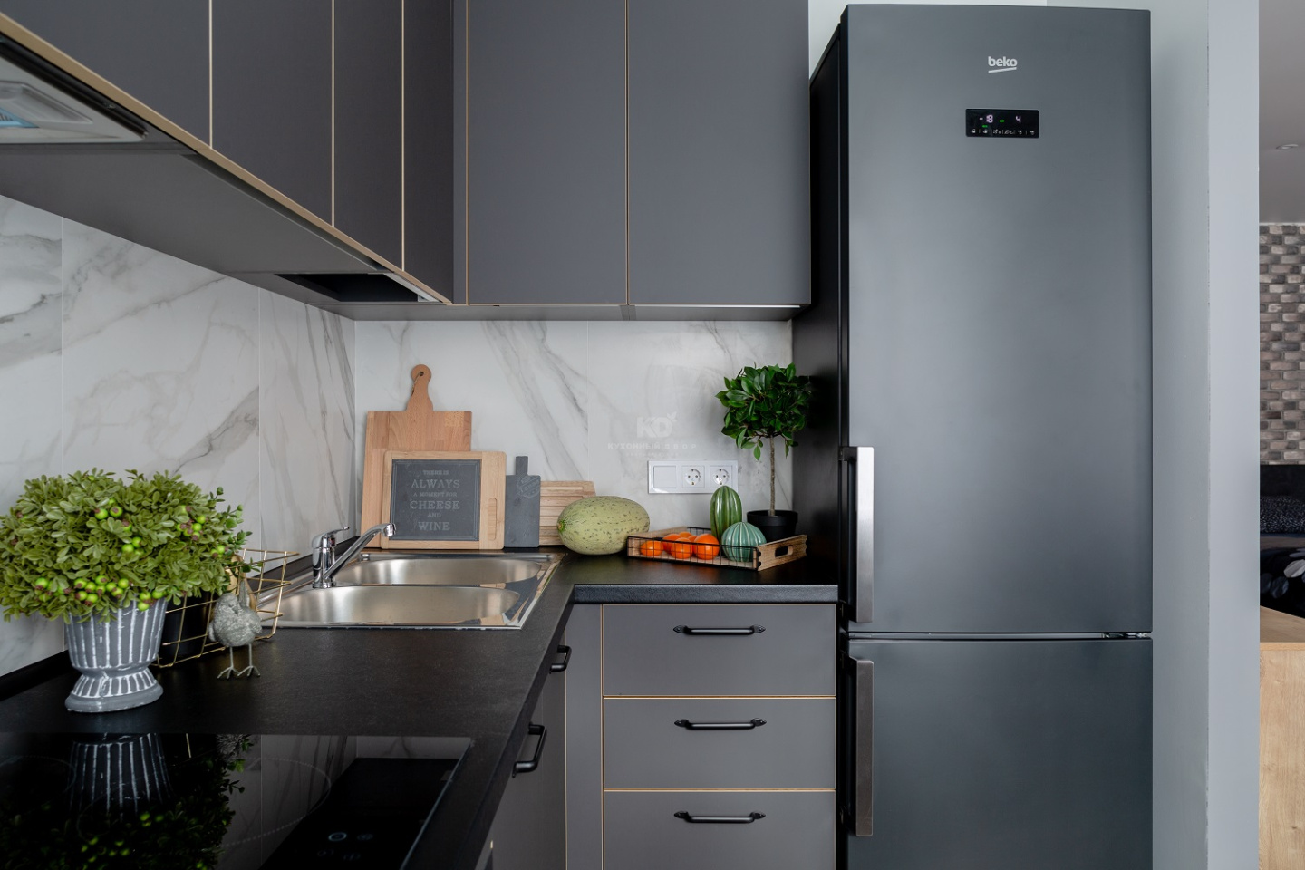 Вместе с Александрой нам предстояло создать гарнитур для уютной квартиры-студии площадью 40м2. А что нужно, чтобы студия выглядела по-настоящему красиво? Нужна кухня, которая будет гармонировать со всем окружающим интерьером! Здесь этой кухней стала «Ханна Стил». Ее серые «бархатистые» фасады «Extra Touch» безукоризненно вписались в общую стилистику помещения. Кухня полностью и всецело поддержала любовь своего хозяина к «лофту», а заодно внесла в интерьер оригинальные нотки. Взгляните, как изящно ее облик подчёркнут уникальными «золотистыми» кромками! Эти кромки – еще одна уникальная черта модели «Ханна Стил». Они добавляют облику кухни объёма и делают ее потрясающе выразительной!