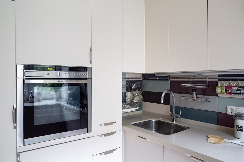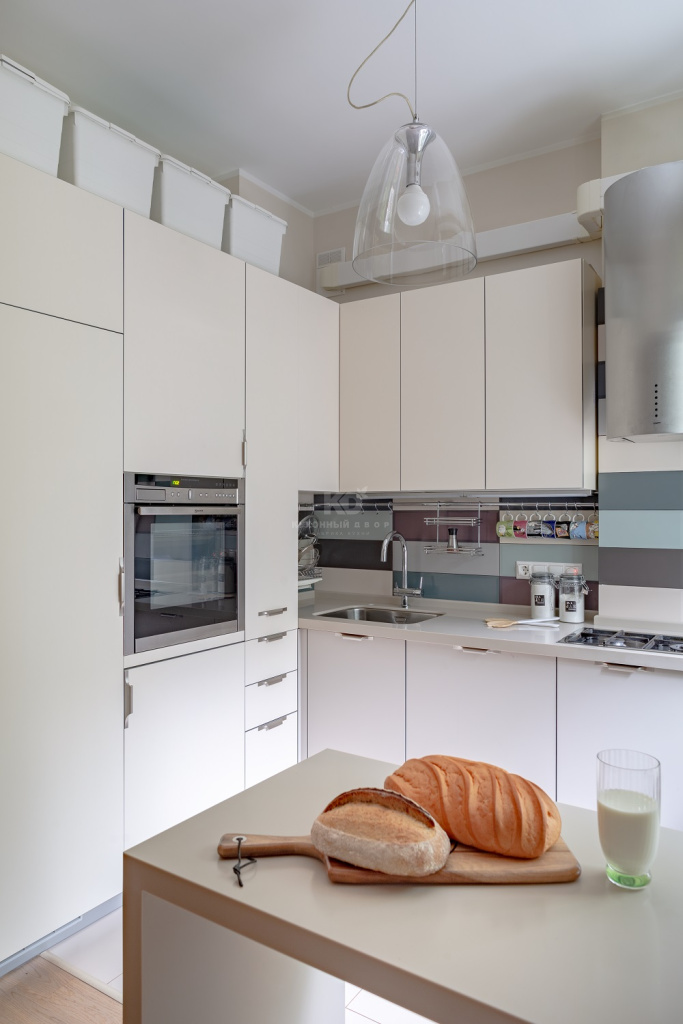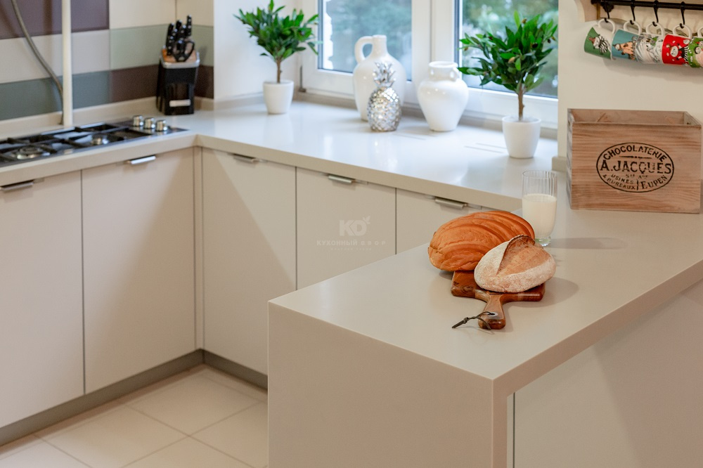 Фасады этой «Ханны Стилы» имеют очень приятный цвет, полностью идентичный цвету стильной столешницы из искусственного камня. Выполненная в единых кремовых тонах, кухня выглядит удивительно лёгкой и «воздушной». Как говорит Тутта Ларсен, ее «Ханна Стил» лёгкая и аппетитная, словно зефирка! Но столь невесомый облик выглядел бы неестественно без выразительных контрастов. Здесь их роль выполняют «стальные» ручки и кромки фасадов. Они гармонично сочетаются с современной бытовой техникой, «прорисовывают» контуры кухни и придают её красоте окончательную завершенность.
