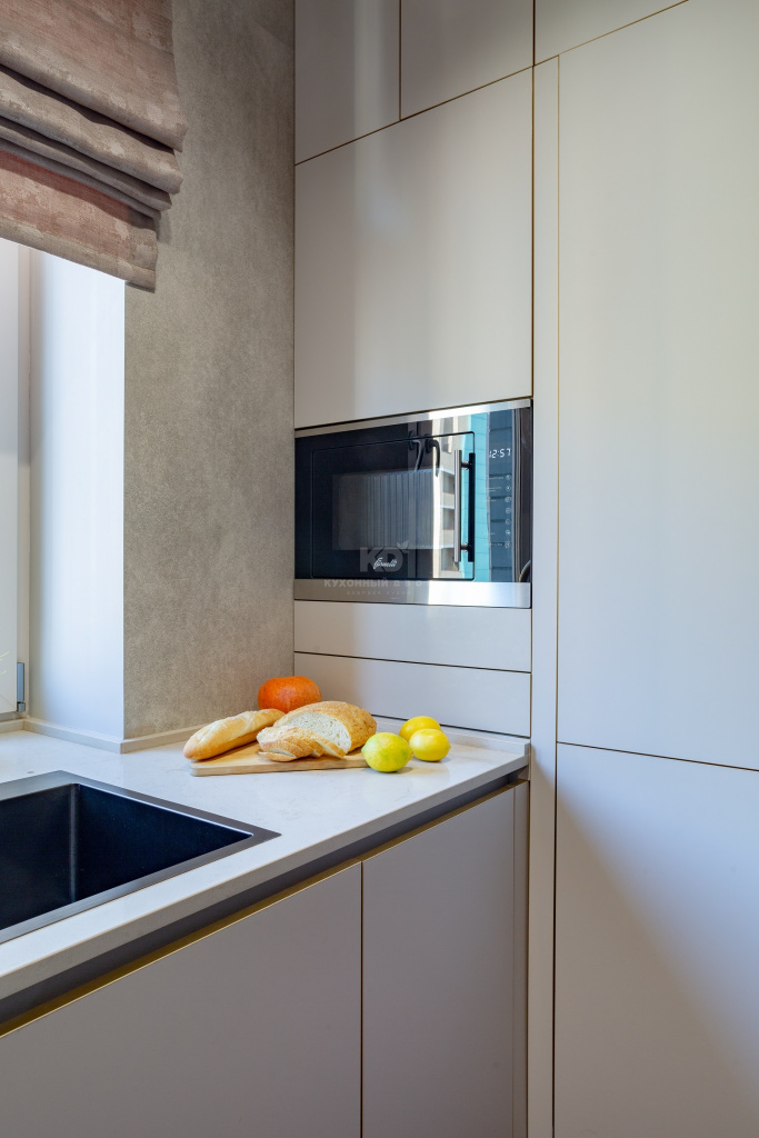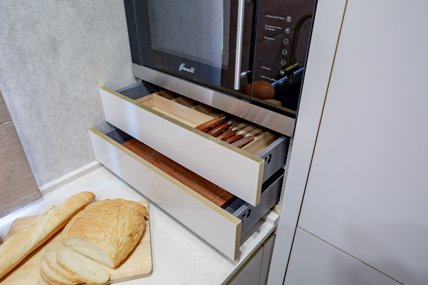 Зона 1 – золото и кашемир. Так «одет» нижний ярус, а также модули с холодильником и СВЧ. «Бархатистые» фасады Extra Touch Matt с роскошными кромками в цвет золота задают тон всему интерьеру! Кухня получила «воздушную», но, вместе с тем, благородную внешность! В семье Александровых эта зона особенно приглянулась маме Диане и дочке Даше!