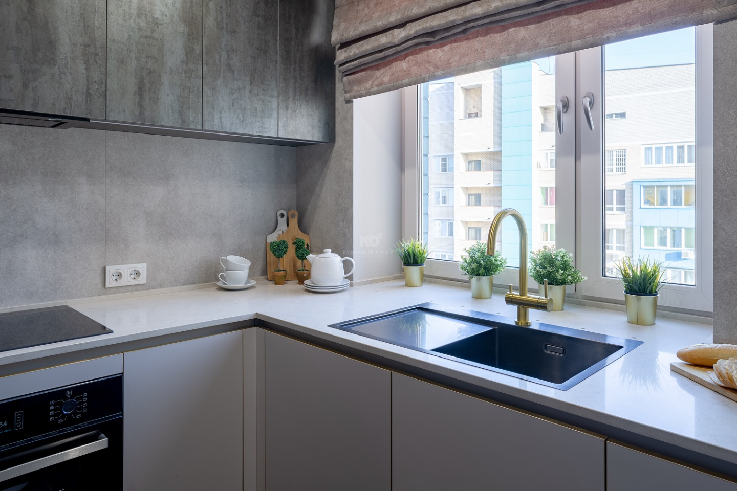 Зона 2 – надёжность камня. Взгляните на второй ярус над варочной панелью! Фасады там выглядят так, словно созданы из камня. Это решение вносит в интерьер элемент надёжности и мужской энергетики. Глава семейства Михаил объявил эту часть кухни своей и только своей!
