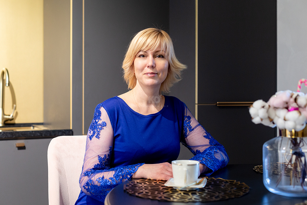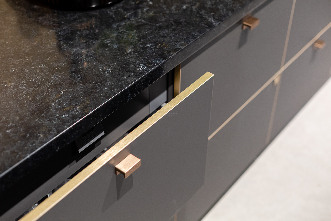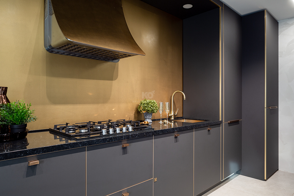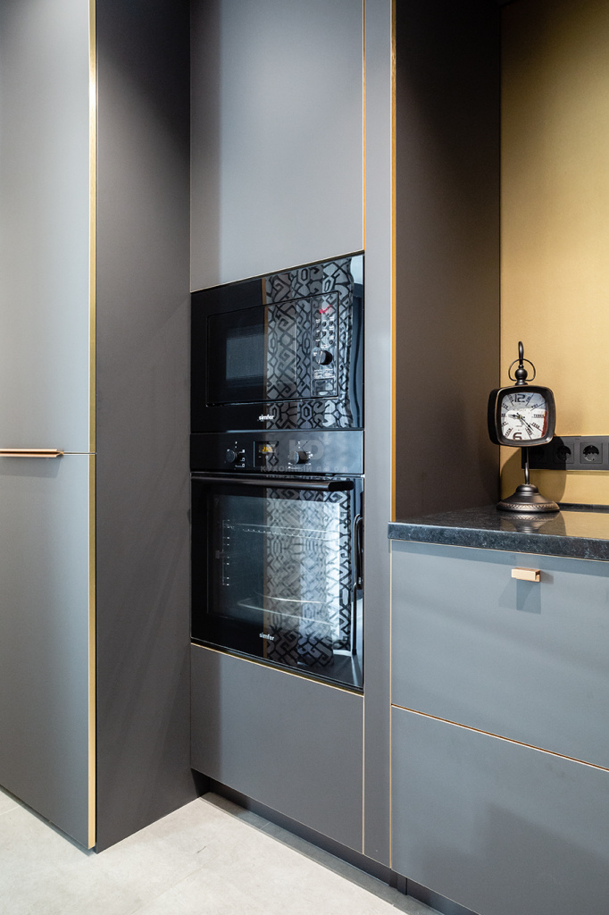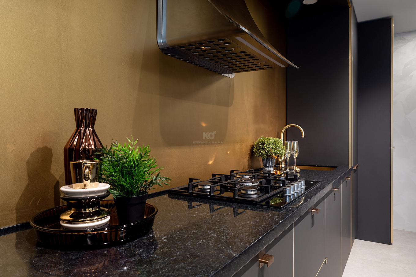 Мы сотворили кухню, соединившую в себе элегантность, функциональность и нестандартные дизайнерские решения. За основу была взята уже полюбившаяся всем новинка, «Ханна Стил». Ее бархатистые фасады «Extra Touch Matt» с контрастными золотыми кромками великолепно смотрятся в просторном помещении! Красота «Ханны» неоспорима, равно как и удобство. В этом проекте дизайнеры «KD-Lab» сделали ставку на строгую, симметричную архитектуру. В центре композиции – уникальная вытяжка нестандартной формы, которая выводит «Ханну» в эпицентр всеобщего внимания. Кстати, цвет вытяжки, фартука, ручек и смесителя перекликается с цветом кромок, благодаря чему облик модели выглядит цельным и завершенным.