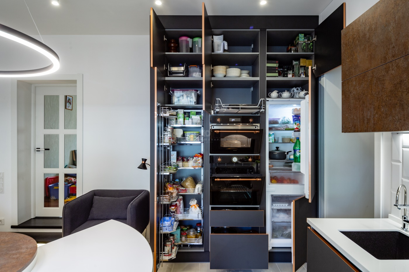 Вообще не только остров, но и весь гарнитур продуман до мелочей в плане внутреннего оснащения. «Ханна Стил» изобилует удобными полками, выдвижными системами и полезными аксессуарами. На этой кухне найдётся всё необходимое для создания самых сложных кулинарных шедевров. Отныне здесь каждый завтрак, обед и ужин будет незабываемым!