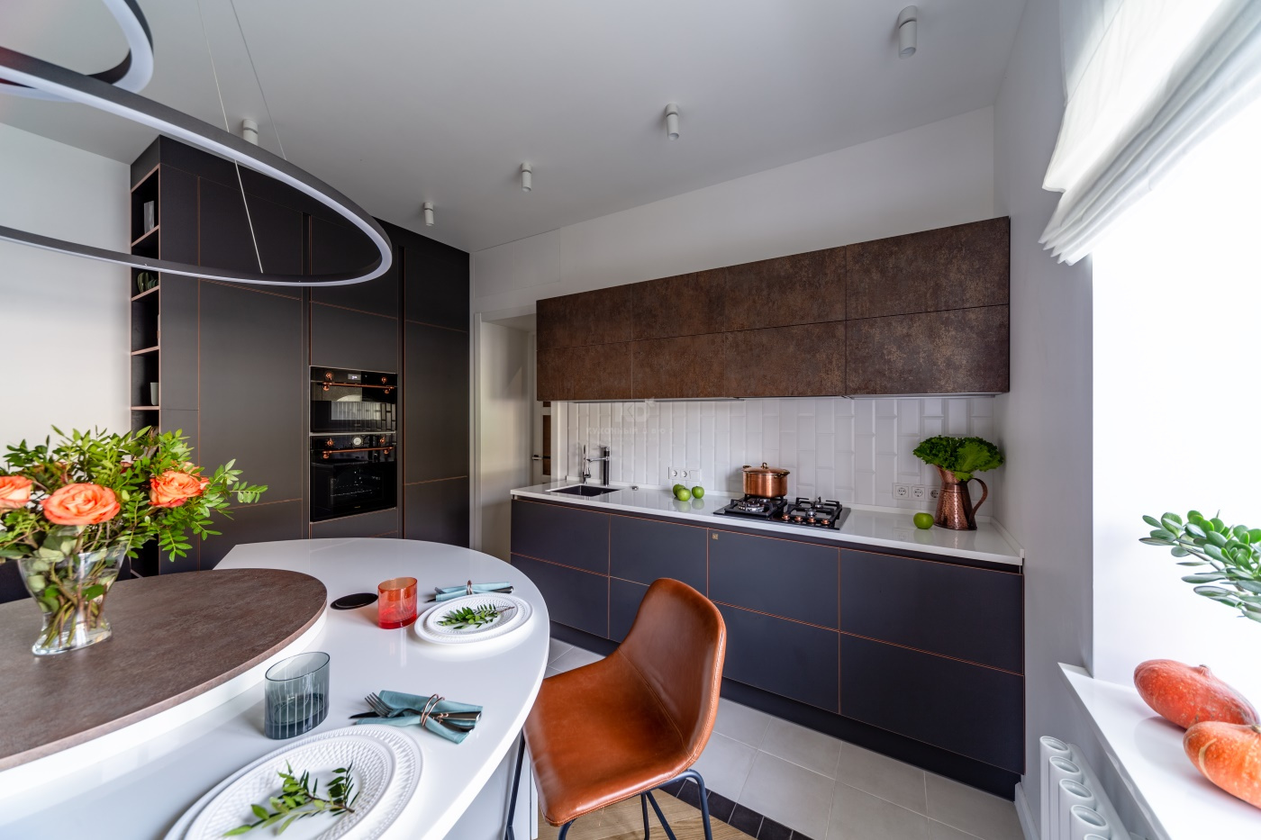 Нижний ярус этой кухни, а также зона с духовкой, холодильником и СВЧ выполнены в благородном графитовом цвете. Фасады из МДФ имеют уникальные декоративные кромки «под медь». Они подчёркивают строгую геометрию модели и придают ей особую энергетику. Кухня будто сияет изнутри тёплым, согревающим пламенем.