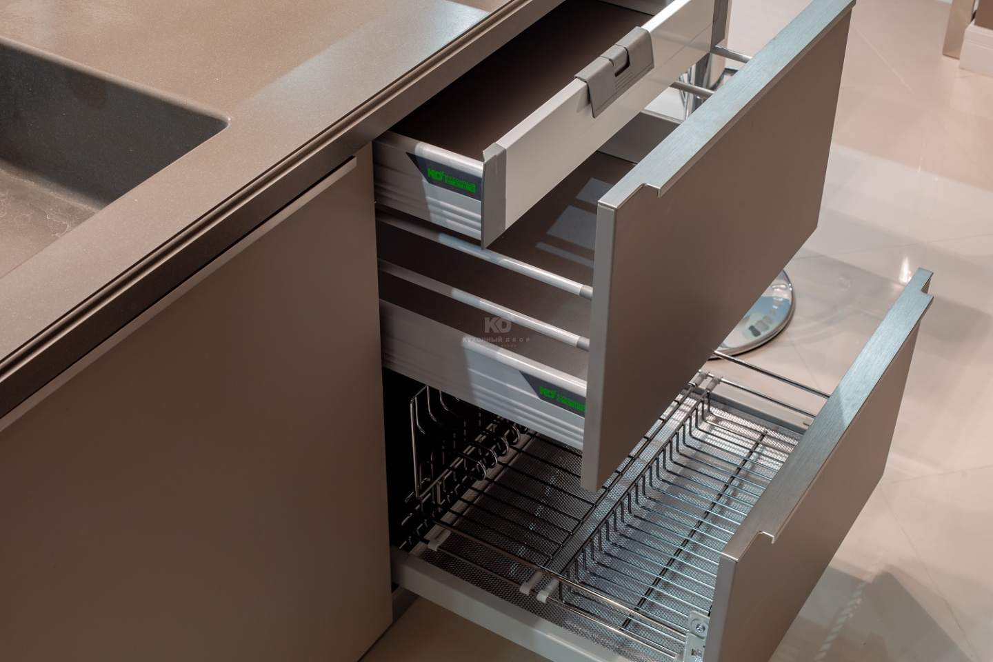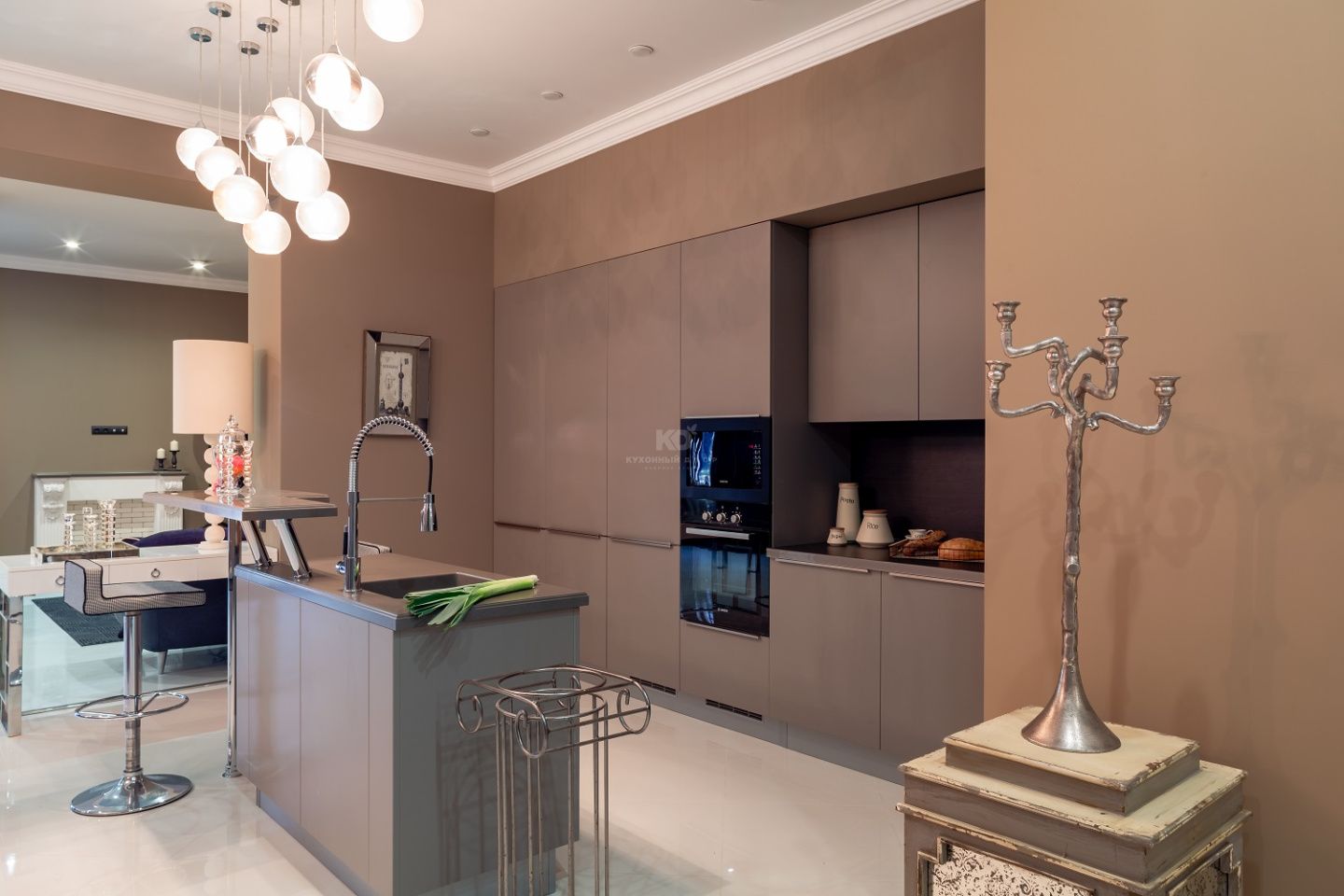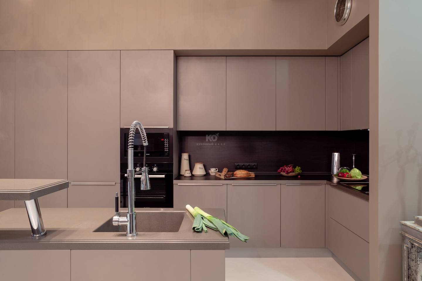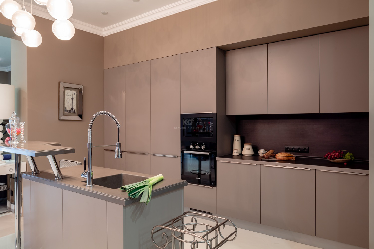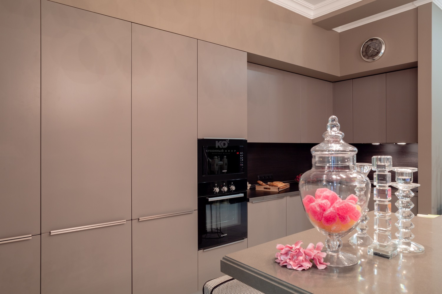 Для реализации проекта Елена выбрала модель «Ханна Стил» с фасадами «Extra Touch Matt». Их бархатистая текстура великолепно смотрится в мягких, благородных цветах. И хорошо перекликается с окружающим пространством! Оттенок фасадов чуть темнее цвета стен. Благодаря такой палитре кухня кажется продолжением интерьера: она одновременно и ненавязчива, и выразительна.