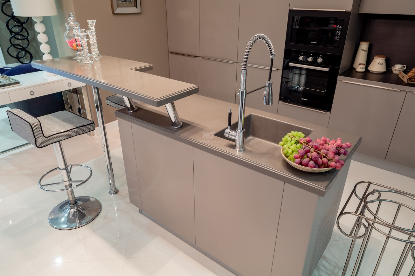 Еще одна особенность проекта – наличие двух типов столешниц. В угловой рабочей зоне столешница имеет тёмный цвет и древесную фактуру, которая прекрасно сочетается с фартуком под тёмное дерево. А поверхности острова и барной стойки выполнены в камне. Елена словно подчёркивает: ее остров – настоящий «центр силы»! Он, словно мостик, связывает пространство кухни и гостиной. А еще одновременно служит зоной готовки и стильным местом для отдыха. – «Готовить и отдыхать с комфортом!», – отличный девиз для этих интерьеров!