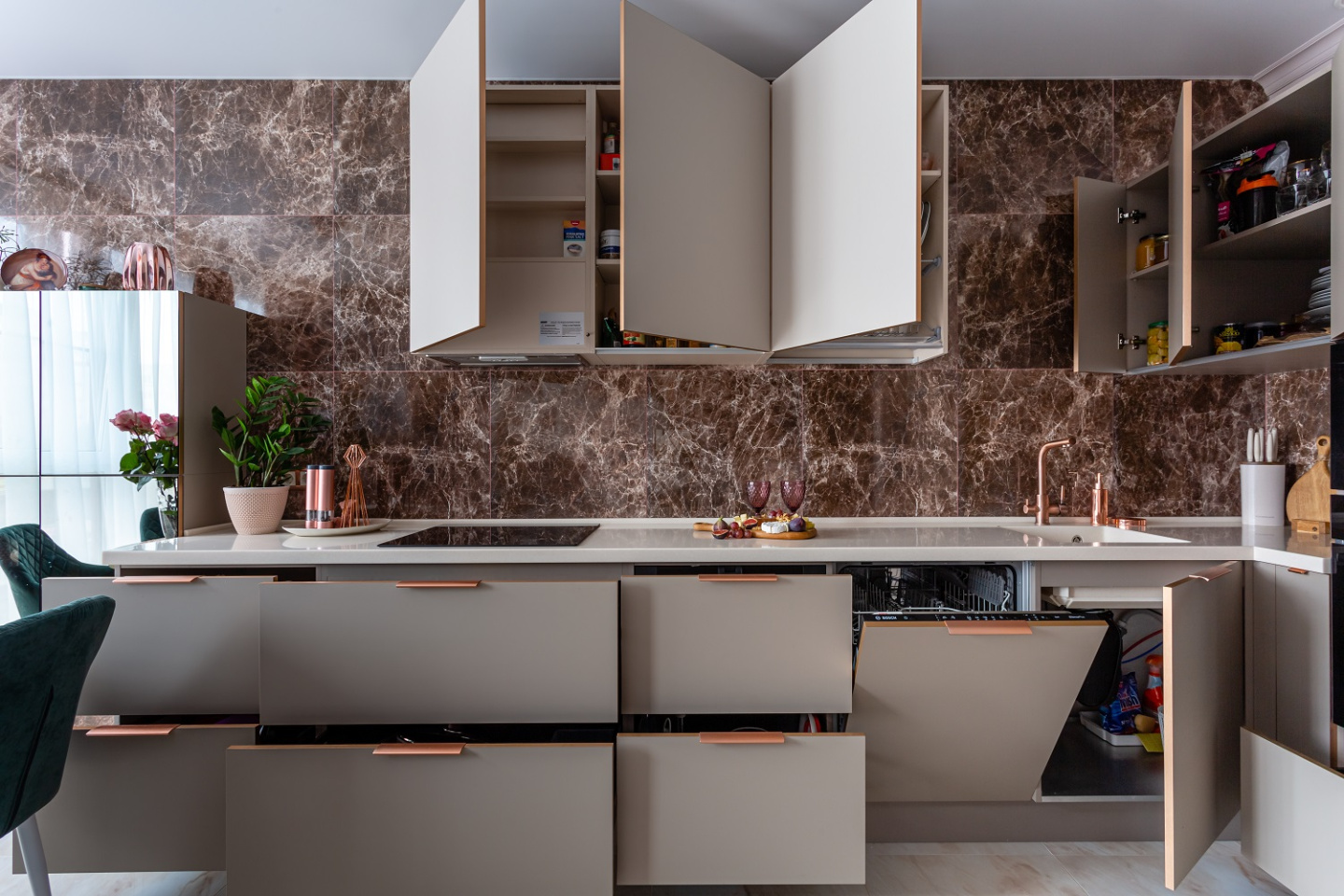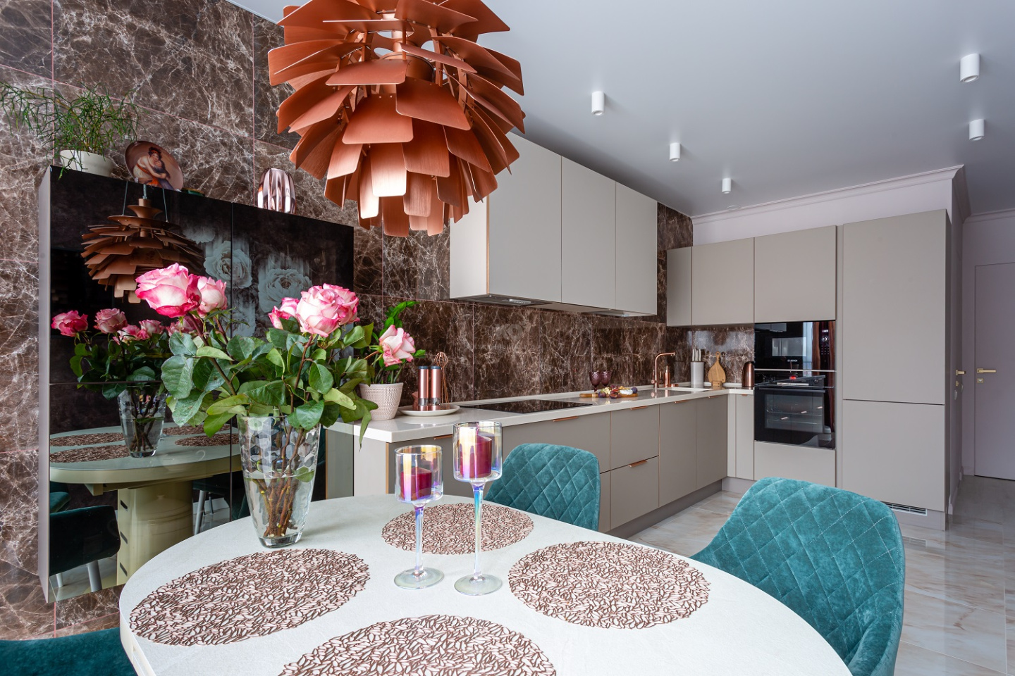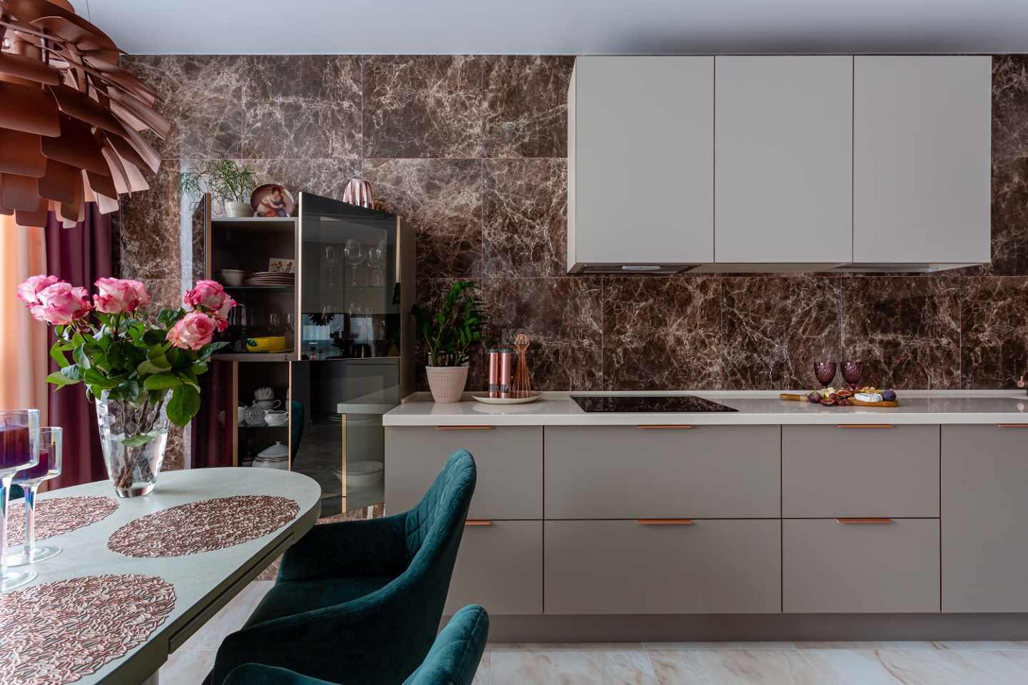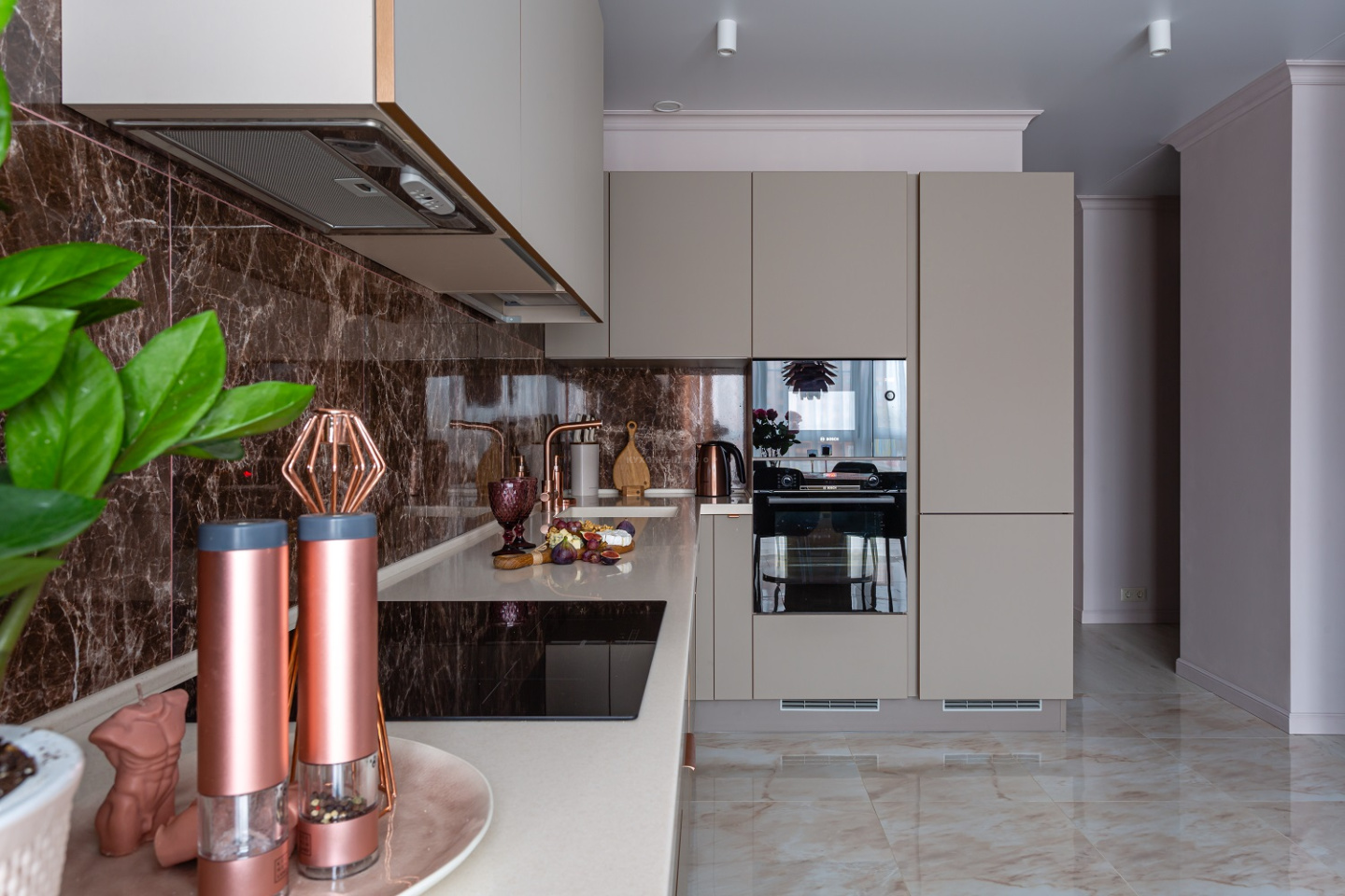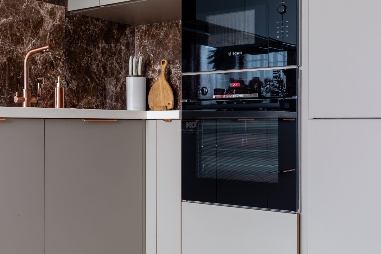 Секрет эффектной внешности здесь, прежде всего, в грамотно подобранной палитре. «Бархатистые» фасады «Ханны Стил» с поверхностью «Extra Touch Matt» имеют пастельно-бежевый цвет, который прекрасно сочетается с интерьерами помещения. А контрастные акценты на торцах, ручки и смеситель выполнены «под медь», идеально перекликающуюся с фартуком и окружающим декором.