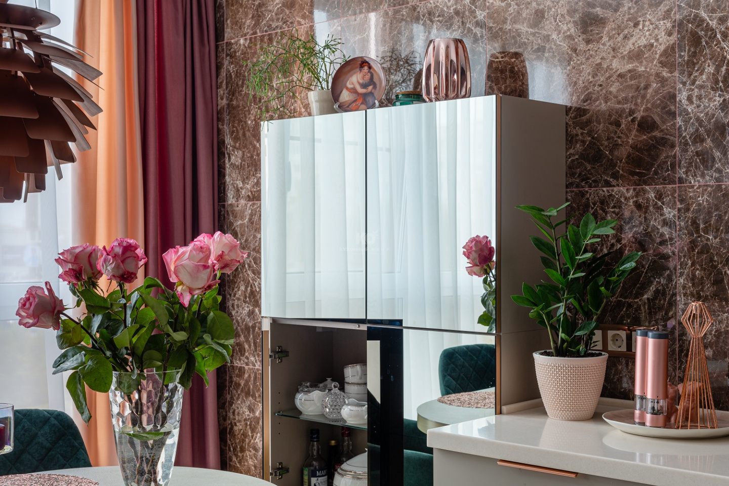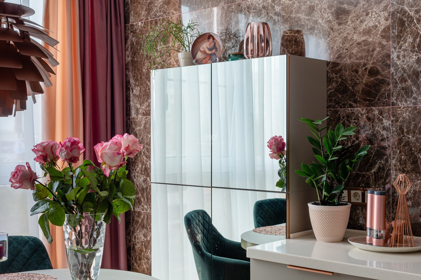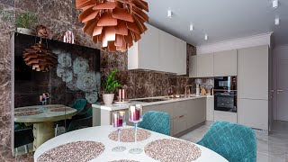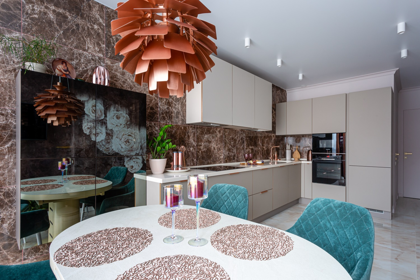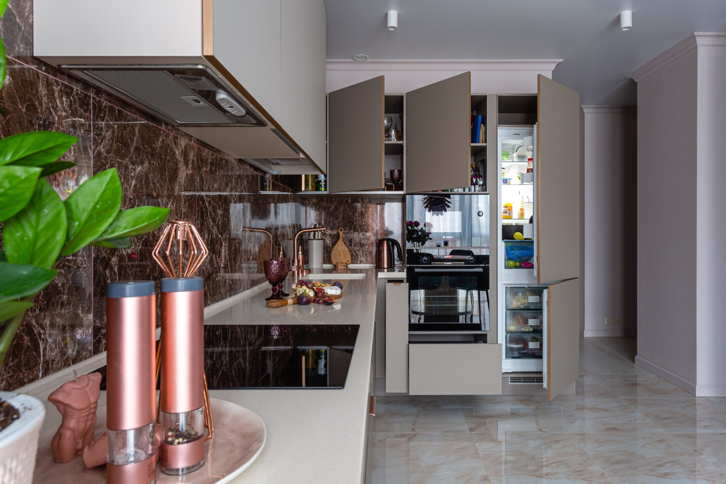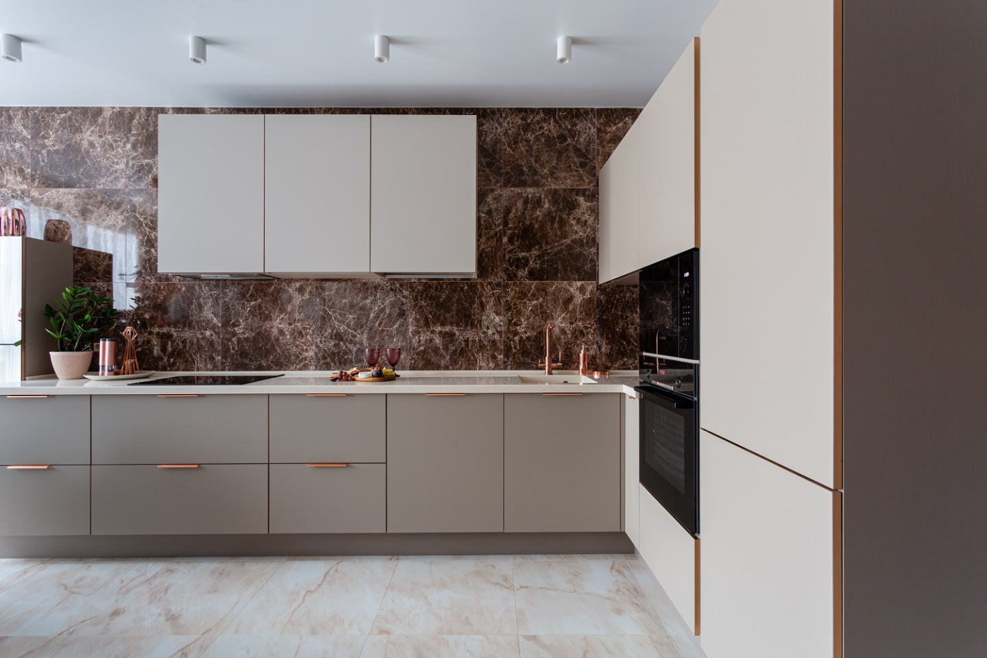 Секрет эффектной внешности здесь, прежде всего, в грамотно подобранной палитре. «Бархатистые» фасады «Ханны Стил» с поверхностью «Extra Touch Matt» имеют пастельно-бежевый цвет, который прекрасно сочетается с интерьерами помещения. А контрастные акценты на торцах, ручки и смеситель выполнены «под медь», идеально перекликающуюся с фартуком и окружающим декором.