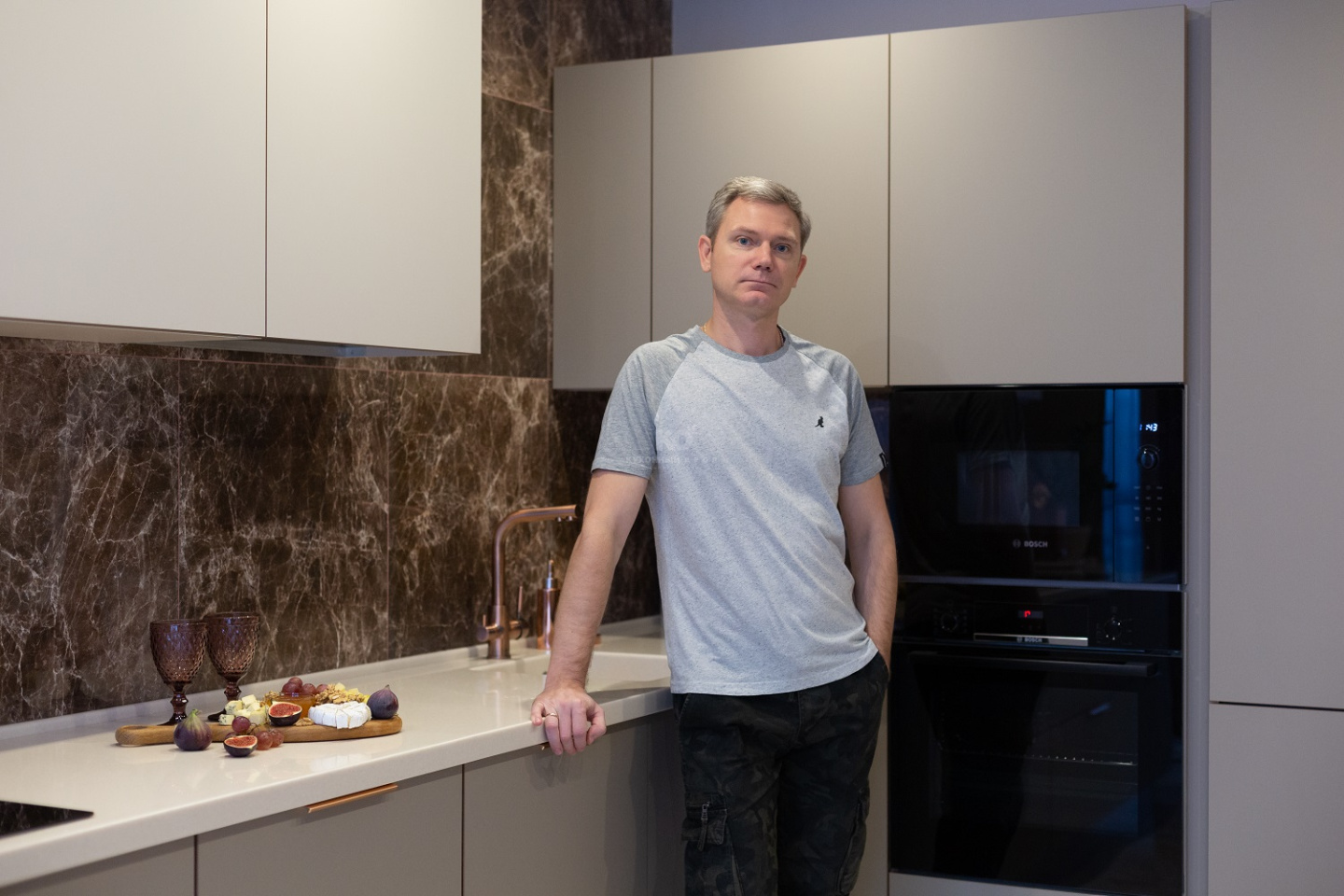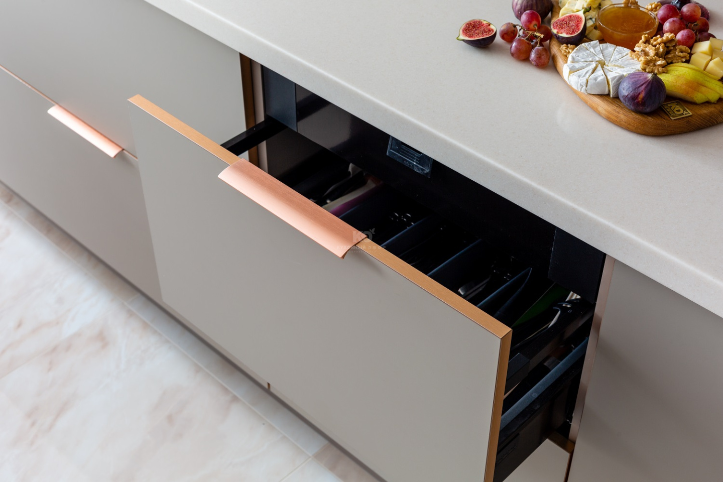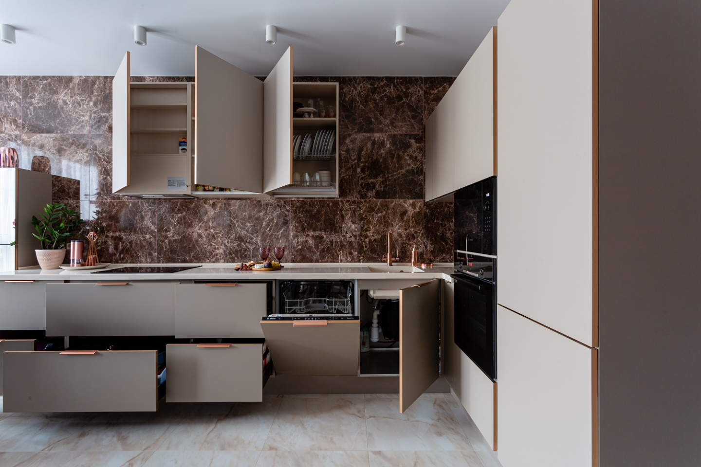 И пара слов об эргономике. Кухня выстроена Г-образно, так что все её элементы находятся в зоне комфортного доступа. В «короткой» части «Ханны» мы разместили встроенный холодильник, духовой шкаф и СВЧ на удобной высоте, а также несколько вместительных ящиков. Длинная же часть оснащена полноразмерной посудомоечной машиной, множеством ящиков-тяжеловесов, мощной варочной панелью, а также мойкой с системой фильтрации воды и измельчителем пищевых отходов. Готовить здесь – не труд, а самое настоящее удовольствие!