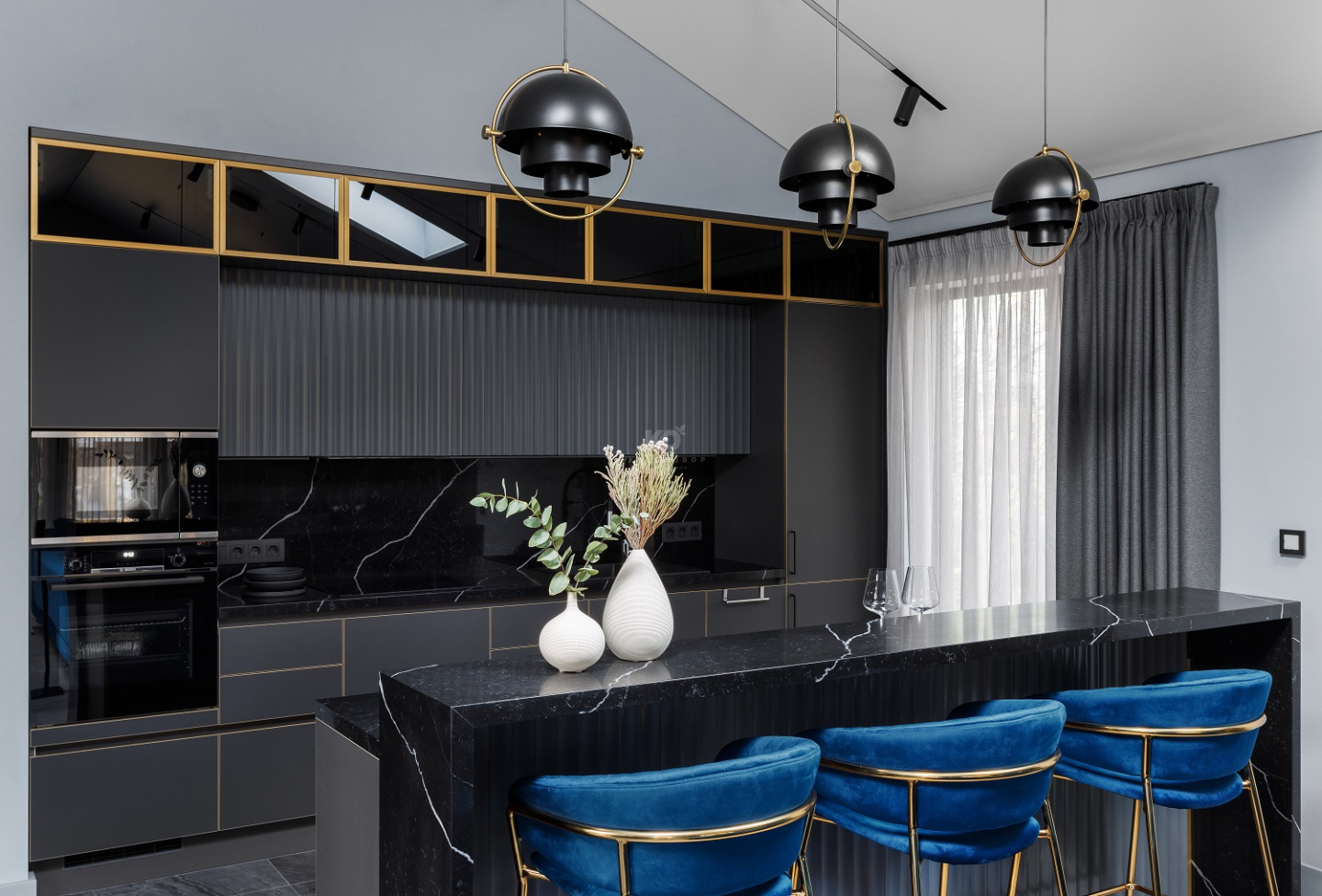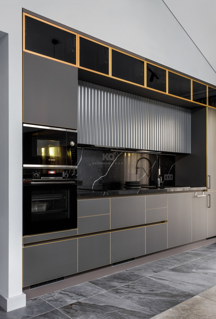 Почему гибридная? Потому что кухня создана из двух моделей – «Ханны СтилSL» и «Патриции». От «Патриции» ей достались поверхности с вертикальной фрезеровкой (МДФ + матовая эмаль), а от «Ханны» – остальные элементы. Все фасады выполнены в благородных тёмных оттенках, и почти каждый подчёркнут «золотыми» акцентами на торцевых частях. Антресоли же имеют тонированное остекление и алюминиевые рамки, также оформленные «под золото».
