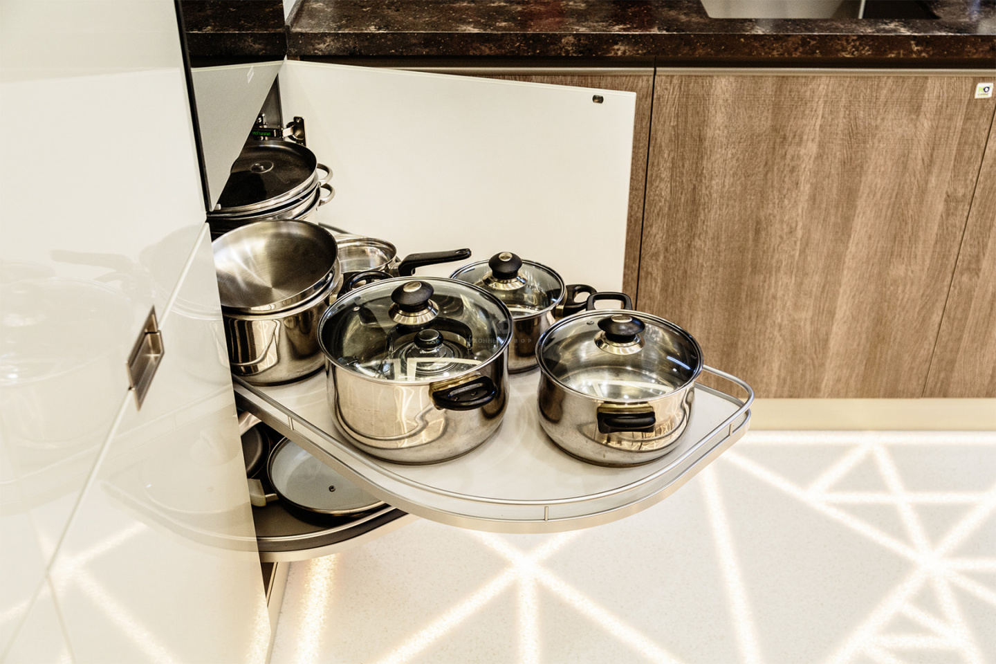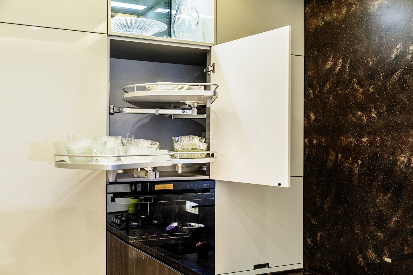 Максимально использовать пространство под столешницей позволяют ящики-тандембоксы для хранения полотенец или салфеток и отделениями для кухонной утвари. Верхнее отделение для вилок и ложек снабжено специальной ручкой-поводком. Если ее нажать, маленький ящик откроет доступ к двум ящикам, которые расположены под ним.