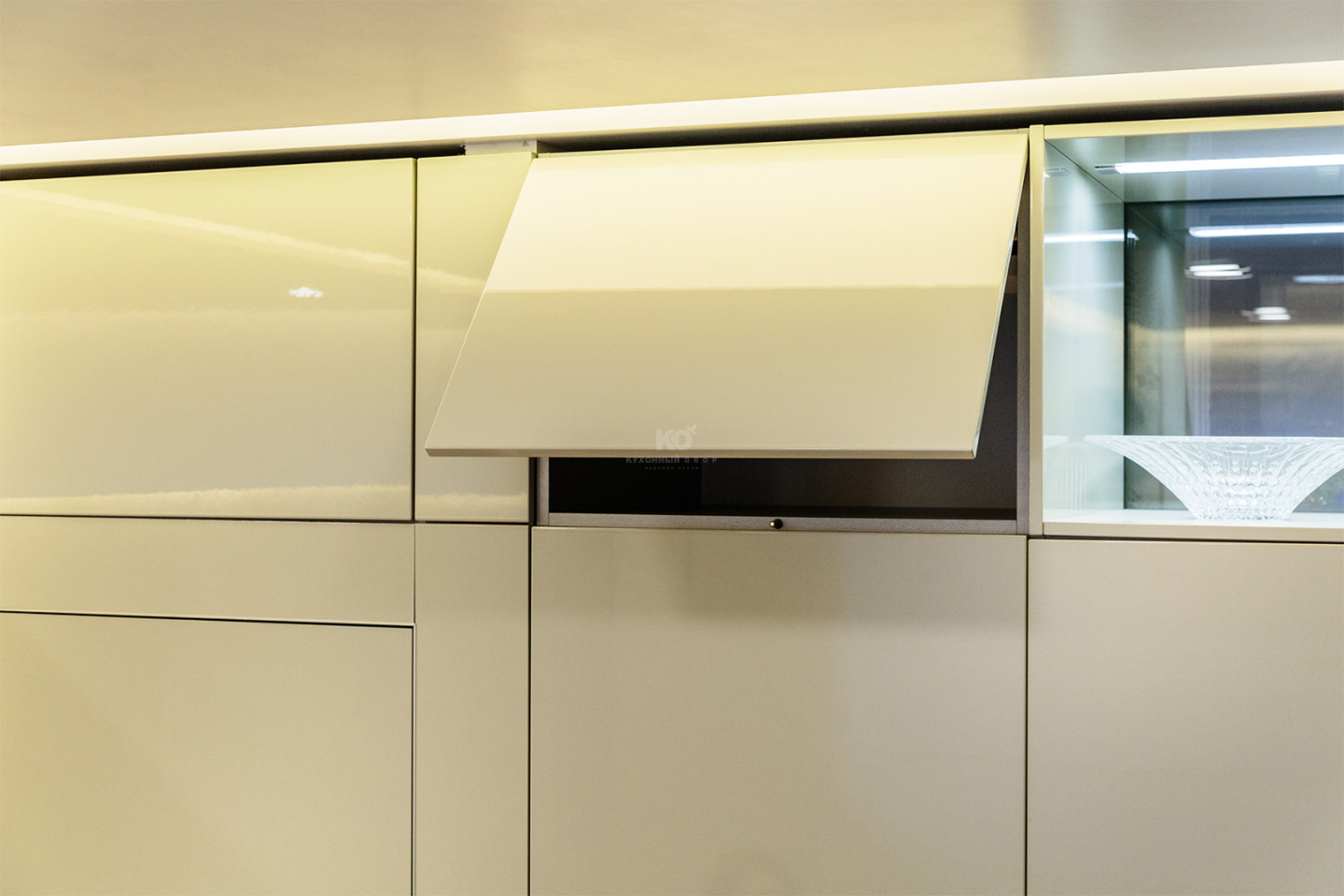 Кухонный гарнитур распланирован буквой Г. Всю боковую стену занял разбитый на секции шкаф, в который интегрирована кухонная дверь, а также вписано небольшое окошко в стене между кухней и ванной. Кроме окошка среди глянцевых плоскостей выделяется только духовой шкаф. Такое решение было продиктовано функционалом кухни, которая в двухкомнатной квартире нередко служит гостиной.