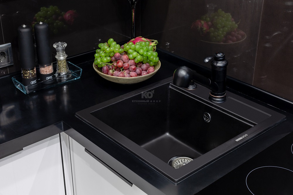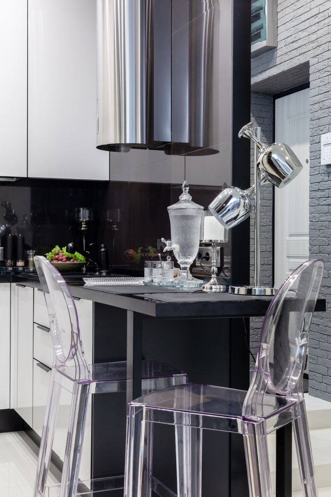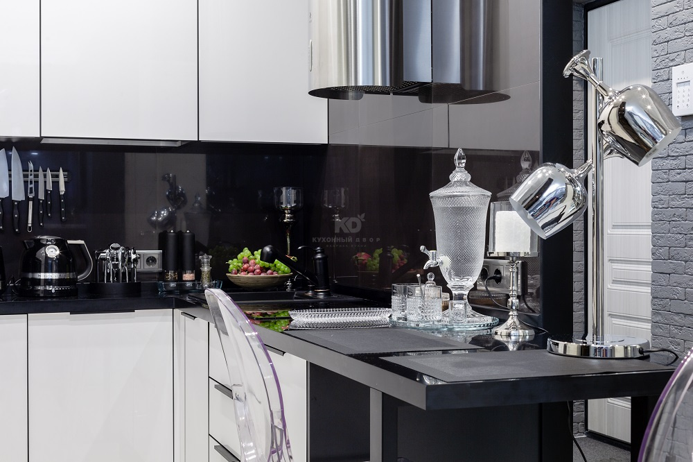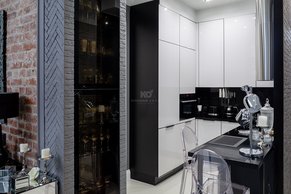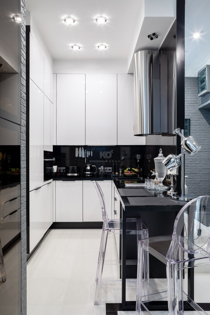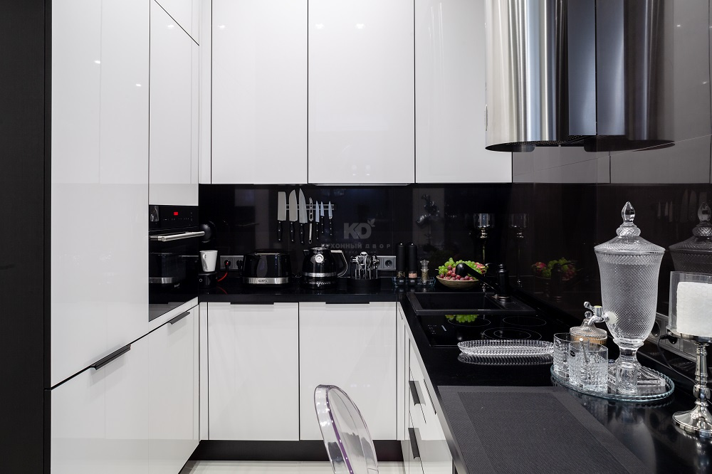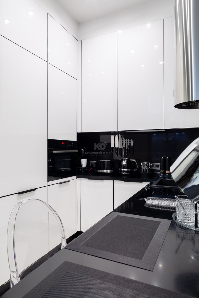 Разрабатывая «Мондриану», дизайнеры «KD-Lab» вдохновлялись картинами знаменитого голландского художника, Пита Мондриана. Стандартная внешность модели – это микс чёрного, белого, голубого, жёлтого и красного цветов. Оказалось, что кухня не растеряет своего великолепия, если оставить из этой палитры лишь чёрный и белый! Елена решилась именно на такую комбинацию. Белый цвет она использовала в ультраглянцевых фасадах из МДФ. Они отражают 90% падающего света, благодаря чему окружающее пространство расширяется, как по волшебству. Кухня кажется компактной, а вместительность и функциональность при этом остаются на высочайшем уровне.