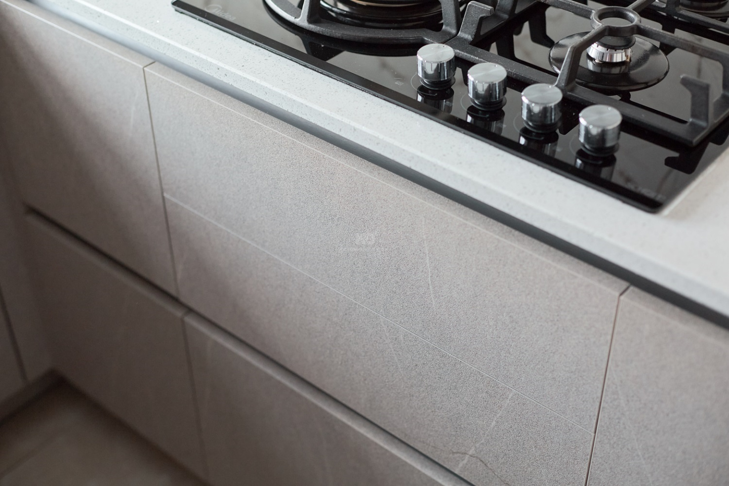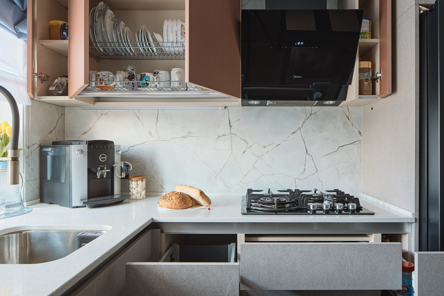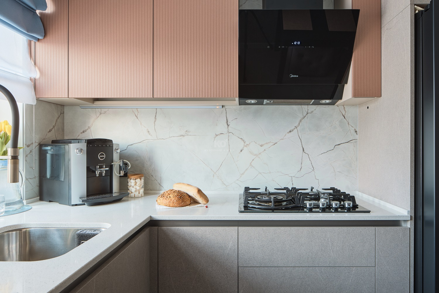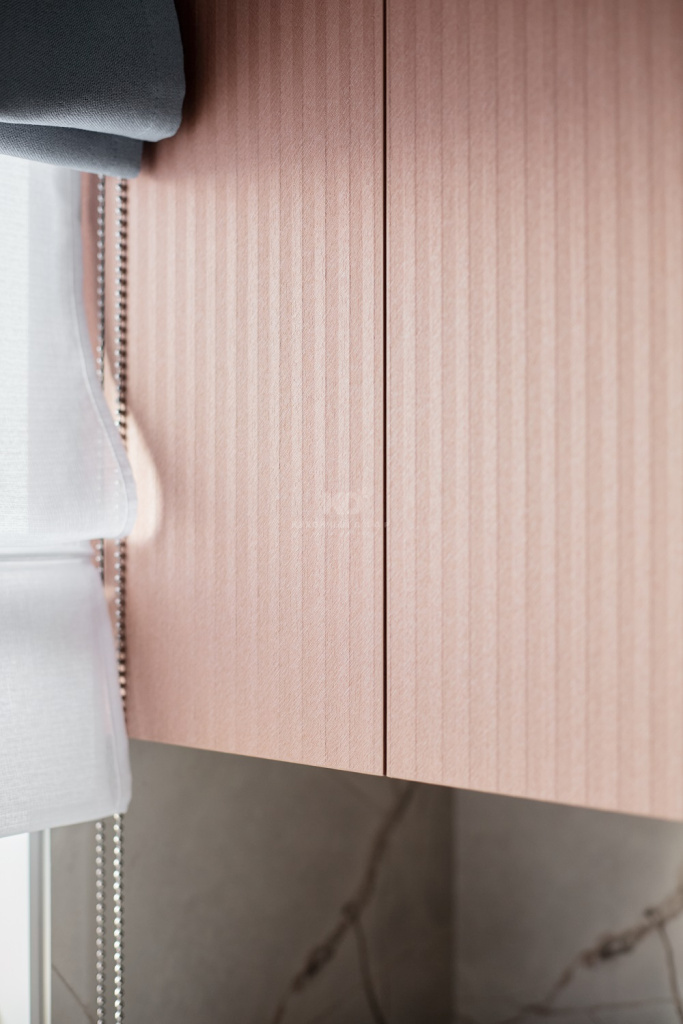 Нижние фасады песочного оттенка напоминают о скалистых пейзажах Санторини, о выветренных склонах и тёплых солнечных лучах, играющих на фактуре природного камня. Эти поверхности выглядят монолитно и благородно, при этом сохраняют мягкость благодаря матовой текстуре и тонким прожилкам, как у настоящего песчаника. Верхние медные шкафы добавляют южный акцент — эффект фрезеровки отсылает к колоннам древних афинских храмов, выгоревших на солнце.