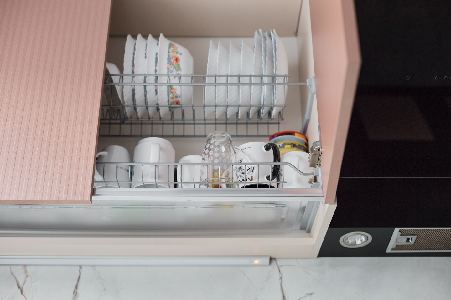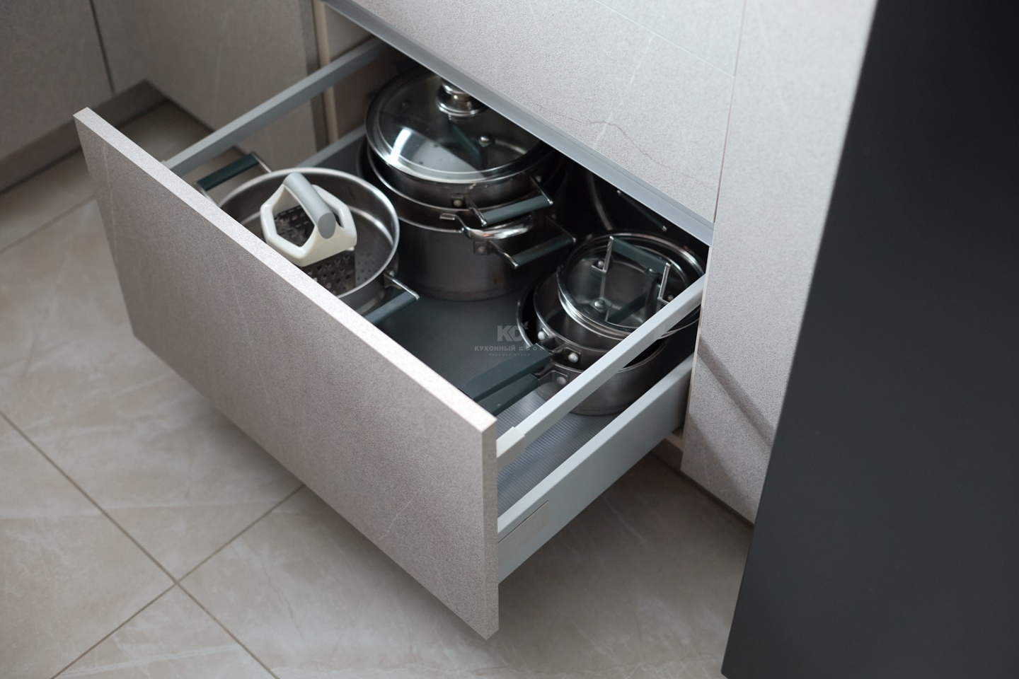 Чистота линий и визуальная легкость достигаются благодаря максимально удобной системе открывания без ручек Space Line — совсем без ручек. Только идеальные пропорции и чистые линии. Вся кухня оснащена фурнитурой DTC, обеспечивающей плавный ход и более 80 000 циклов открывания и закрывания.