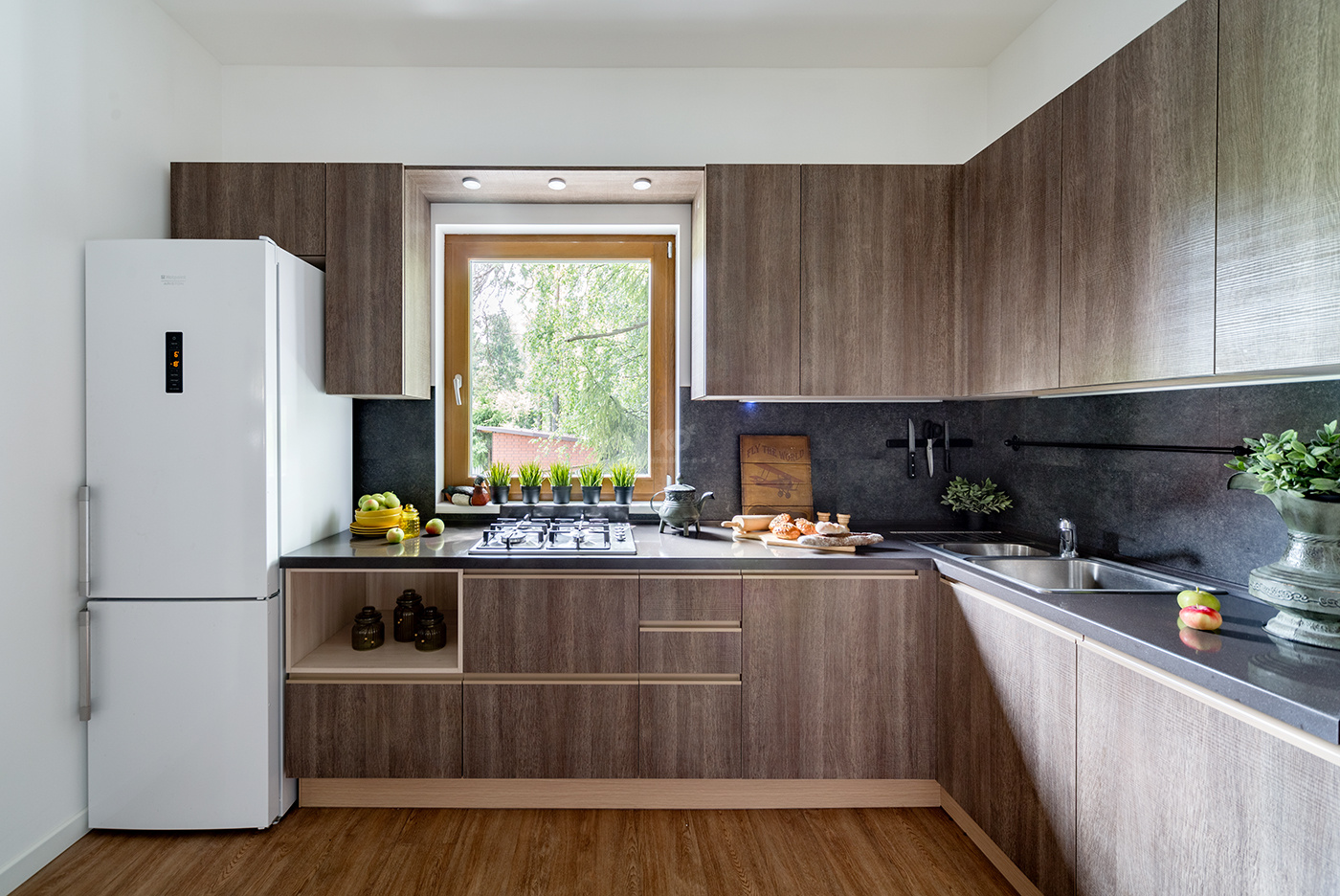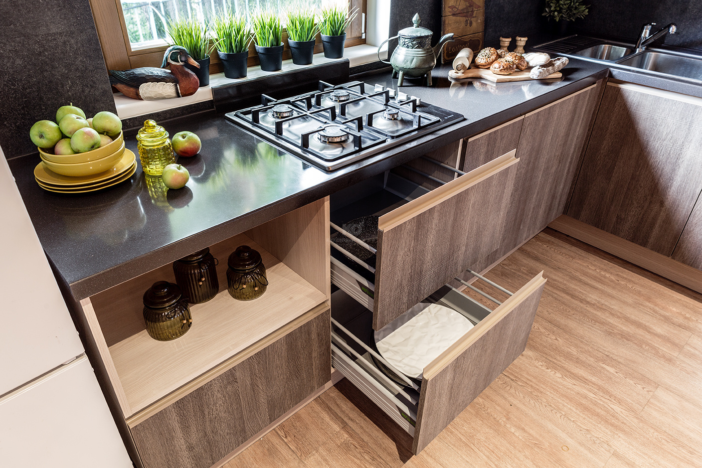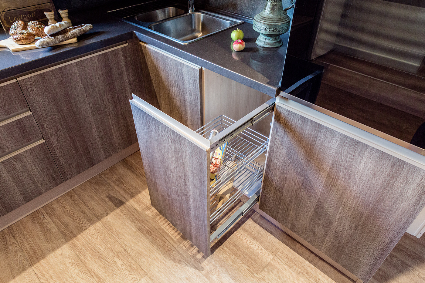Угловая компоновка кухни позволила нашим дизайнерам соблюсти все правила эргономики и создать удобный «рабочий треугольник». Также кухню наполнили современной встраиваемой техникой и множеством удобных аксессуаров. Гарнитур Антона был оснащен современными выдвижными системами хранения продуктов и утвари. Благодаря ним свое место внутри кухни есть и у тяжелых кастрюль, и у мелких столовых приборов. Здесь всё всегда находится под рукой!