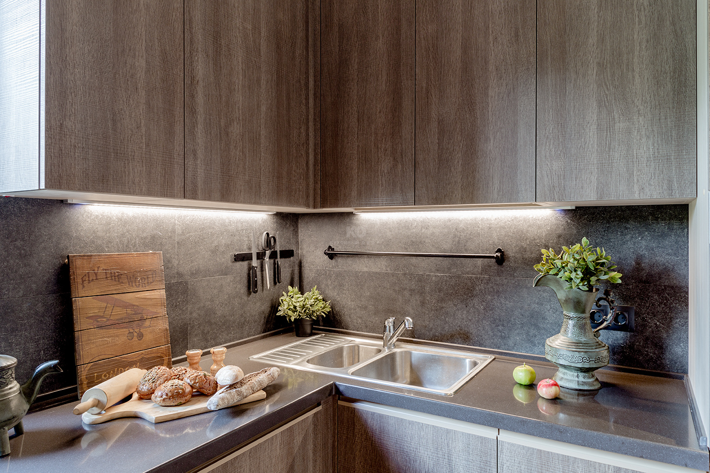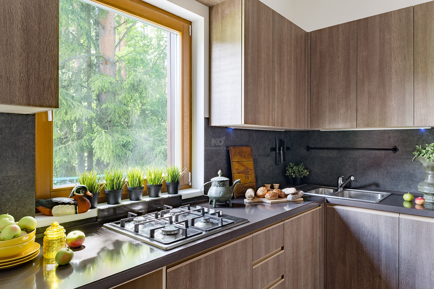 Практичность, долговечность, красота и высокие эксплуатационные характеристики – вот, что искал Антон в первую очередь. Вне телеэкрана он остался верен себе, сделав ставку на стильный и эргономичый гарнитур «Ноа». Фасады этой модели выполнены из экомассива – особого материала, состоящего из спрессованного пластика и древесного сырья. Экомассив не только выглядит и «чувствуется», как натуральное дерево. Он соответствует самому высокому классу экологической безопасности Е1, что подтверждено международным Сертификатом соответствия. Это делает кухню абсолютно безопасной для длительного использования.