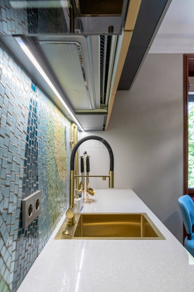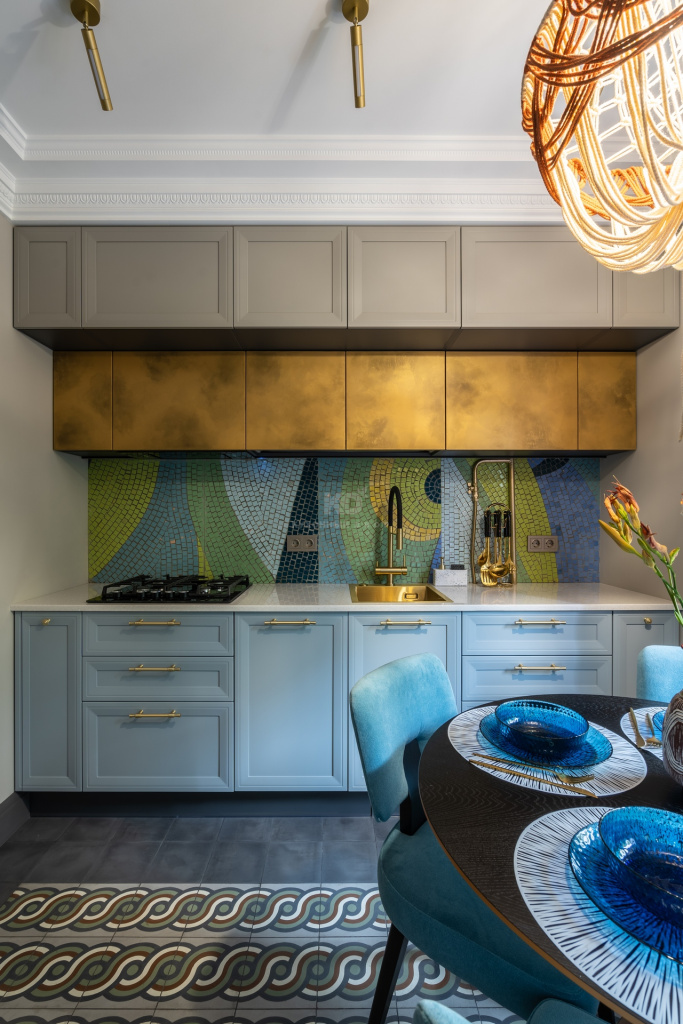 - Смешивает цвета. Обычно в одном помещении не желательно совмещать больше трёх цветов. Здесь же соединилось пятнадцать: светло серый, серо-бежевый, светлый антрацит, латунь и белый в самом кухонном гарнитуре, пять цветов – в фартуке-мозаике и пять цветов – в интерьере. У проекта очень богатая, сложная, и при этом безупречно сбалансированная колористика.