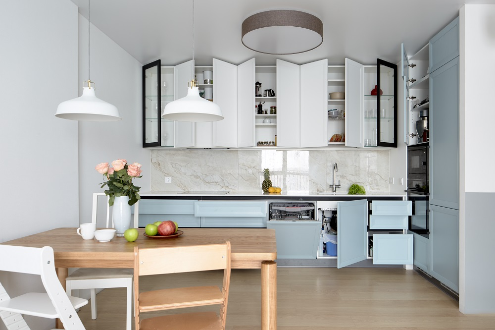 Светлые интерьеры, которые дышат уютом – мечта многих хозяек. Всегда приятно осуществить такую мечту с должным стилем и изяществом! Работая над этим проектом, специалисты КД получили огромное удовольствие, ведь здесь в одной кухне воплотились практически все актуальные тренды.