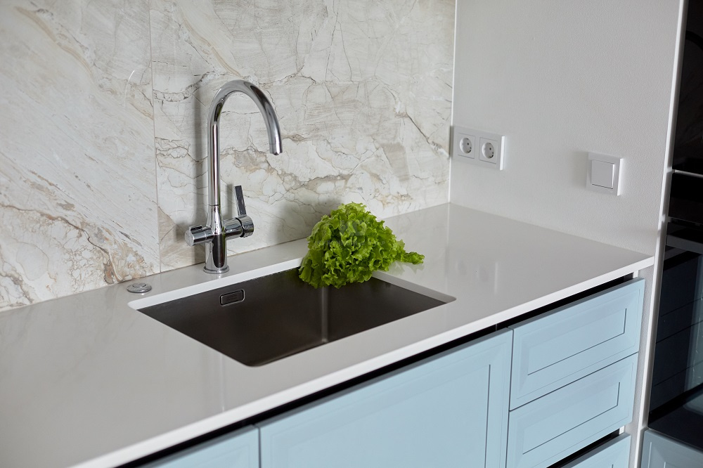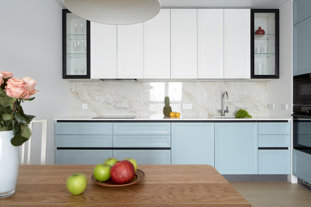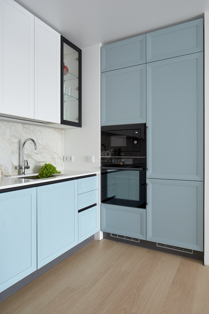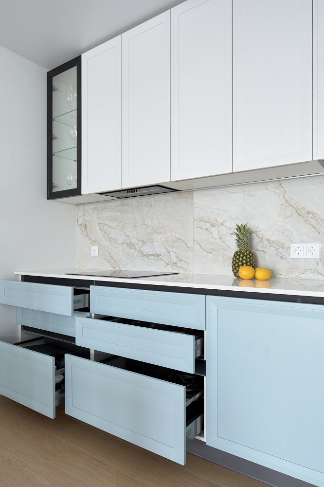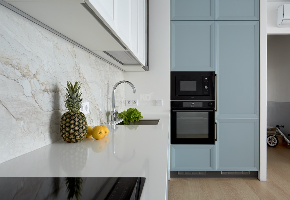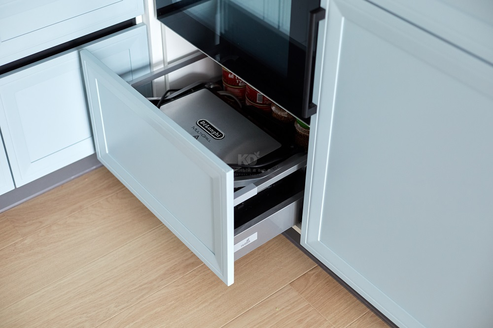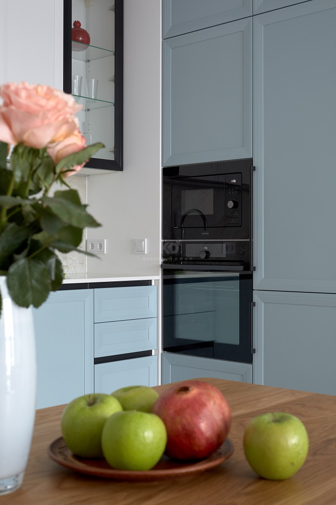 Один из главных – мода на нежное, и вместе с тем, эффектное сочетание оттенков. В этой «Патриции» прекрасно скомбинированы белый и голубой цвета. А подчёркнута эта небесная палитра грамотным добавлением чёрных акцентов. Вы наблюдаете их в технике, а также в алюминиевых рамках застеклённых зон и в ручках-профилях системы открывания «Спейс Лайн». Система «Спейс Лайн, к слову, не только придаёт гарнитуру выразительности, но и визуально «приподнимает» столешницу, делая её изящной и утончённой.